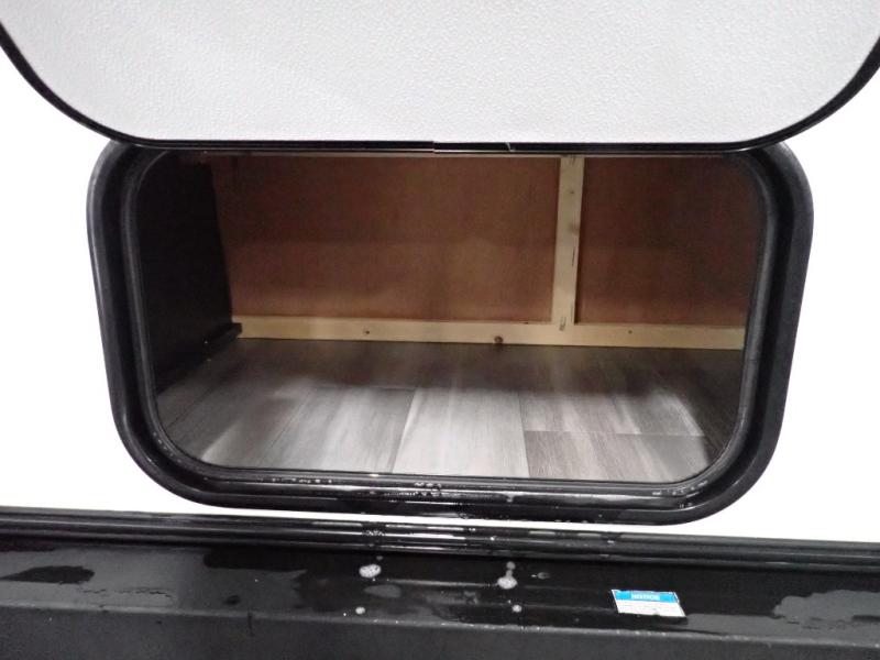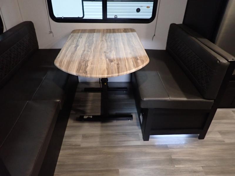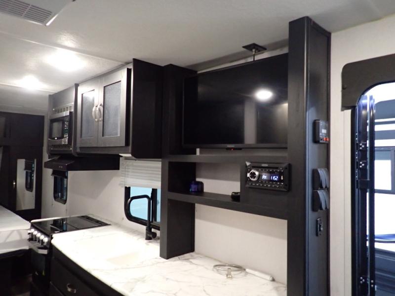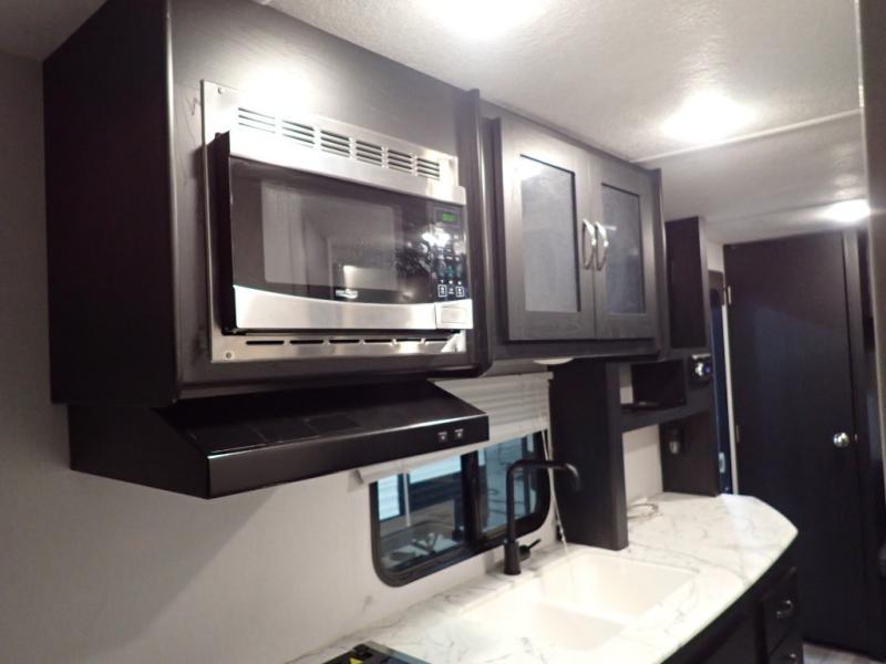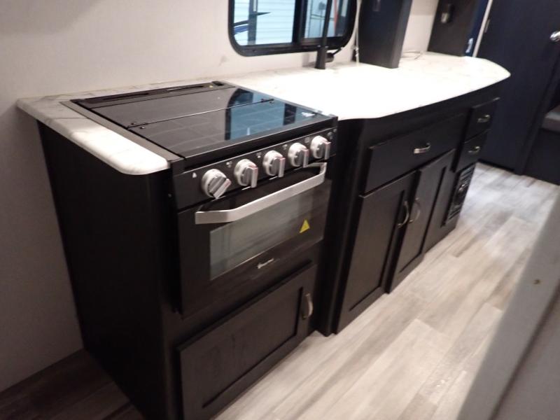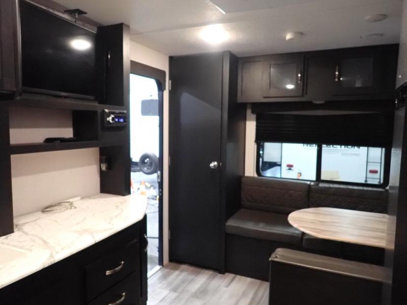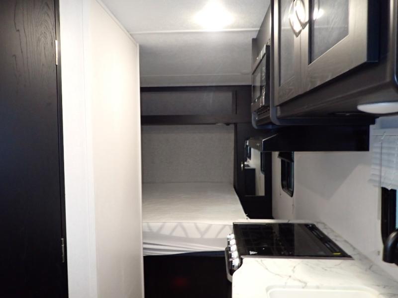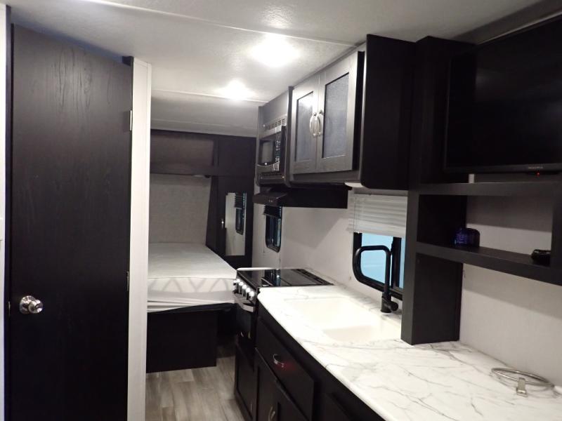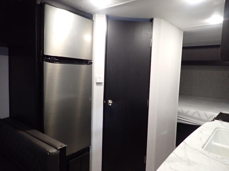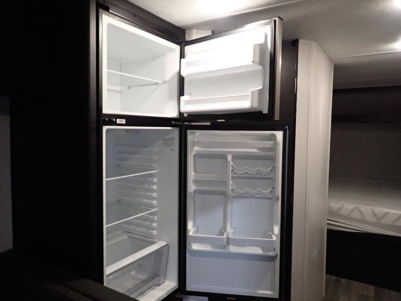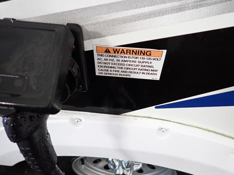 You will feel right at home in this cozy travel trailer that can sleep three to four each night. The front bedroom includes a comfortable walk-around queen bed and dual wardrobes to keep your clothes tidy. If you have any guests, they can sleep on the L-shaped dinette when it's not being used to dine at. Meals can be prepared on the three burner cooktop or in the microwave oven, and your perishables will stay fresh in the double door refrigerator. This model also includes a 32" TV to keep up on your favorite shows, and there is a convenient pantry below the TV to keep snacks and dry goods.