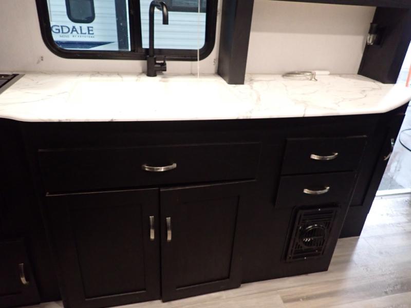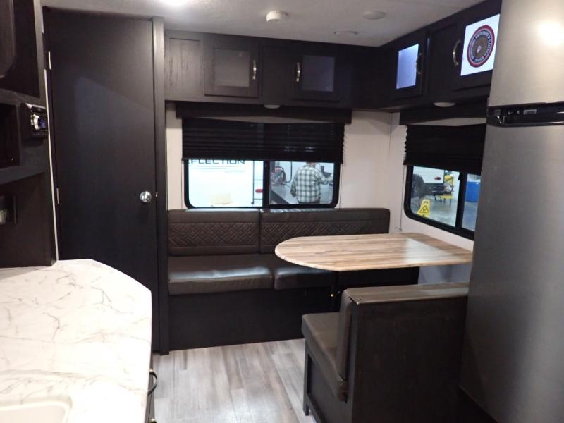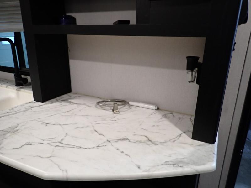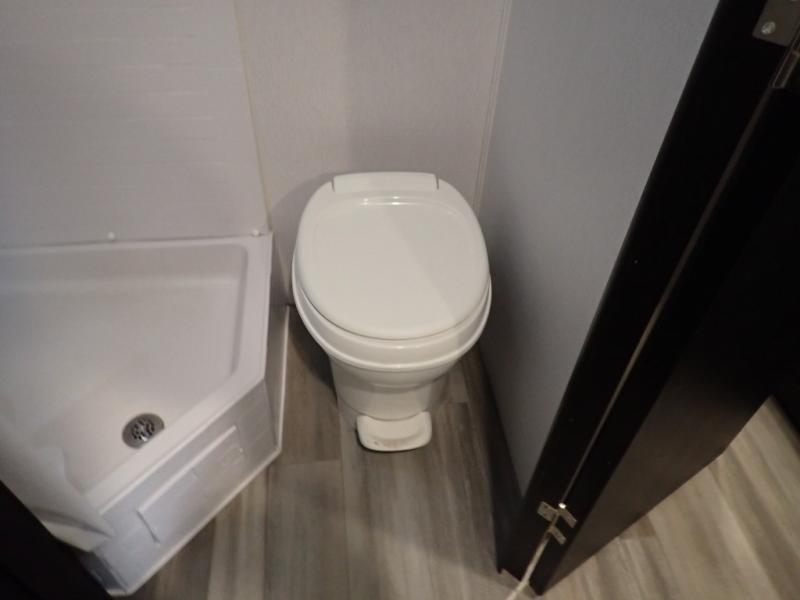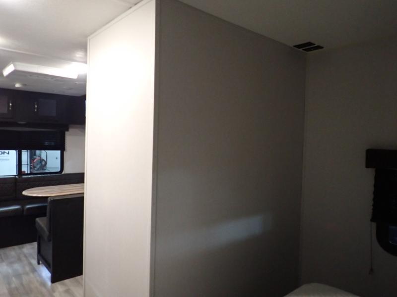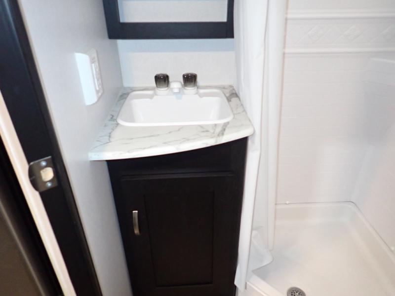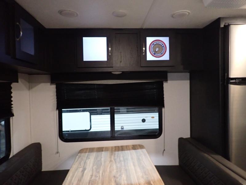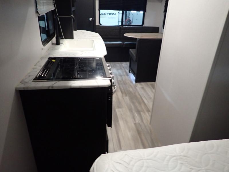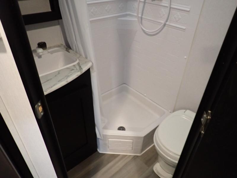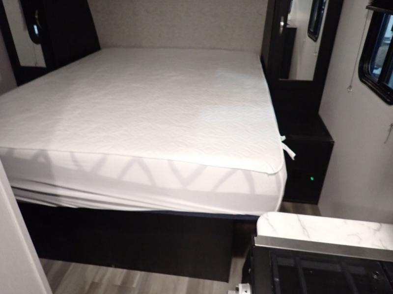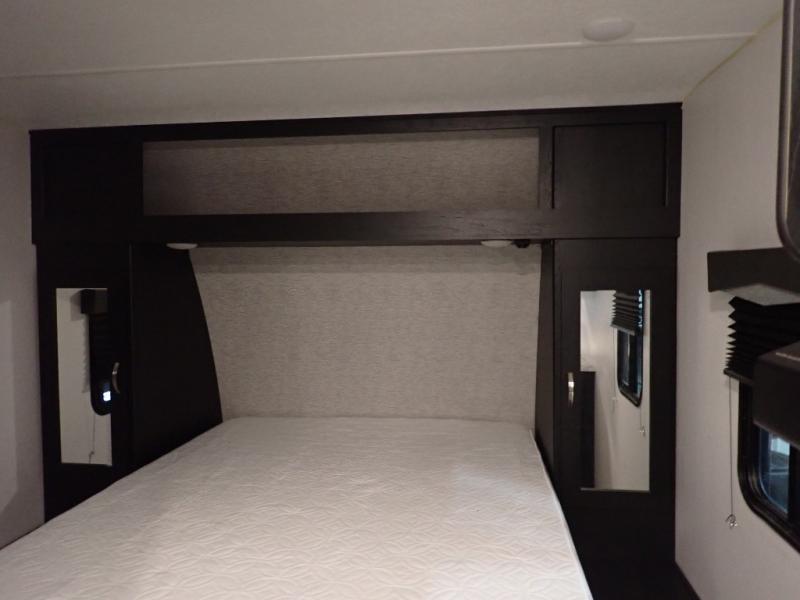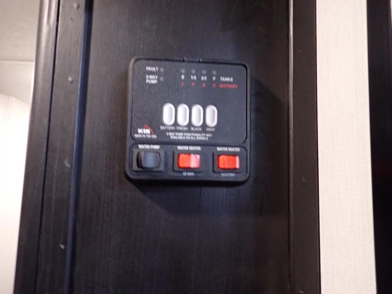 You will feel right at home in this cozy travel trailer that can sleep three to four each night. The front bedroom includes a comfortable walk-around queen bed and dual wardrobes to keep your clothes tidy. If you have any guests, they can sleep on the L-shaped dinette when it's not being used to dine at. Meals can be prepared on the three burner cooktop or in the microwave oven, and your perishables will stay fresh in the double door refrigerator. This model also includes a 32" TV to keep up on your favorite shows, and there is a convenient pantry below the TV to keep snacks and dry goods.