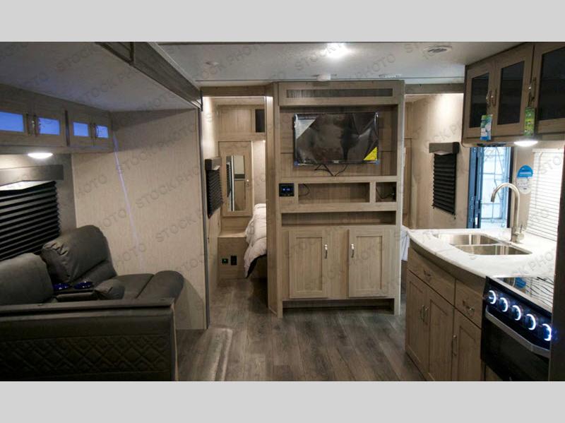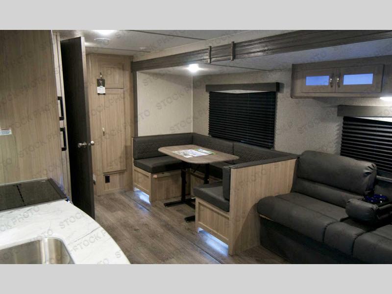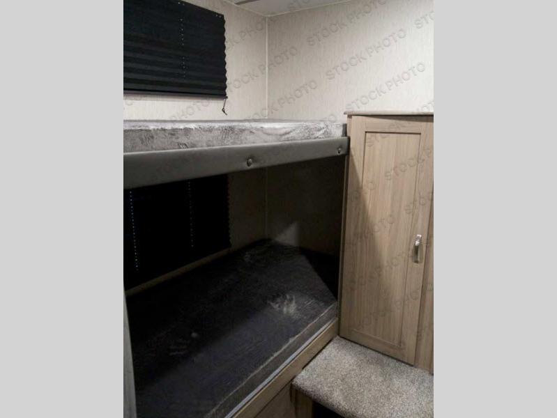 Whole-family fun is waiting for you in this spacious travel trailer. The kids or your guests will love the private bunkhouse with four bunks, plus a wardrobe with a countertop to keep their things. You will enjoy the front private bedroom with a walk-around queen bed and dual wardrobes, and if you have any other guests, they can sleep on the sofa or U-shaped dinette within the large slide out. The kitchen includes everything needed to prepare meals each day, including a microwave oven, a three burner cooktop, and a double door refrigerator. This model also includes a pass-through storage, plus additional exterior storage to bring along hiking gear, fishing poles, and camp chairs!
