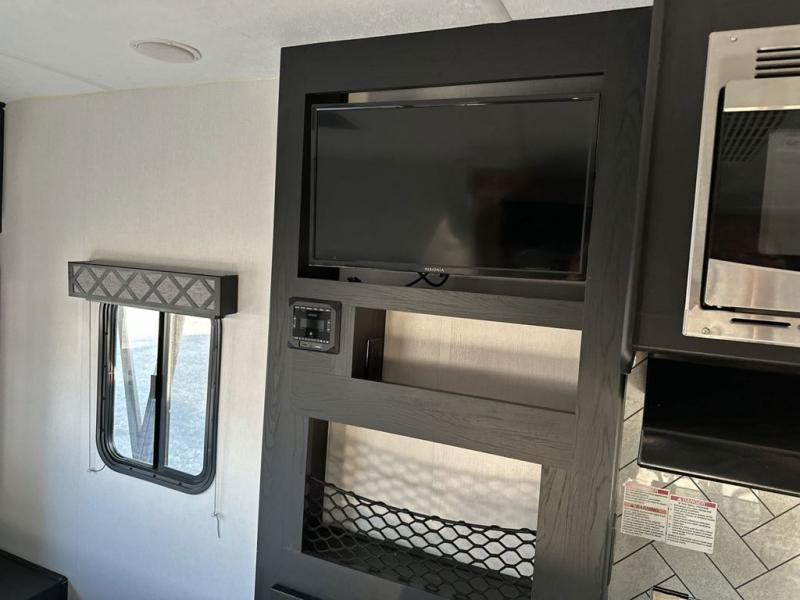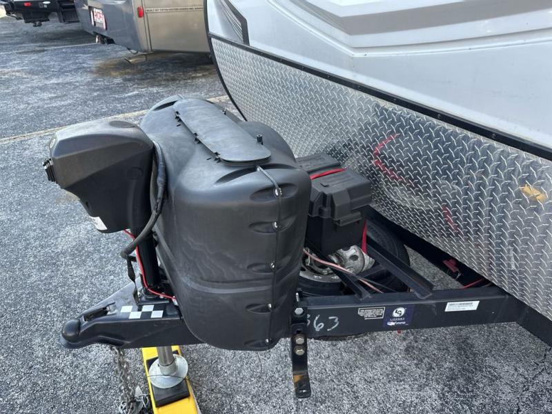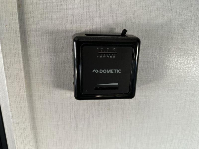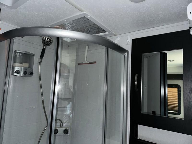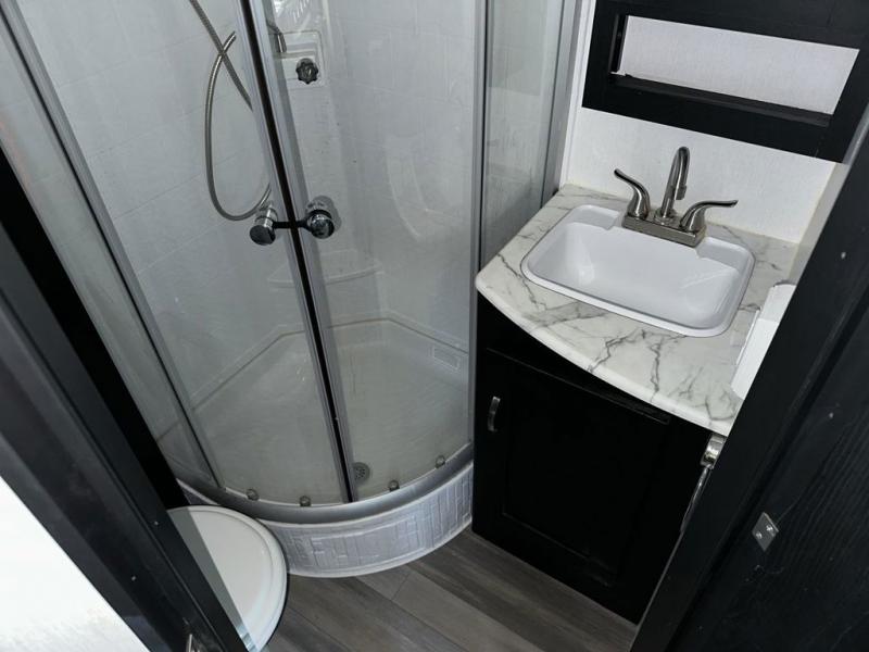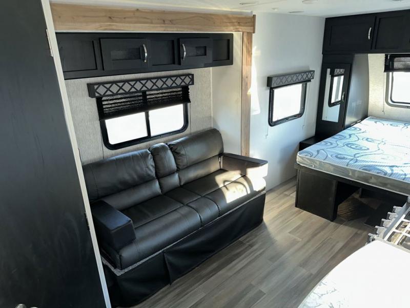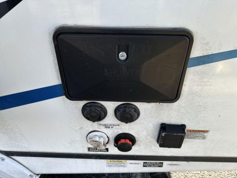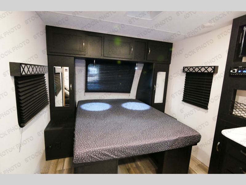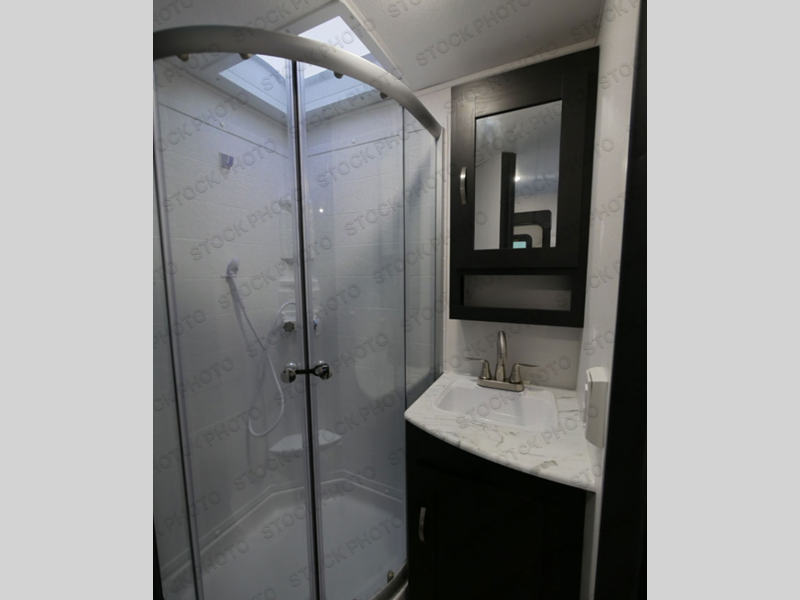 This is the perfect couple's trailer to take to the lake every other weekend. You will enjoy your own queen bed up front that includes vaulted under-bed storage for your luggage. The sofa slide out with a free-standing table provides a place to relax and dine together, and if you have an overnight guest, they can sleep here. The chef can prepare meals on the three burner cooktop or in the microwave oven, and there is a dual basin American stonecast sink for easy clean up. This model also includes a full bath with a linen closet for clean towels, and a 32" radius shower with a skylight for more standing space.
