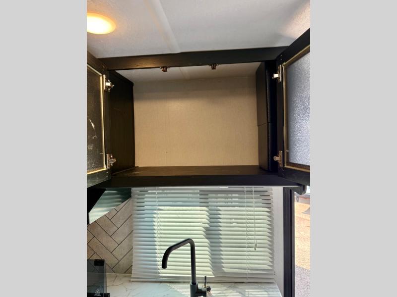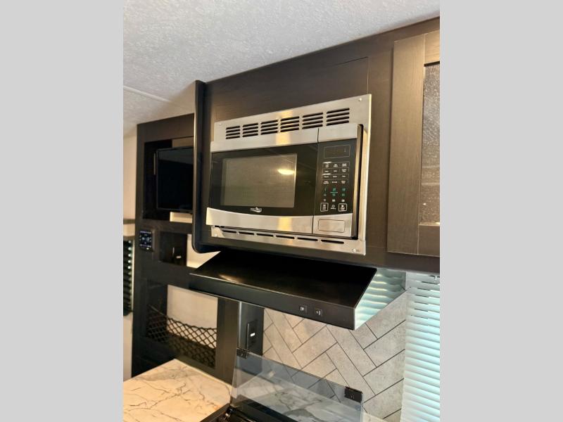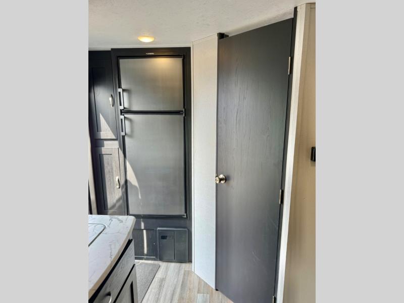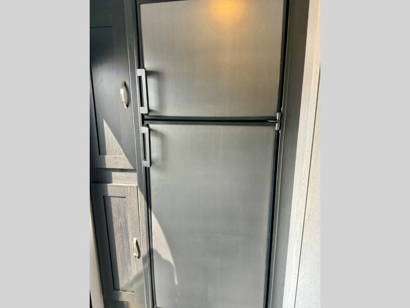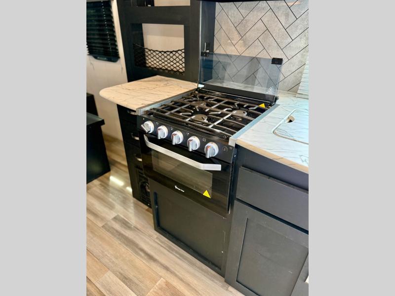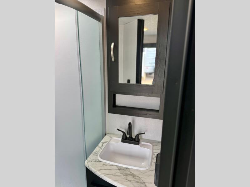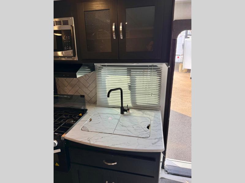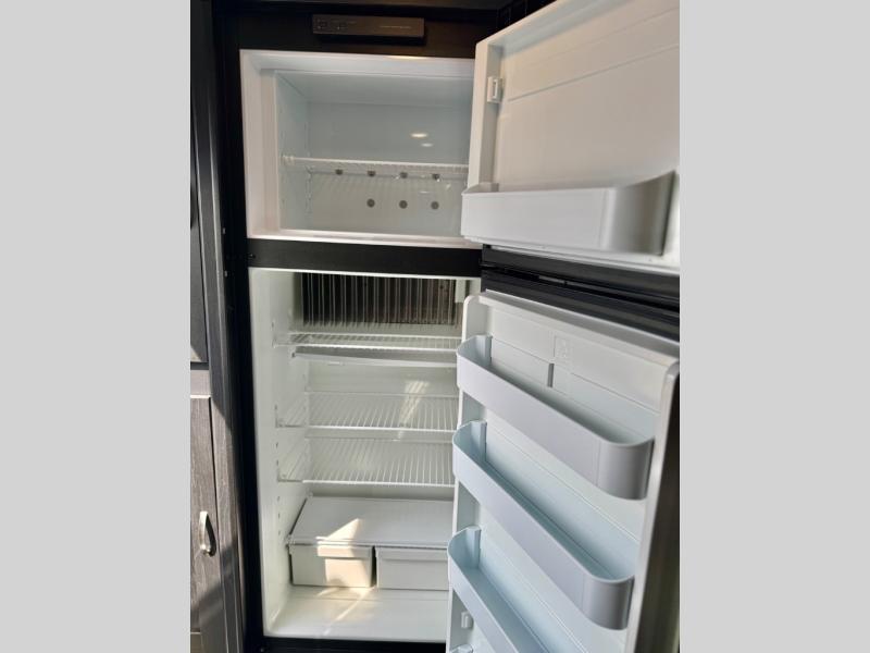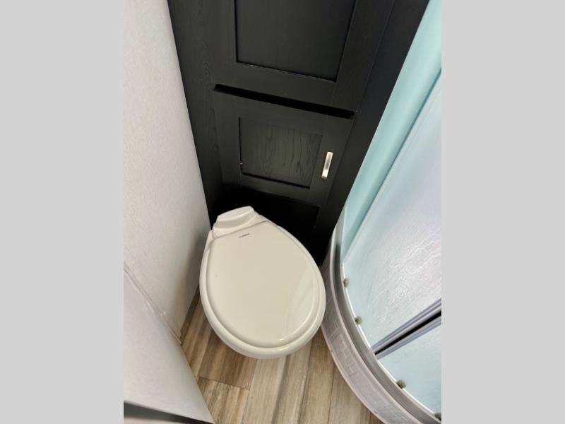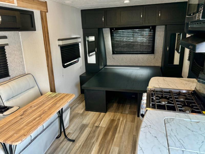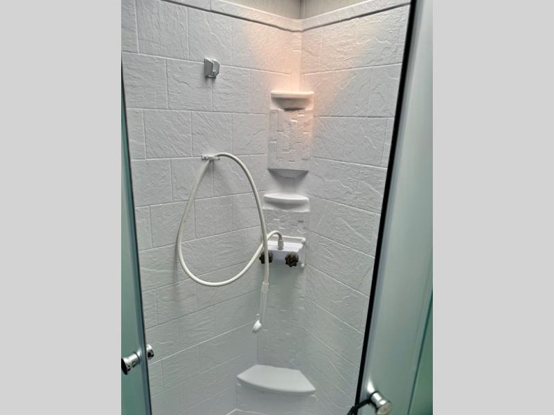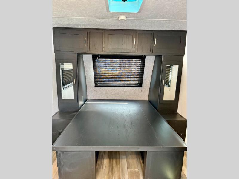 This is the perfect couple's trailer to take to the lake every other weekend. You will enjoy your own queen bed up front that includes vaulted under-bed storage for your luggage. The sofa slide out with a free-standing table provides a place to relax and dine together, and if you have an overnight guest, they can sleep here. The chef can prepare meals on the three burner cooktop or in the microwave oven, and there is a dual basin American stonecast sink for easy clean up. This model also includes a full bath with a linen closet for clean towels, and a 32" radius shower with a skylight for more standing space.