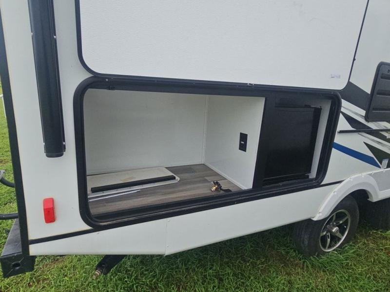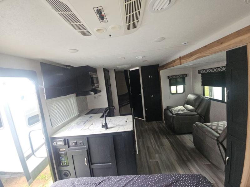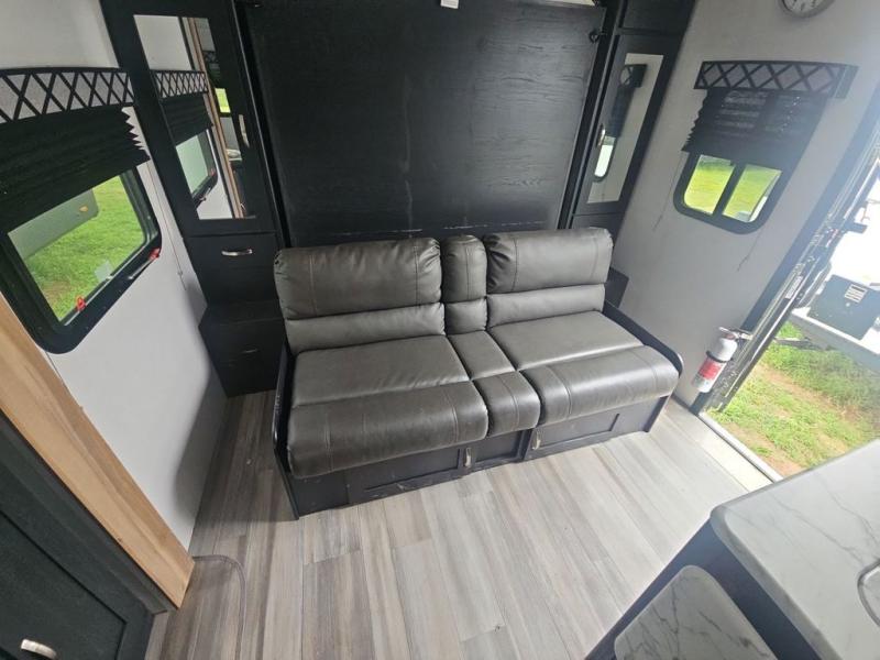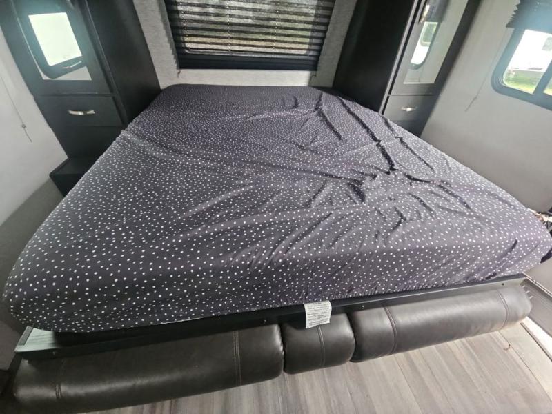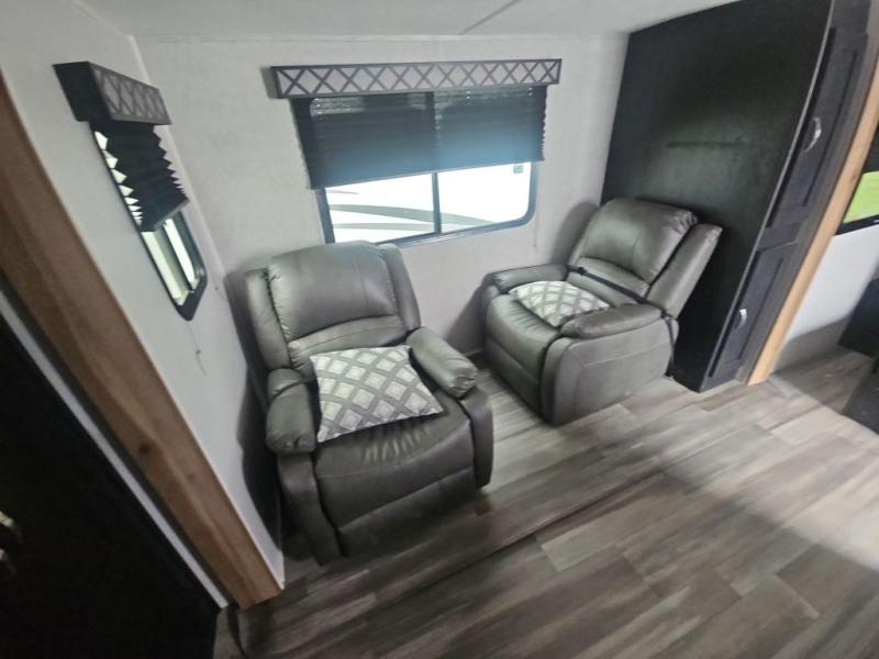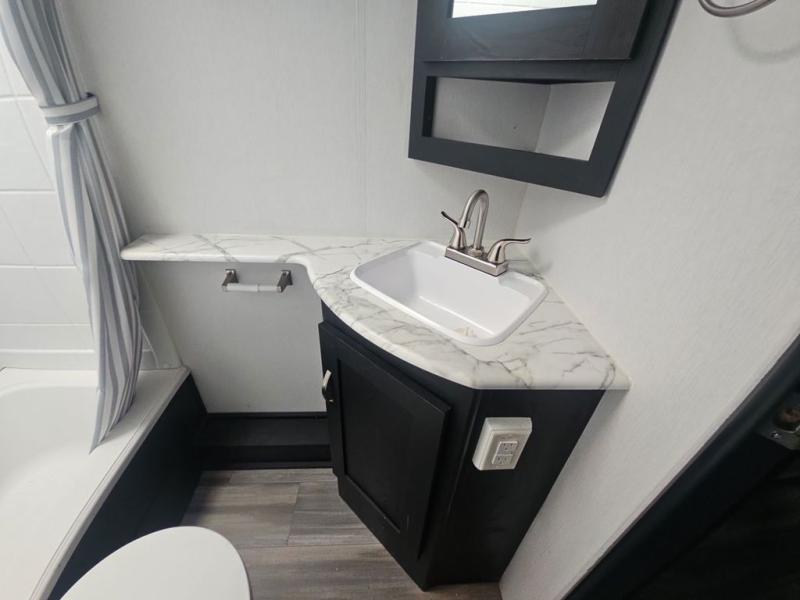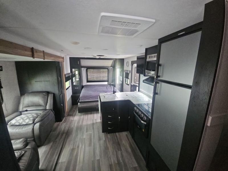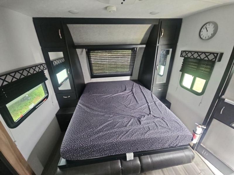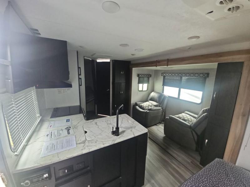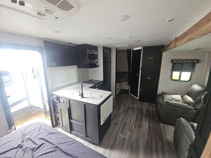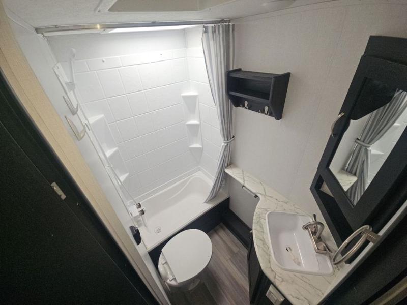 You can comfortably sleep eight in this travel trailer thanks to the double-size bunks, the U-shaped dinette, and the queen Murphy bed. You can cook breakfast for everyone on the pull-out camp kitchen before you head out for the day, and don't forget the fishing poles from the pass-through storage! This model includes a full bath with a tub/shower that will make bath time for the littles ones easier than ever. After everyone is cleaned up and dinner is put away, you may decide to make it a movie night with the LED TV!