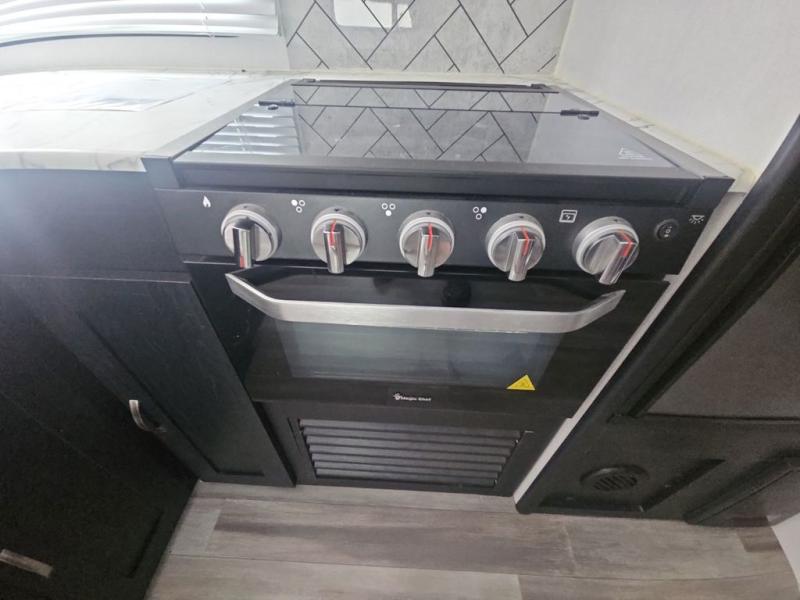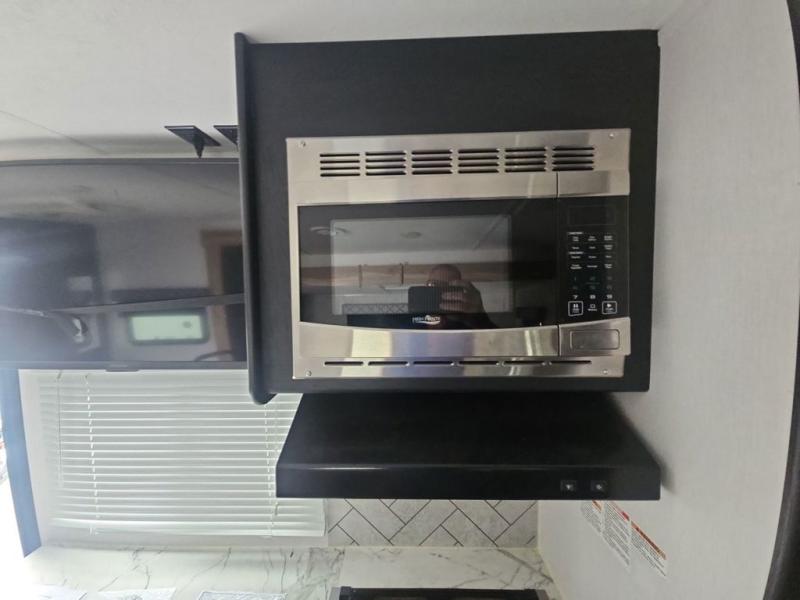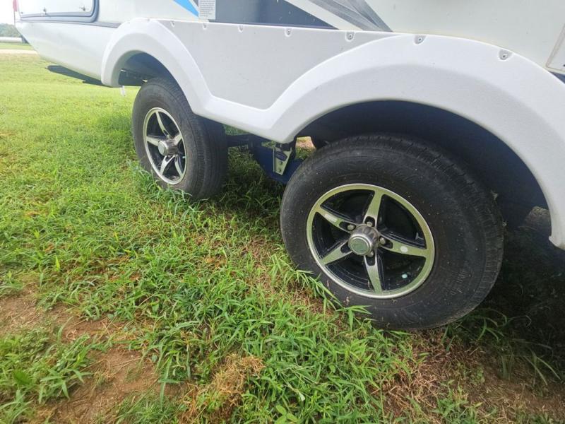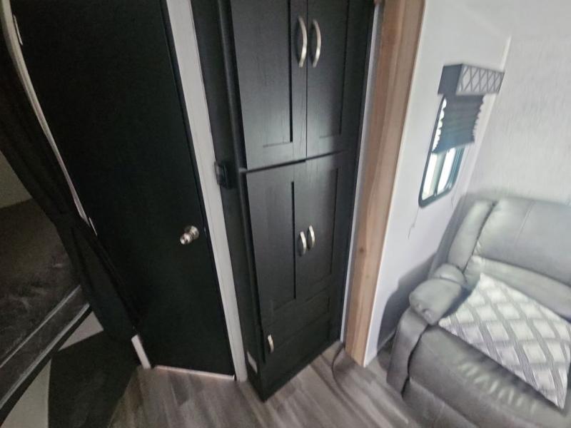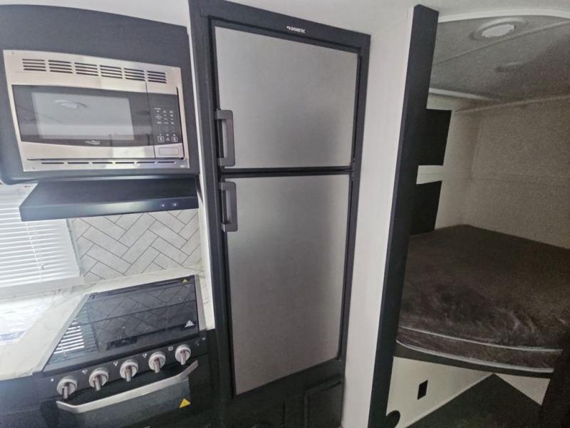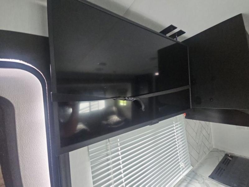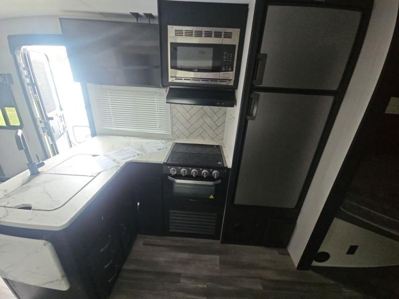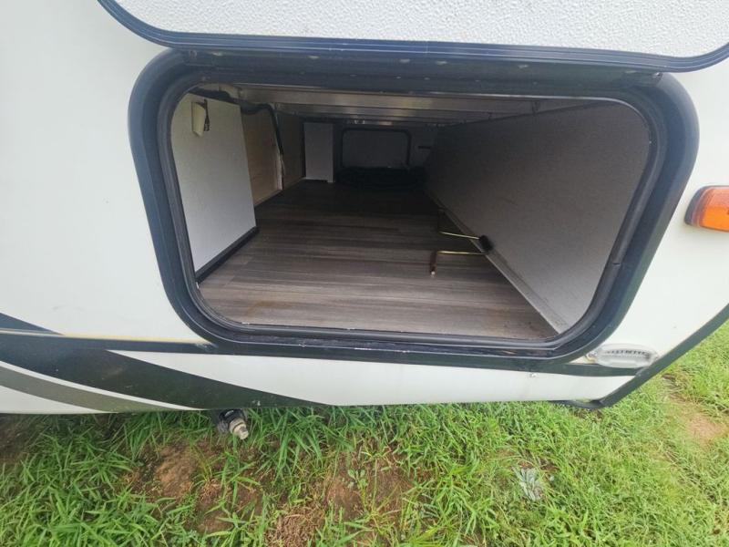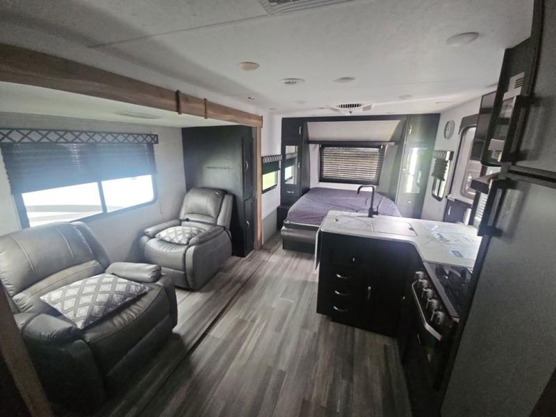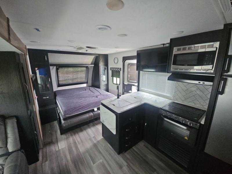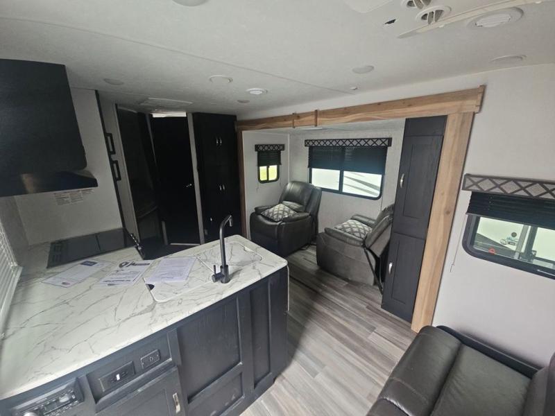 You can comfortably sleep eight in this travel trailer thanks to the double-size bunks, the U-shaped dinette, and the queen Murphy bed. You can cook breakfast for everyone on the pull-out camp kitchen before you head out for the day, and don't forget the fishing poles from the pass-through storage! This model includes a full bath with a tub/shower that will make bath time for the littles ones easier than ever. After everyone is cleaned up and dinner is put away, you may decide to make it a movie night with the LED TV!