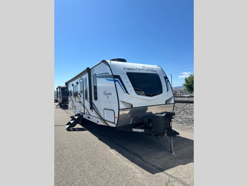 With any Freedom Express Ultra Lite travel trailer by Coachmen you will appreciate quality construction materials, such as vacuum bonded walls with Azdel composite, a 3/4 gel coated fiberglass cap with an automotive glass windshield, and a heated enclosed underbelly. Each model also features Tufflex PVC roofing, front diamond plate, and E-Z Lube axles for smooth towing. You'll find Carefree flooring indoors, as well as night shades, a dual basin American stonecast sink, and hidden hinge cabinetry. The power tongue jack included with the Ultra Lite Express Pack will make set-up a breeze, and each model includes back-up camera prep and they are Freedom solar ready if you plan to go off-grid. Enjoy lightweight camping with a Freedom Express Ultra Lite travel trailer today!