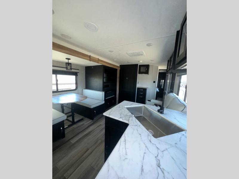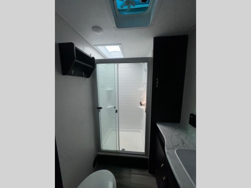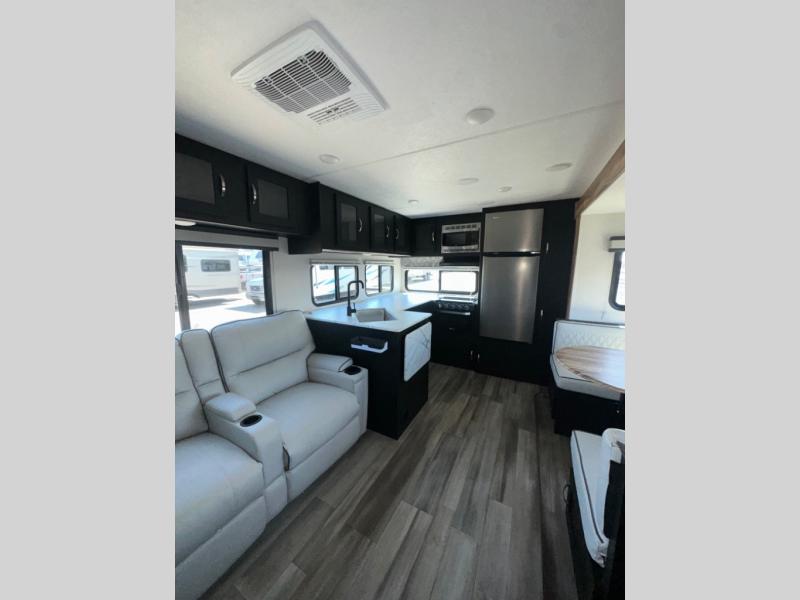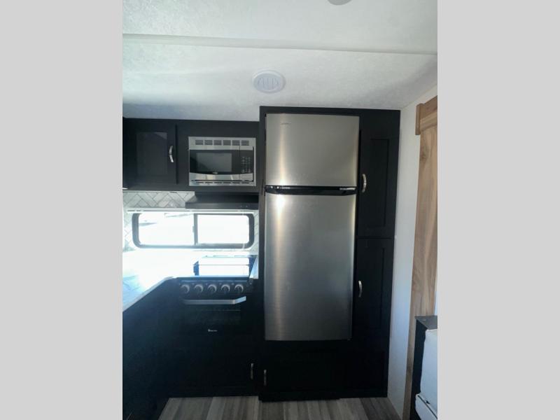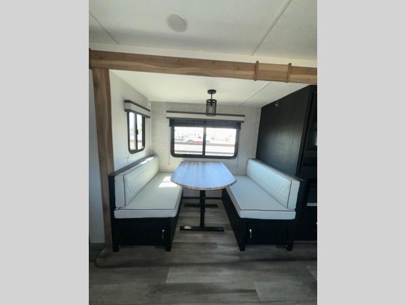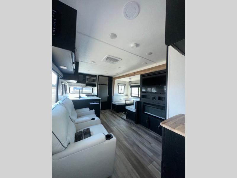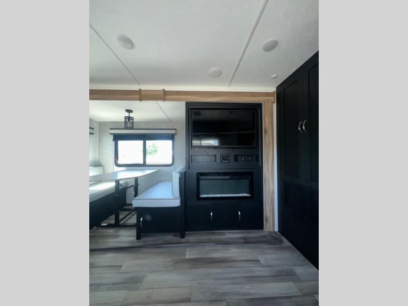 Are you looking for a travel trailer that will feel more like home? Look no further than this model that features a private bedroom up front, a full bath, plus a spacious rear kitchen. You will love to relax on the theatre sofa/hide-a-bed sofa across from the LED TV and fireplace, and there is a booth dinette for dining. If the weather is nice you may just want to sit outdoors under the 20' power awning with LED lights. The chef of your group can prepare a meal on the pull-out camp kitchen, and the kids can grab their scooters from the pass-through storage.