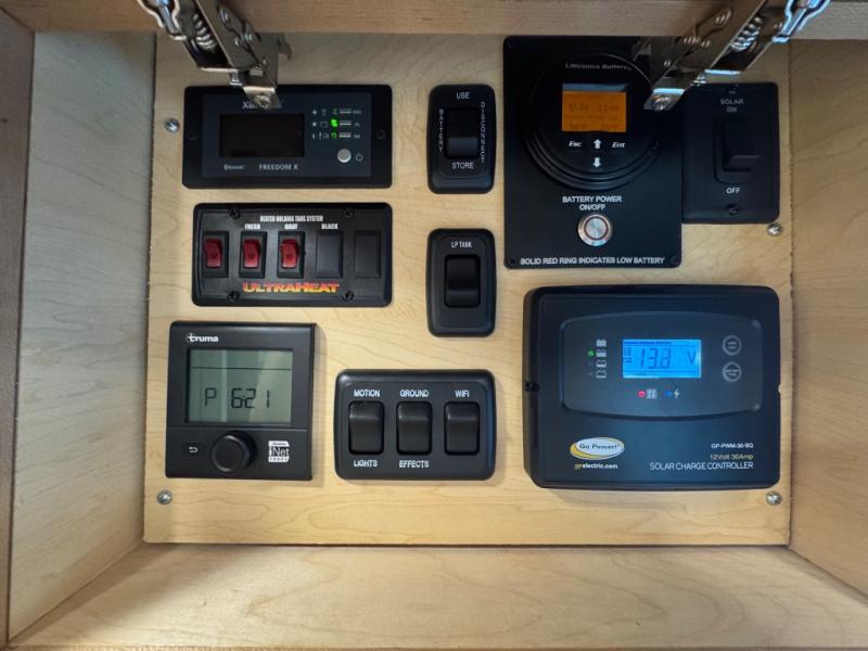 Touchscreen control panel for lights, tank levels, climate, and power management.