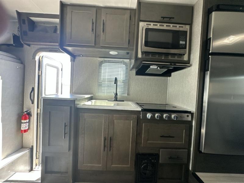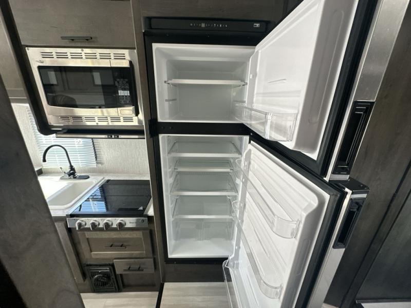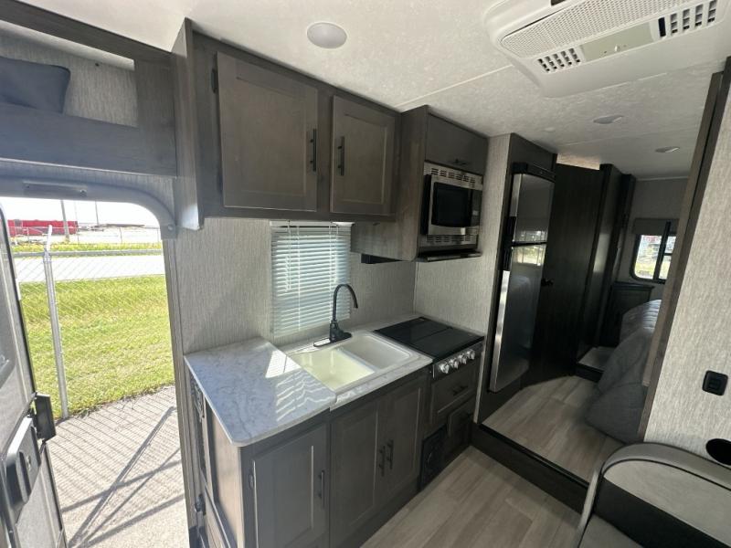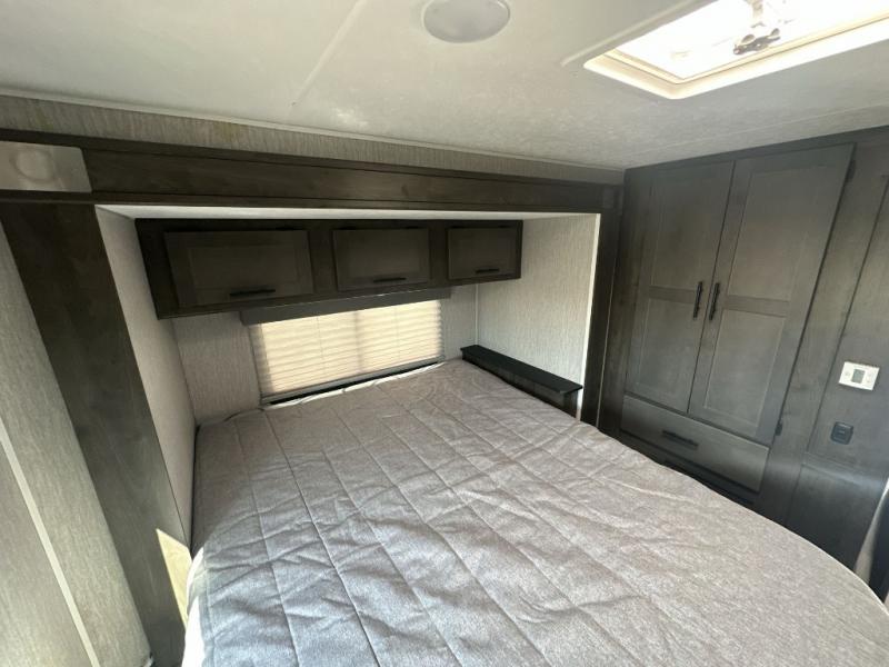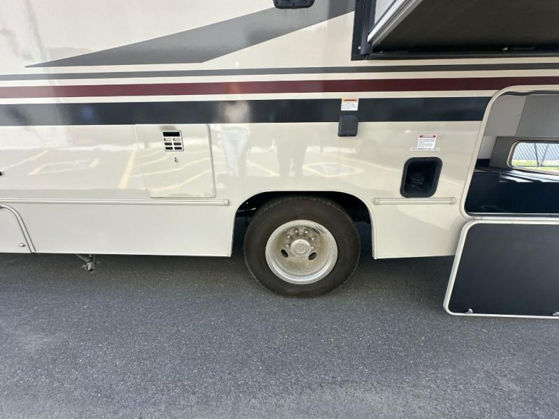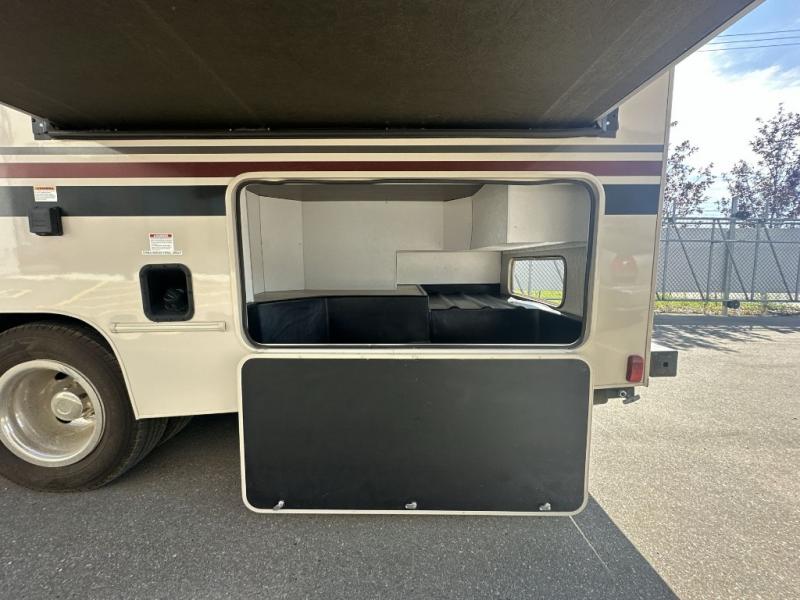 Head to the lake or woods in this comfortable motorhome that can sleep five to six people each night. Once you arrive at your destination, prepare lunch on the three burner cooktop or use the residential-size microwave. When you are ready for bedtime, you will find a queen bed slide for yourself, a bunk above the cab that the kids will surely love, and the J-lounge that can double as sleeping space if needed. There is even an 18" extension on the J-lounge for more dining space. The full bath will allow you to freshen up each day just like you do at home, and the shower skylight will let natural light stream in!