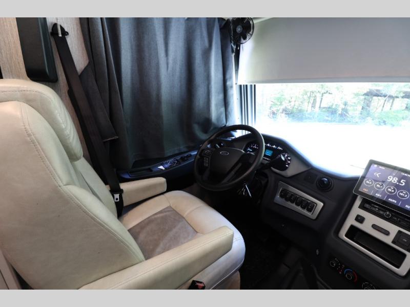 Ease of Driving & Setup: Compact Class A length, Ford chassis with power steering, cruise control, and auto-leveling jacks simplify operation.