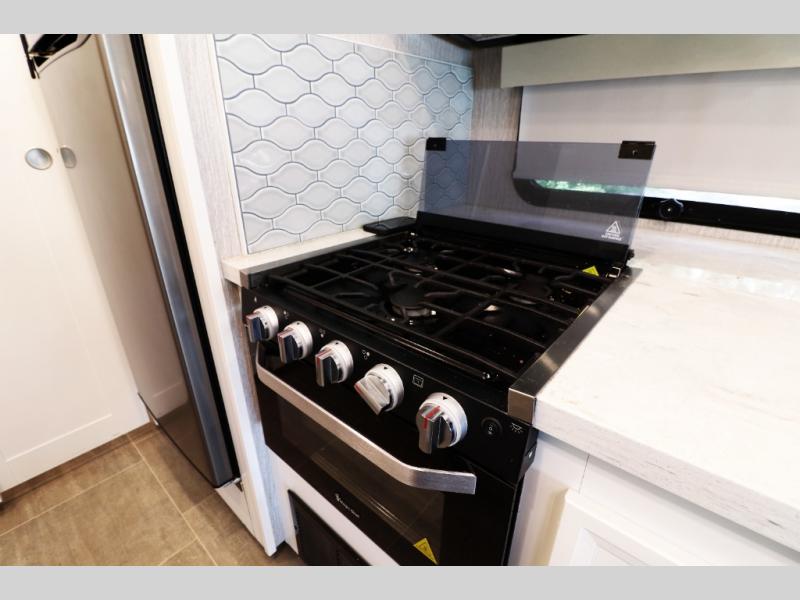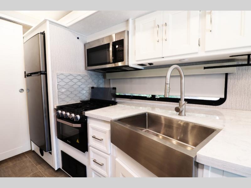 Solid surface kitchen countertops & farmhouse sink, tile backsplash, stainless 3-burner range, OTR microwave, and stainless residential refrigerator—designed for gourmet RV cooking.