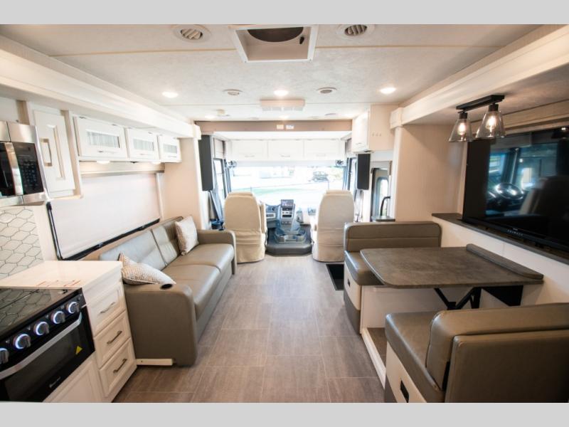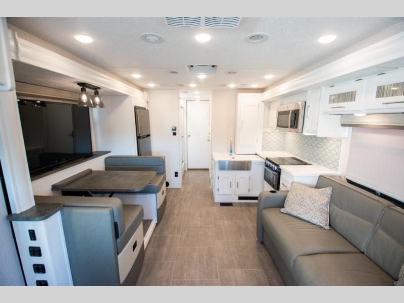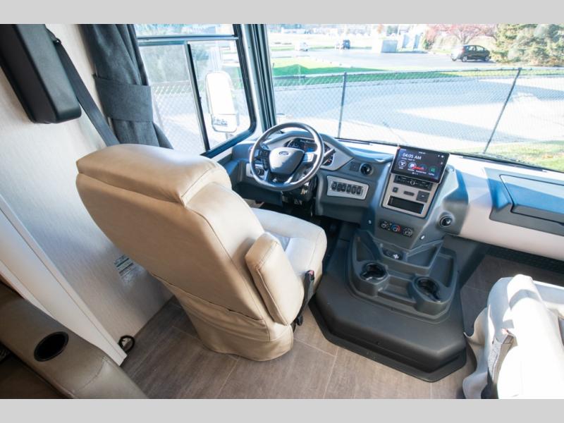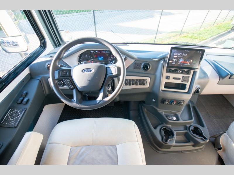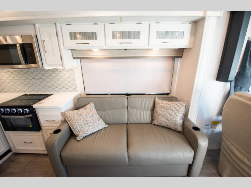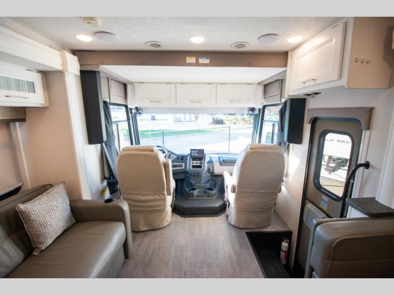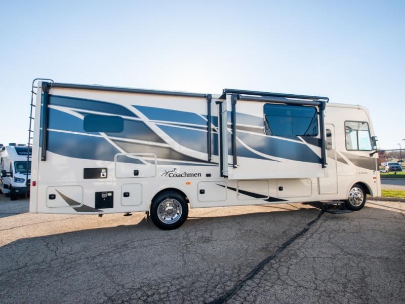 Each Mirada Class A gas motorhome by Coachmen is constructed with a crowned, laminated fiberglass roof with Azdel Superlite composite for added durability, along with high gloss "Oyster" gelcoat sidewalls. There is a 7.3L V8 engine on a Ford F53 chassis for power you can feel, and a 10" touch screen radio with AM/FM radio with Bluetooth capability. The 5.5 kW gas generator, dual coach batteries, and 100W solar panel with a controller will meet all your power needs, and the automatic leveling jacks make setting up camp a breeze. Head inside to find premium linoleum throughout, hardwood cabinet doors, kitchen tile backsplash, and solar privacy shades throughout to name a few comforts. The open road is yours for the taking in a Mirada Class A gas motorhome!