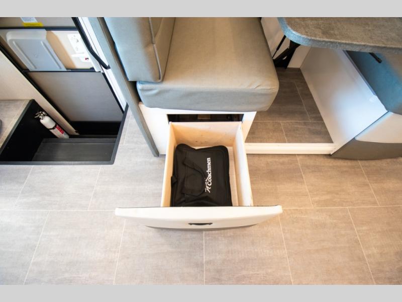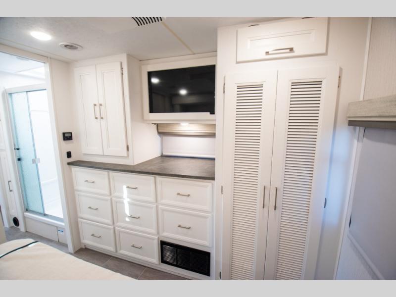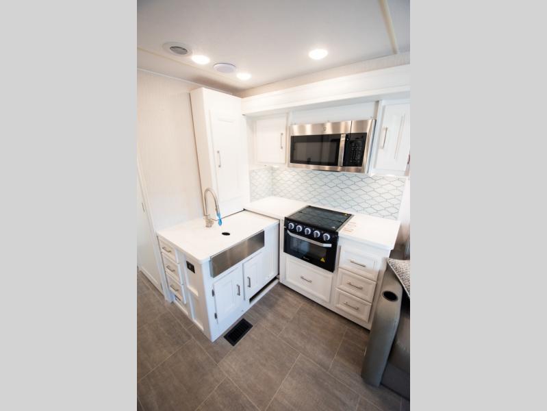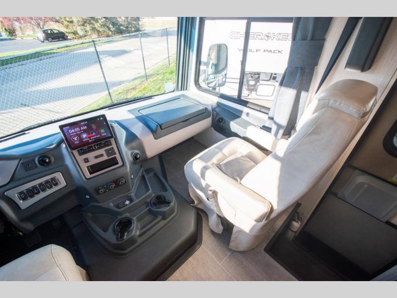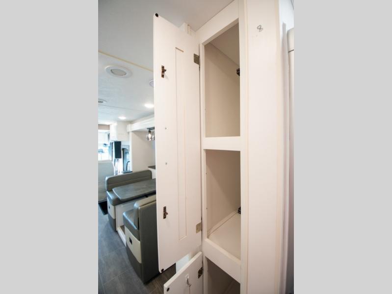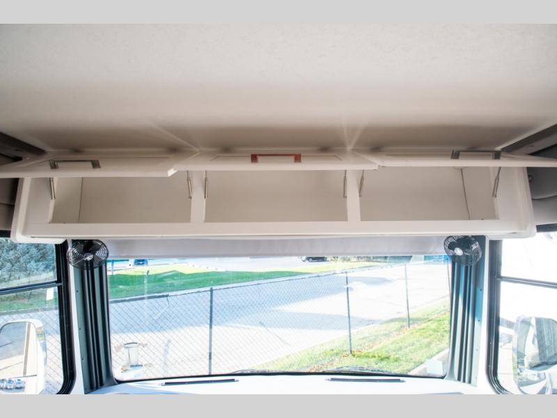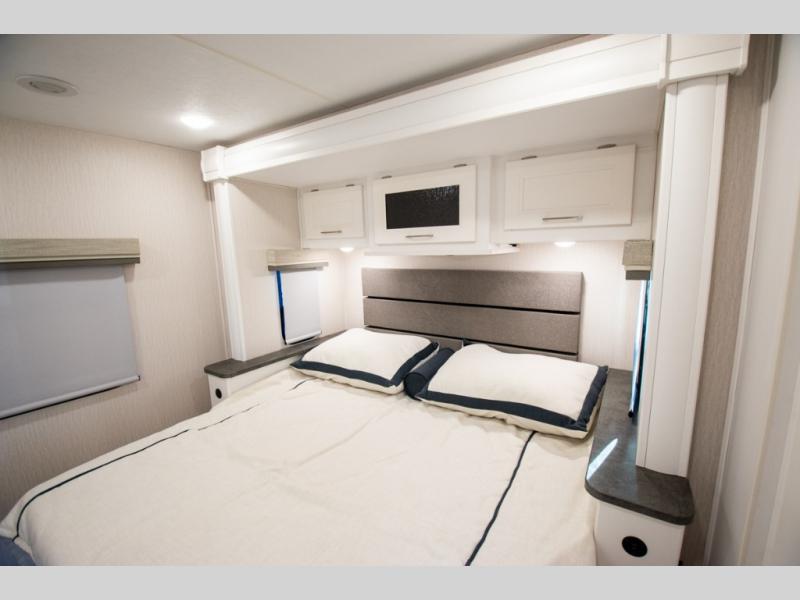 Each Mirada Class A gas motorhome by Coachmen is constructed with a crowned, laminated fiberglass roof with Azdel Superlite composite for added durability, along with high gloss "Oyster" gelcoat sidewalls. There is a 7.3L V8 engine on a Ford F53 chassis for power you can feel, and a 10" touch screen radio with AM/FM radio with Bluetooth capability. The 5.5 kW gas generator, dual coach batteries, and 100W solar panel with a controller will meet all your power needs, and the automatic leveling jacks make setting up camp a breeze. Head inside to find premium linoleum throughout, hardwood cabinet doors, kitchen tile backsplash, and solar privacy shades throughout to name a few comforts. The open road is yours for the taking in a Mirada Class A gas motorhome!