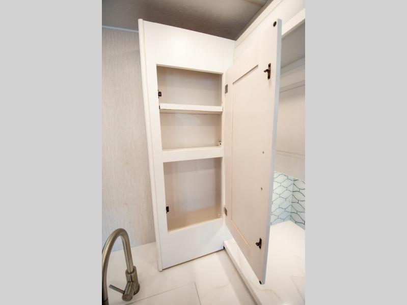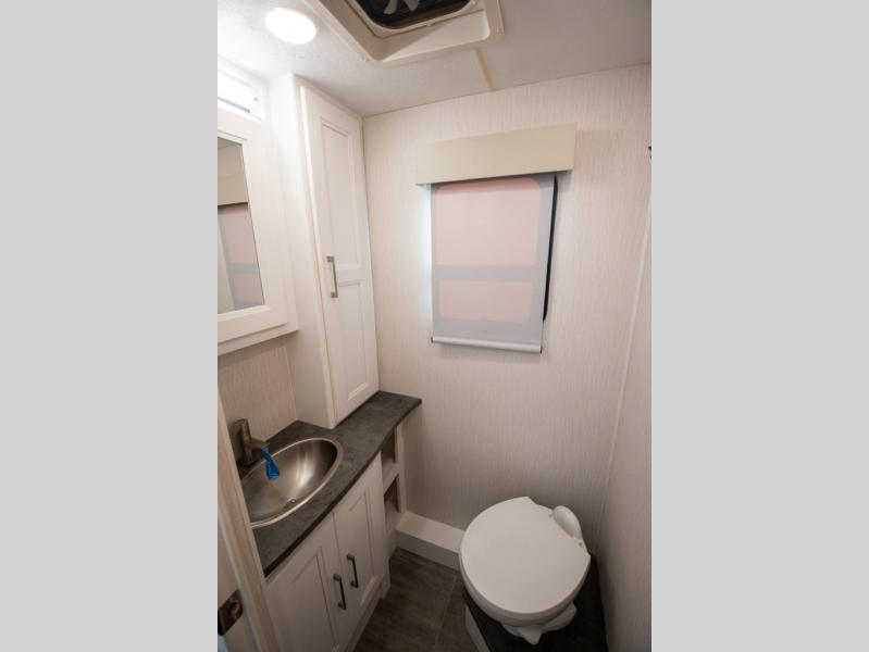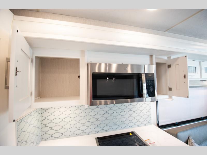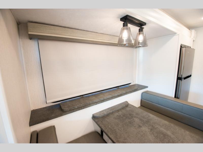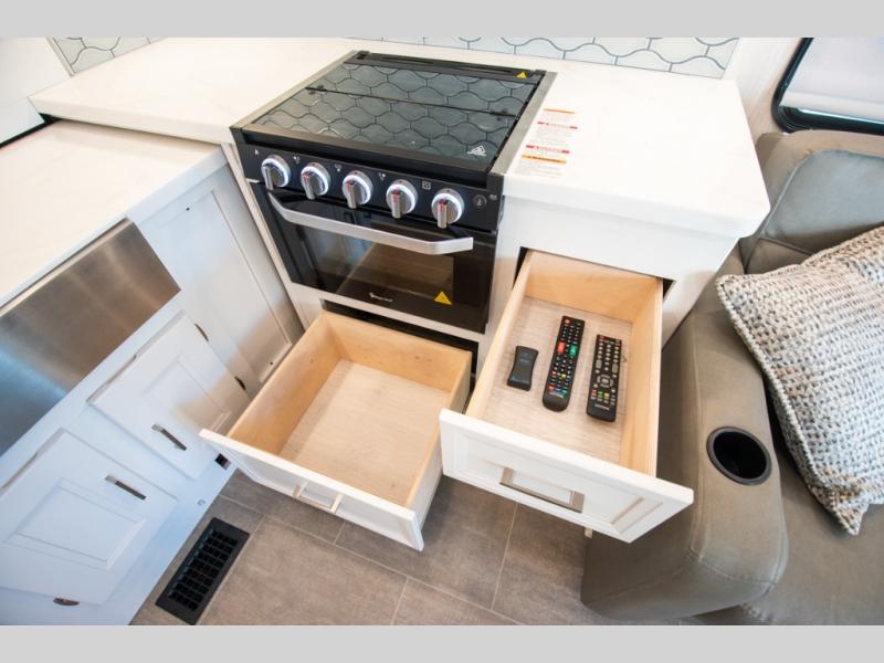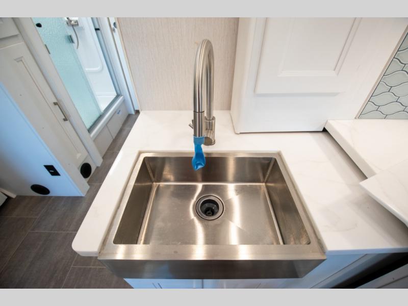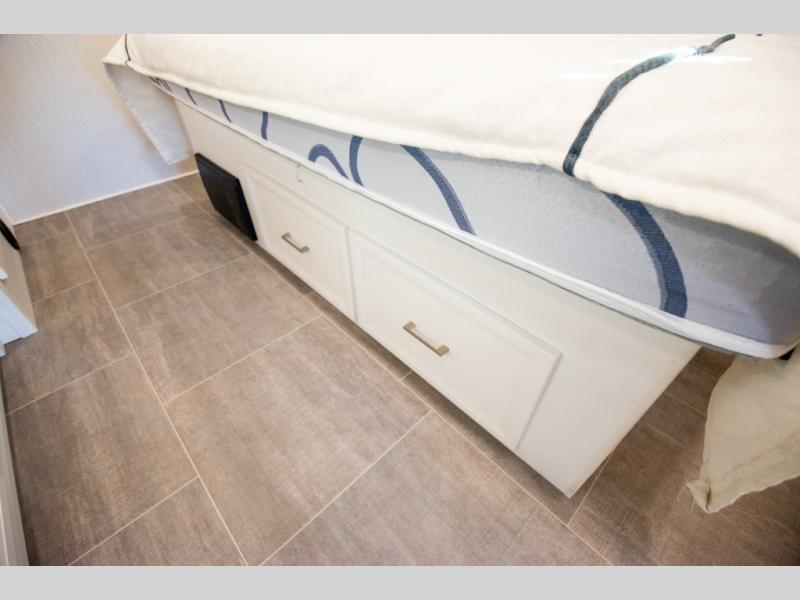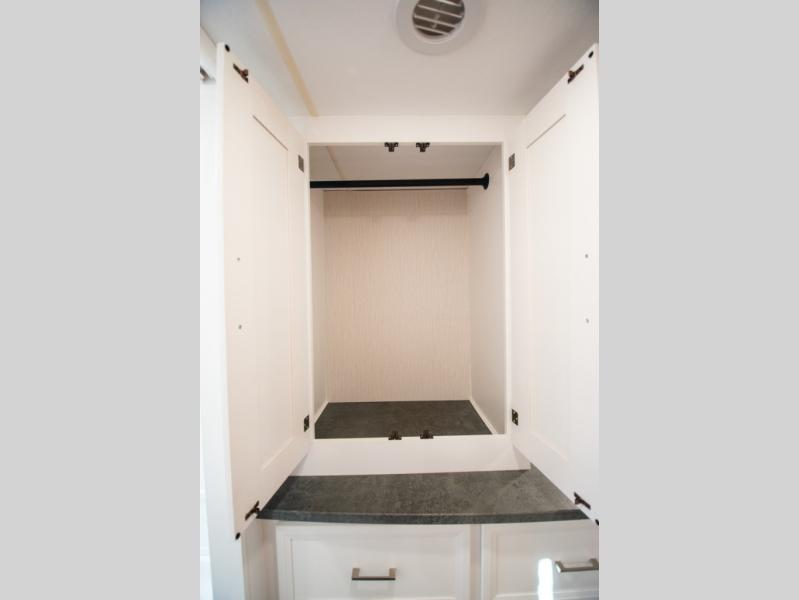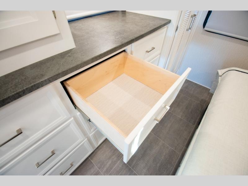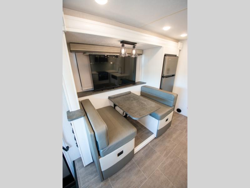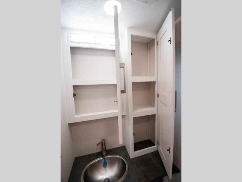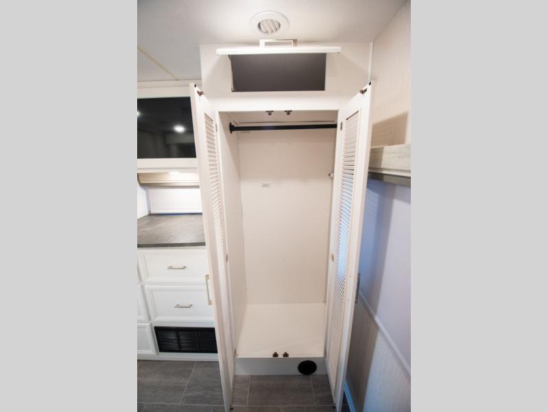 This triple slide out coach is perfect for your crew of six. The little ones will love the drop-down overhead bunk, while you take the king bed slide out in the rear bedroom. Any other guests can sleep on the sofa bed and booth dinette when they're not being used to dine at or relax. You'll love cooking in the fully-equipped kitchen with a stainless residential refrigerator, a three burner range, plus a stainless over-the-range microwave. This model features a private sink and lavy, with the shower just across the hall so two people can freshen up at once, and you'll find plenty of storage space throughout for all your belongings. There is even a stackable washer and dryer prep if you plan to go full-time!