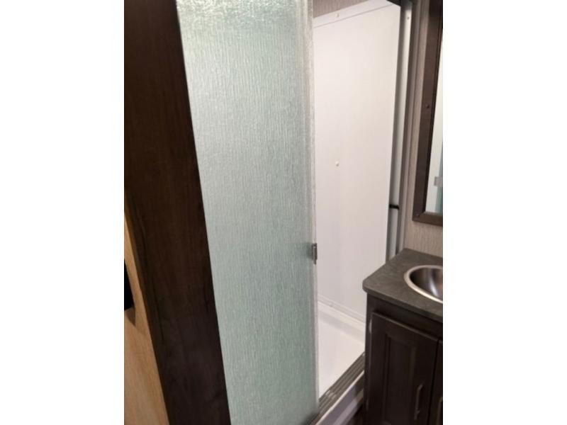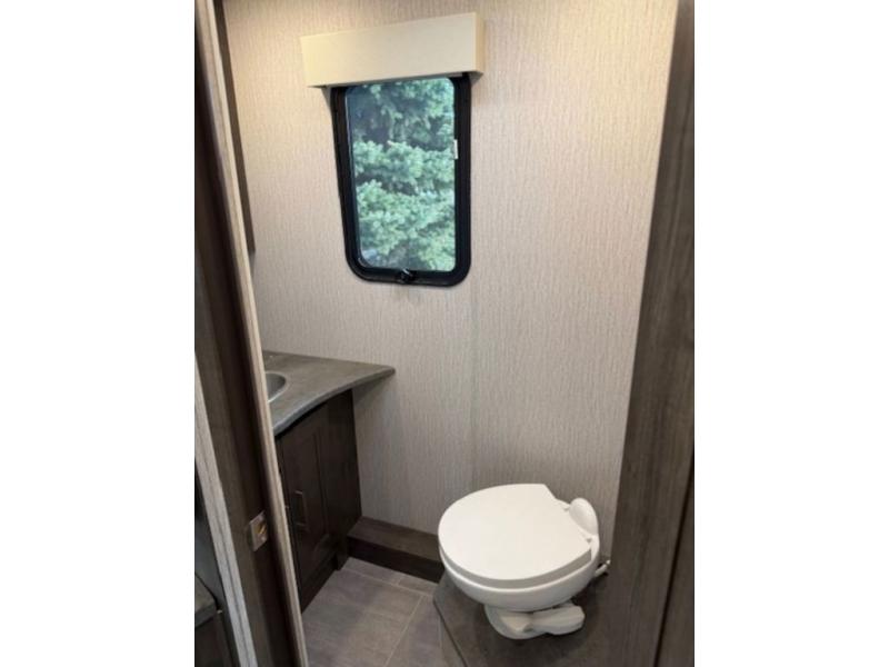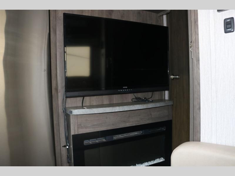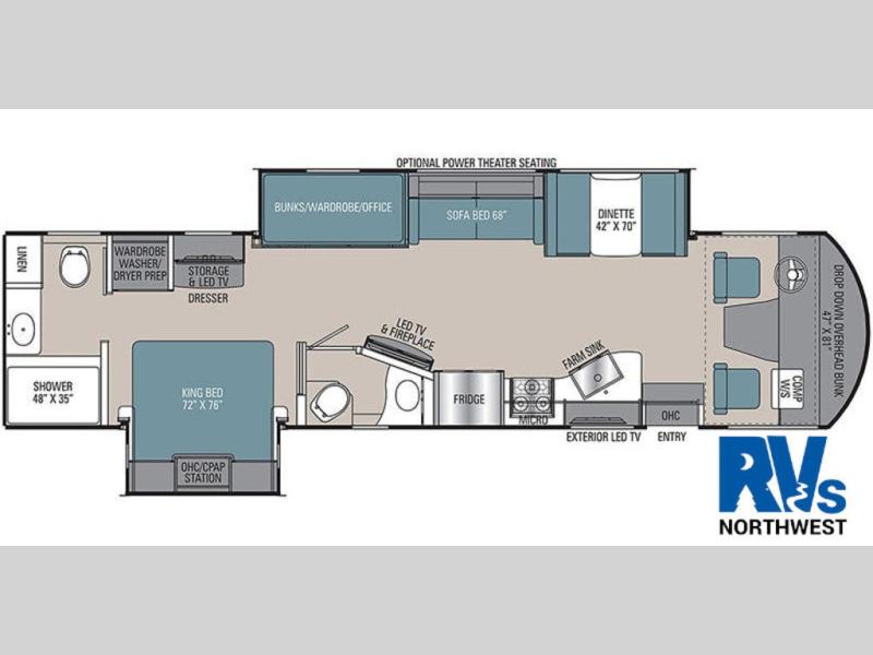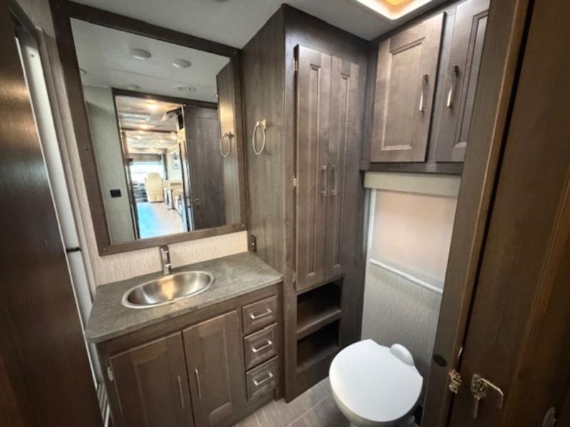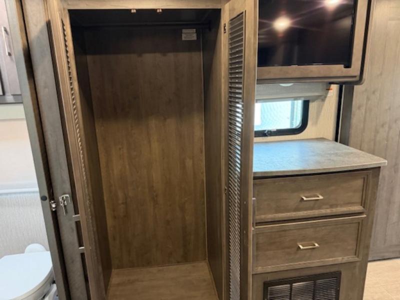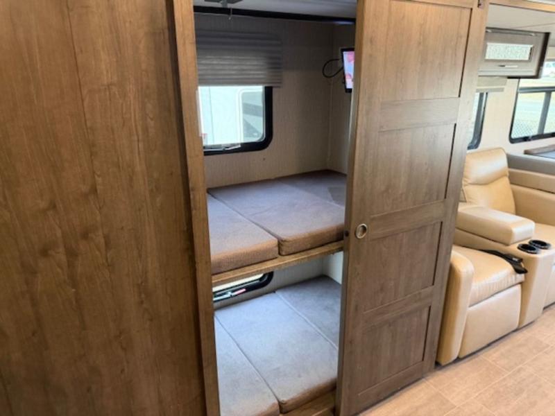 How convenient is it to have a bath and a half on board when traveling with friends and family?! The bunk beds can easily be used as a wardrobe or office space if you don't need the additional sleeping space, and you'll still have the overhead bunk up front. While the chef is preparing dinner on the three burner range, everyone else can visit on the sofa bed and booth dinette, and the fireplace here will make it feel more like home. The private bedroom suite features a king bed slide out, a dresser, plus a wardrobe with washer and dryer prep for added convenience. Don't let this coach slip away!