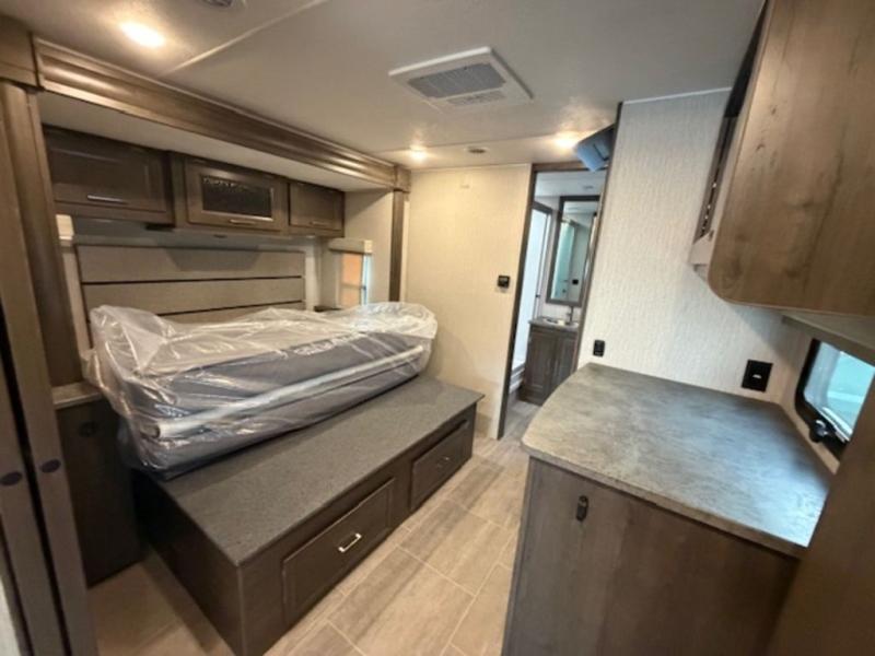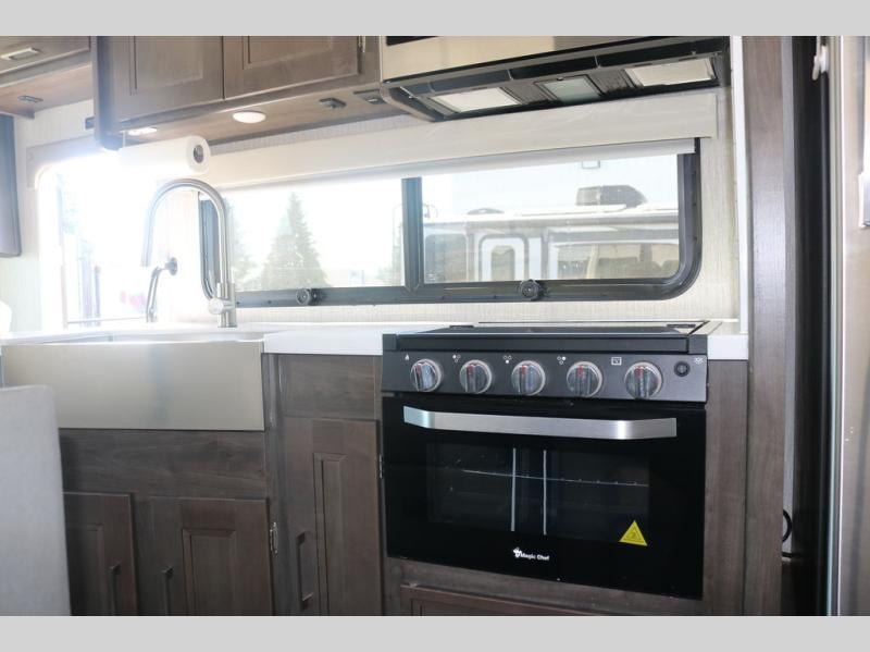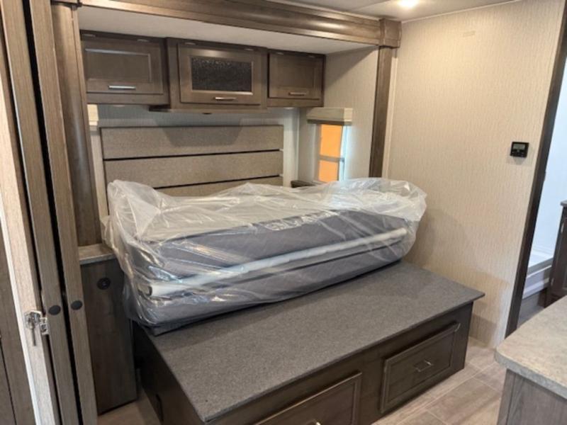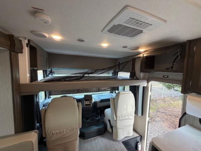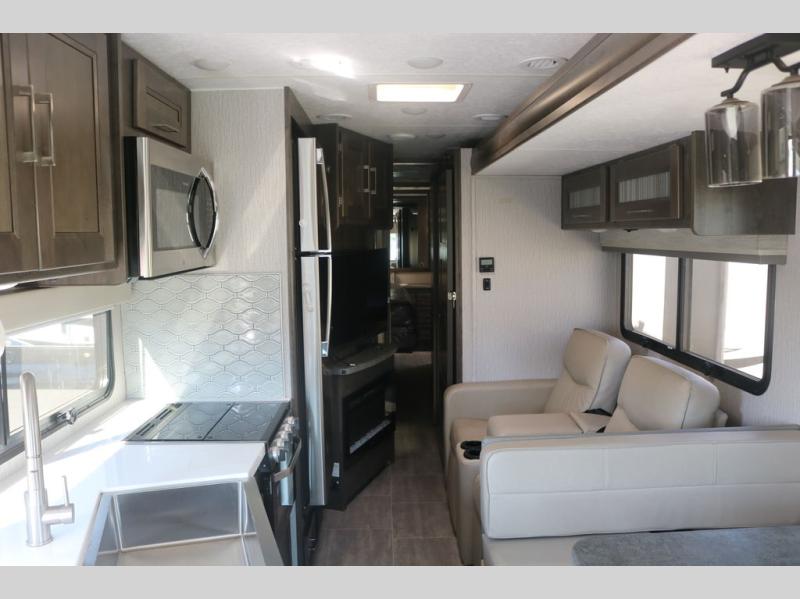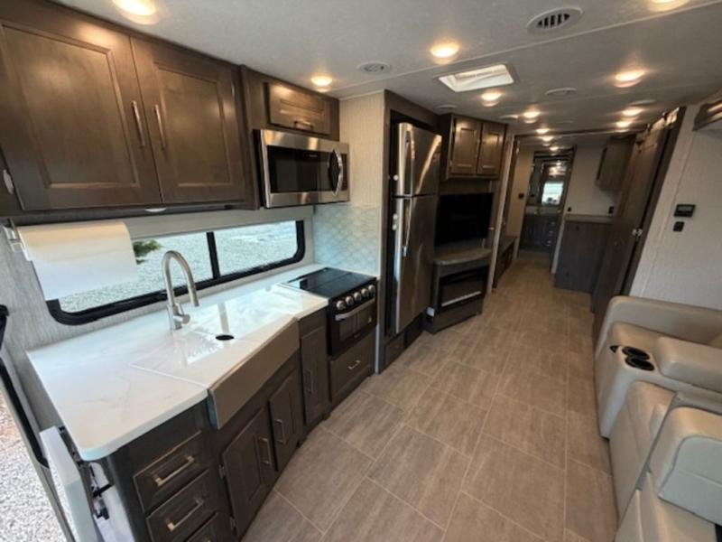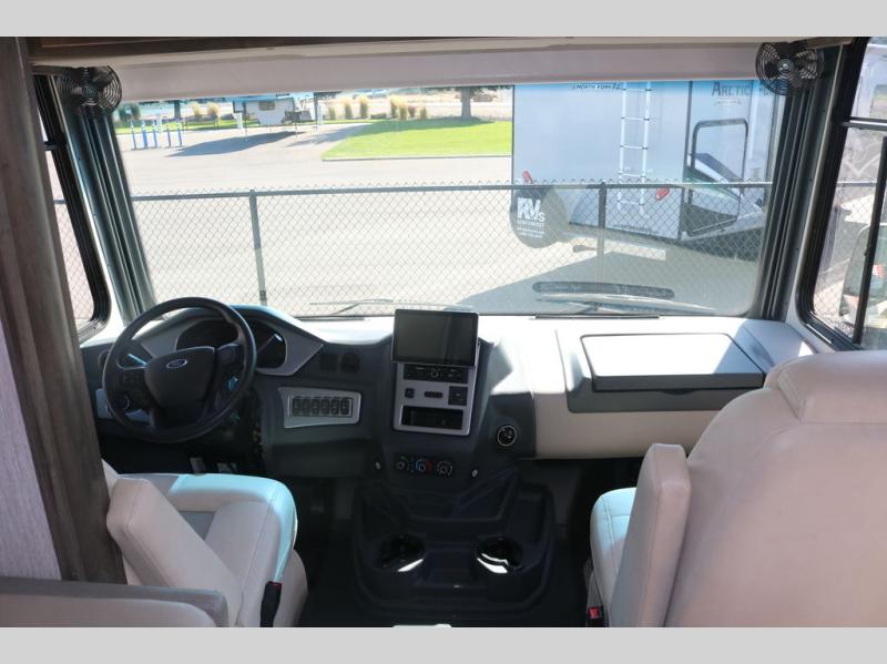Each Mirada Class A gas motorhome by Coachmen is constructed with a crowned, laminated fiberglass roof with Azdel Superlite composite for added durability, along with high gloss "Oyster" gelcoat sidewalls. There is a 7.3L V8 engine on a Ford F53 chassis for power you can feel, and a 10" touch screen radio with AM/FM radio with Bluetooth capability. The 5.5 kW gas generator, dual coach batteries, and 100W solar panel with a controller will meet all your power needs, and the automatic leveling jacks make setting up camp a breeze. Head inside to find premium linoleum throughout, hardwood cabinet doors, kitchen tile backsplash, and solar privacy shades throughout to name a few comforts. The open road is yours for the taking in a Mirada Class A gas motorhome!