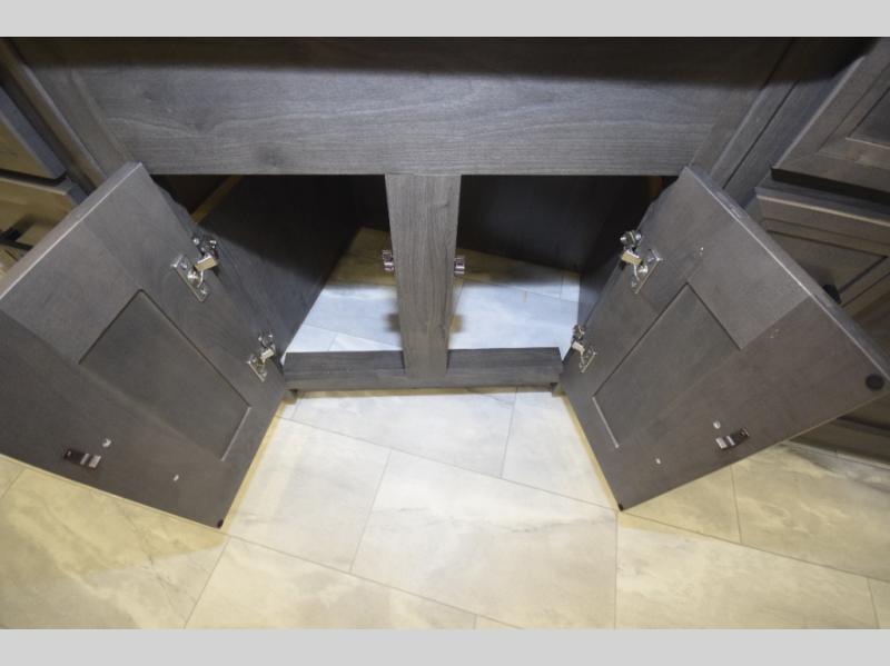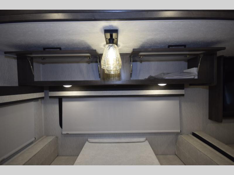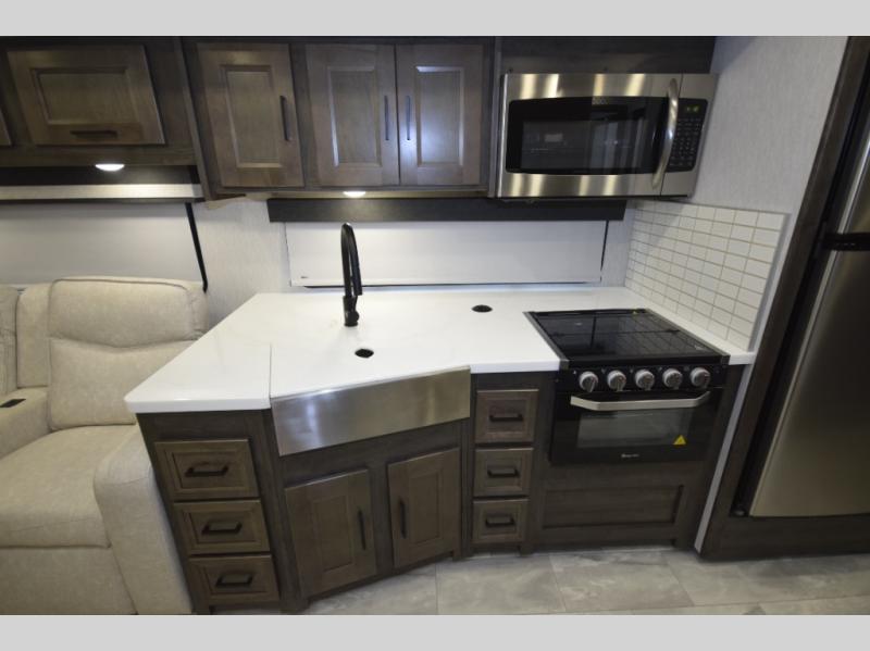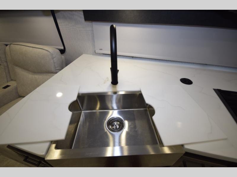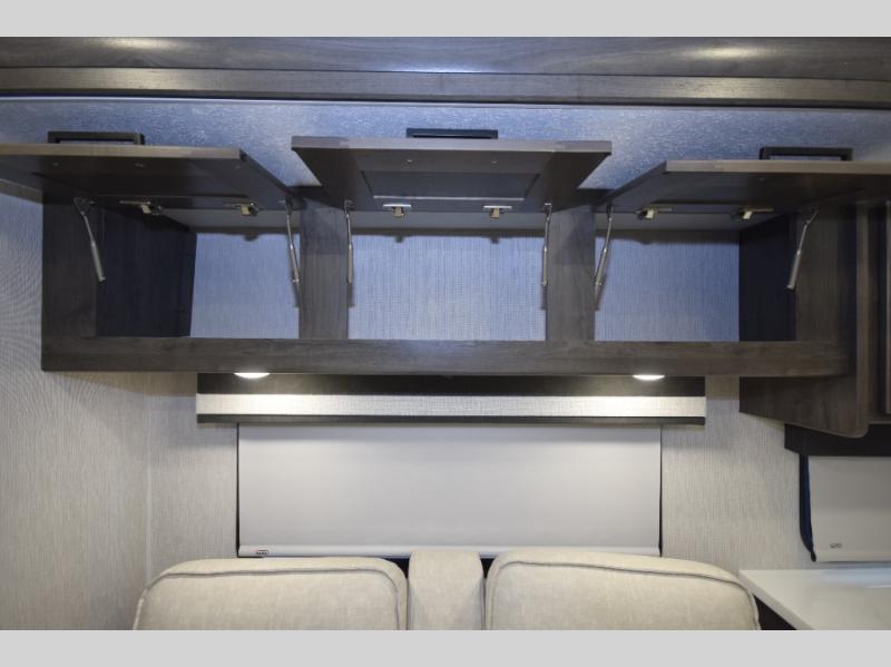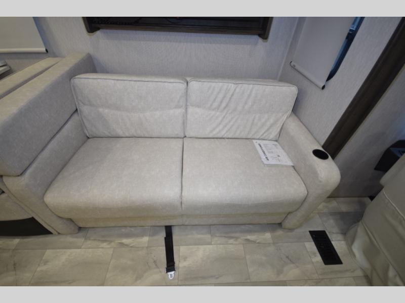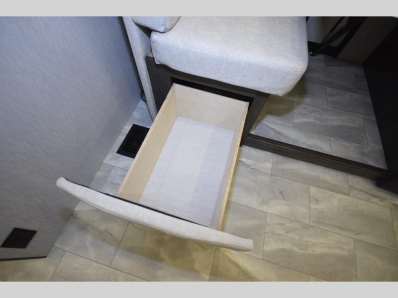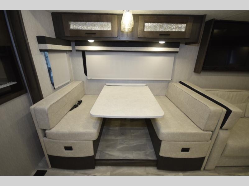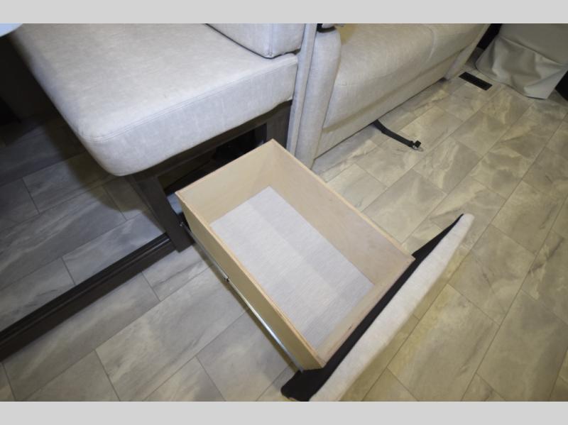 Step inside to find a beautifully designed interior, featuring hardwood cabinet doors, premium linoleum flooring, a sleek kitchen tile backsplash, and solar privacy shades throughout. The 10" touchscreen radio with Bluetooth lets you stay connected and entertained from the driver's seat, while the swivel captain’s chairs and passenger workstation make the cab area functional and fun.
