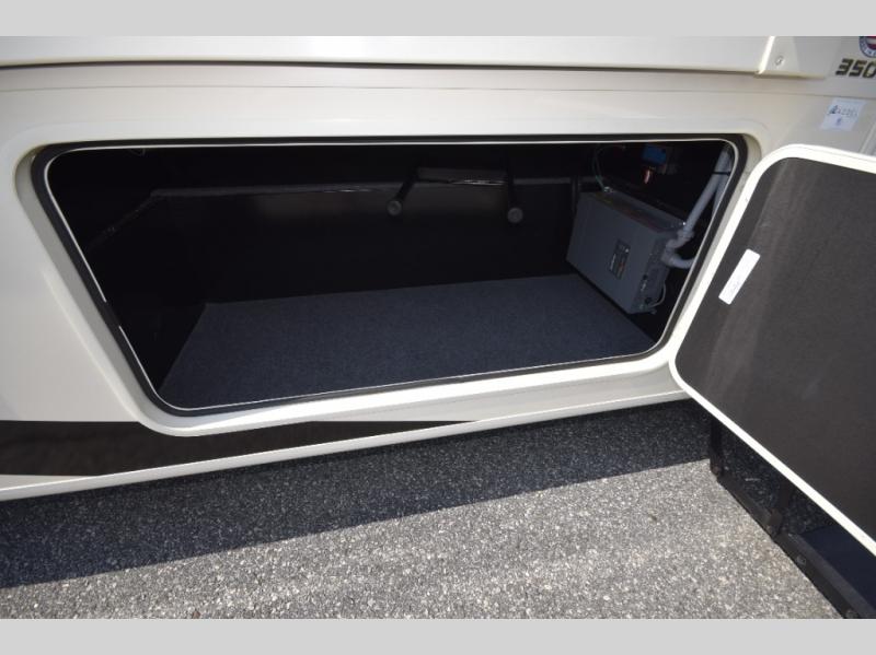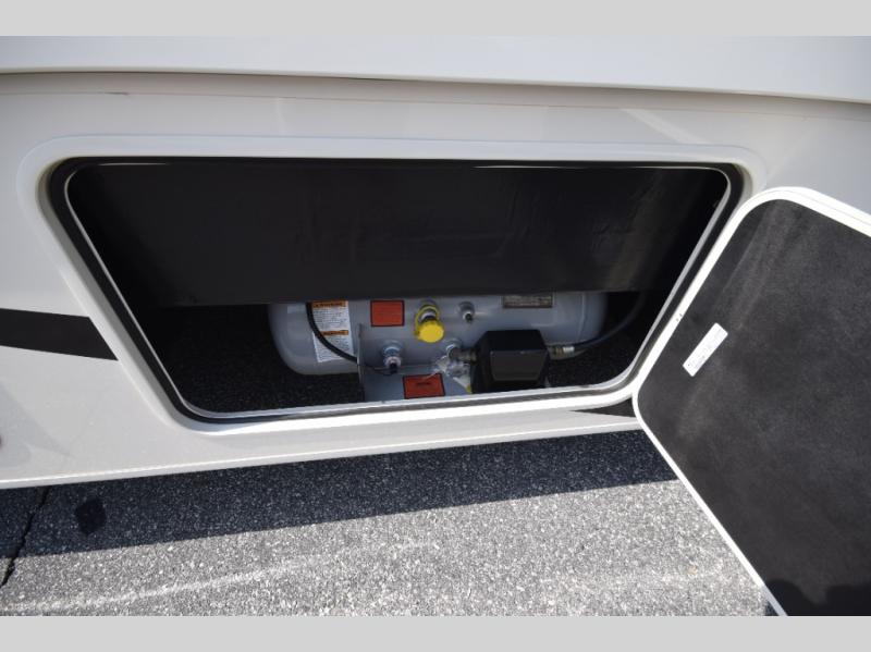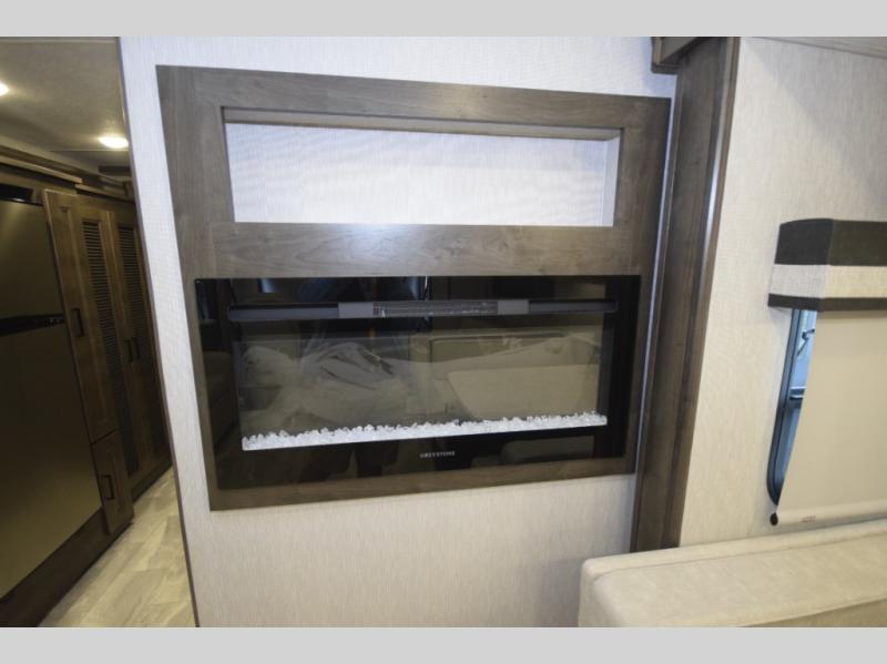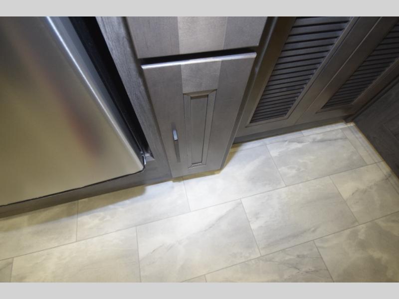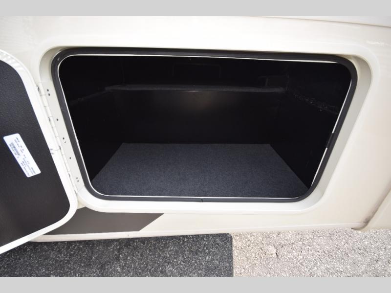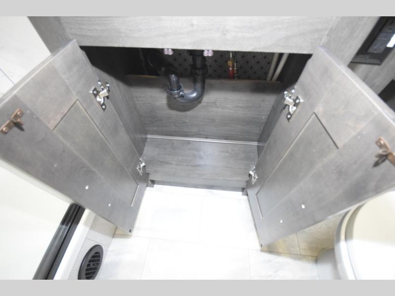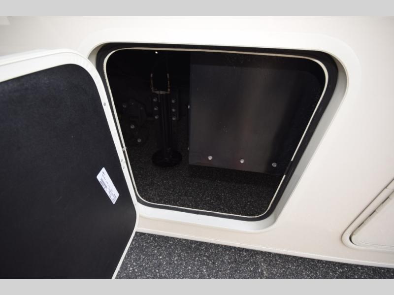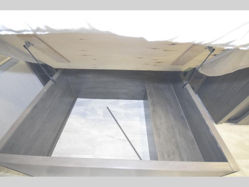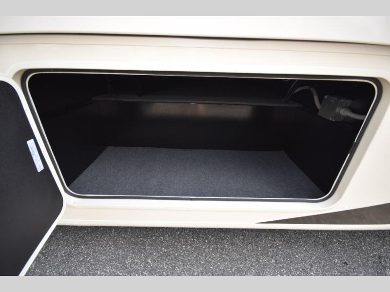 Step inside to find a beautifully designed interior, featuring hardwood cabinet doors, premium linoleum flooring, a sleek kitchen tile backsplash, and solar privacy shades throughout. The 10" touchscreen radio with Bluetooth lets you stay connected and entertained from the driver's seat, while the swivel captain’s chairs and passenger workstation make the cab area functional and fun.