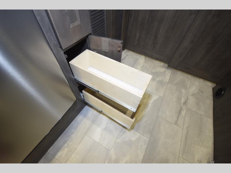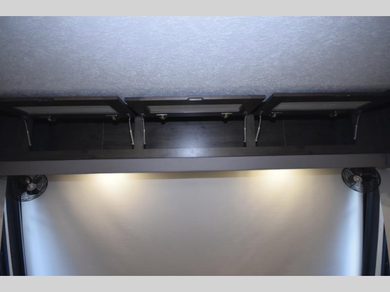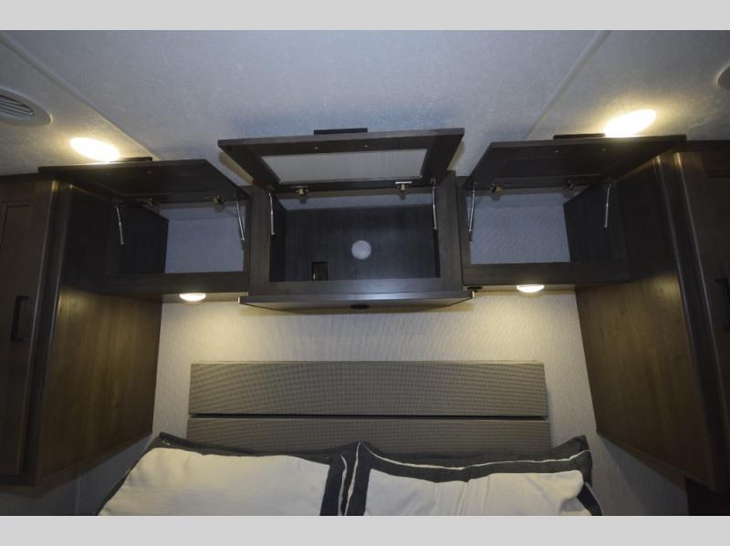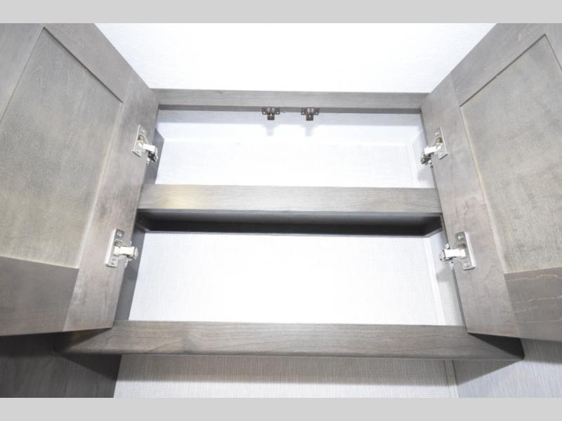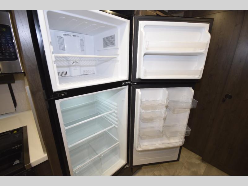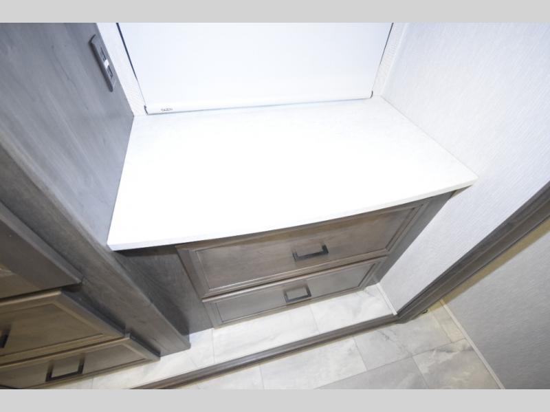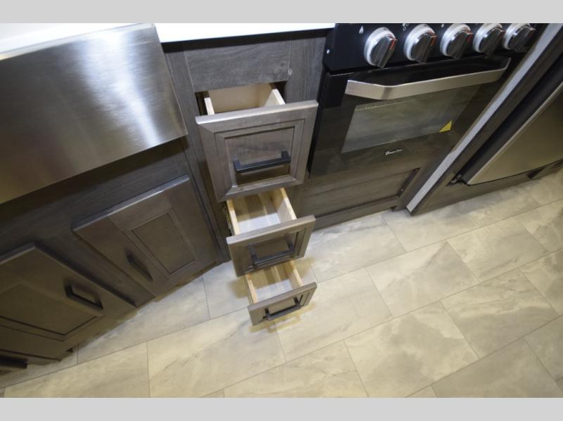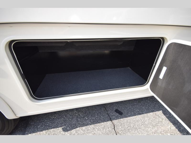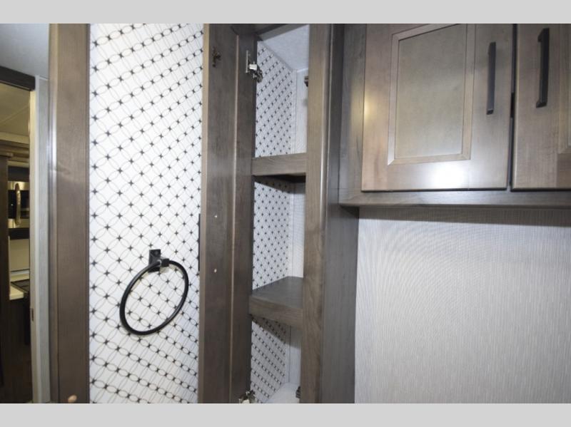 Step inside to find a beautifully designed interior, featuring hardwood cabinet doors, premium linoleum flooring, a sleek kitchen tile backsplash, and solar privacy shades throughout. The 10" touchscreen radio with Bluetooth lets you stay connected and entertained from the driver's seat, while the swivel captain’s chairs and passenger workstation make the cab area functional and fun.