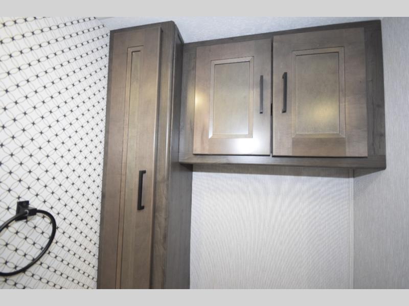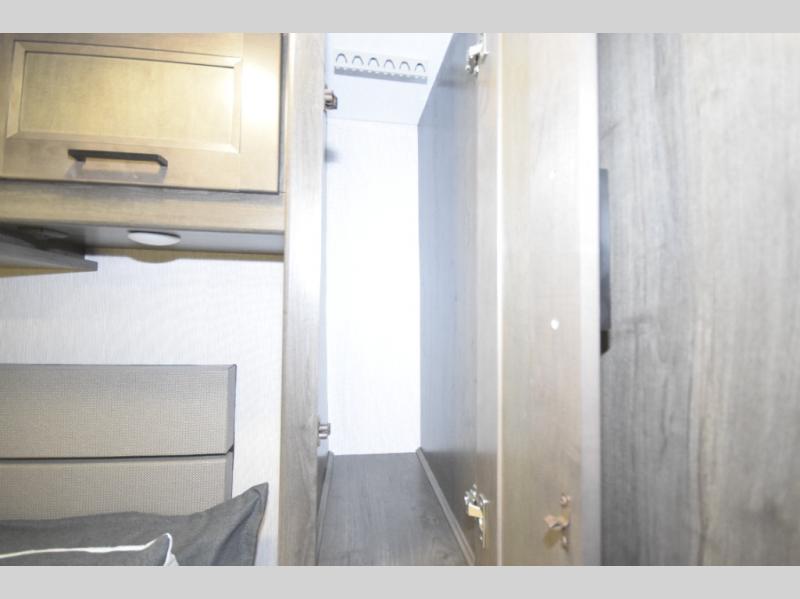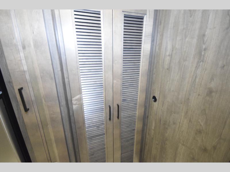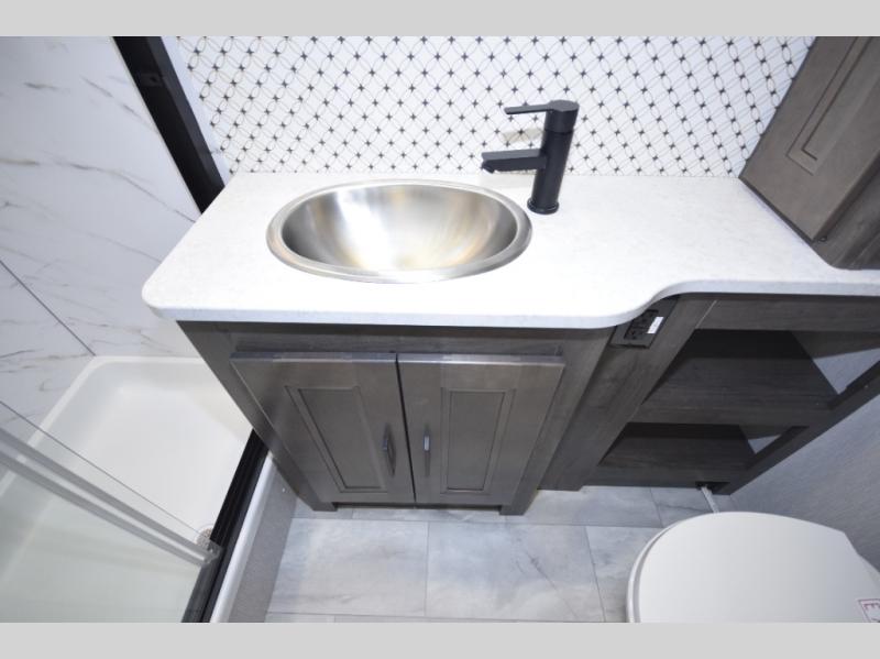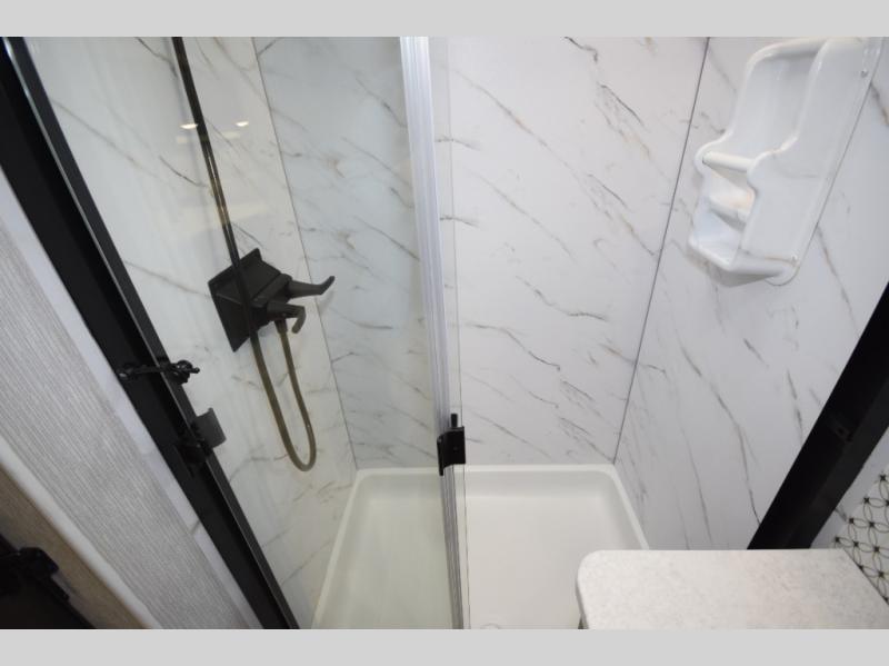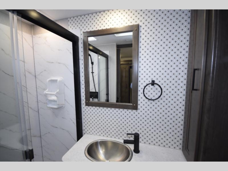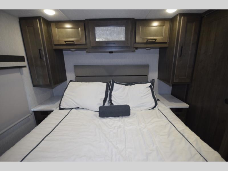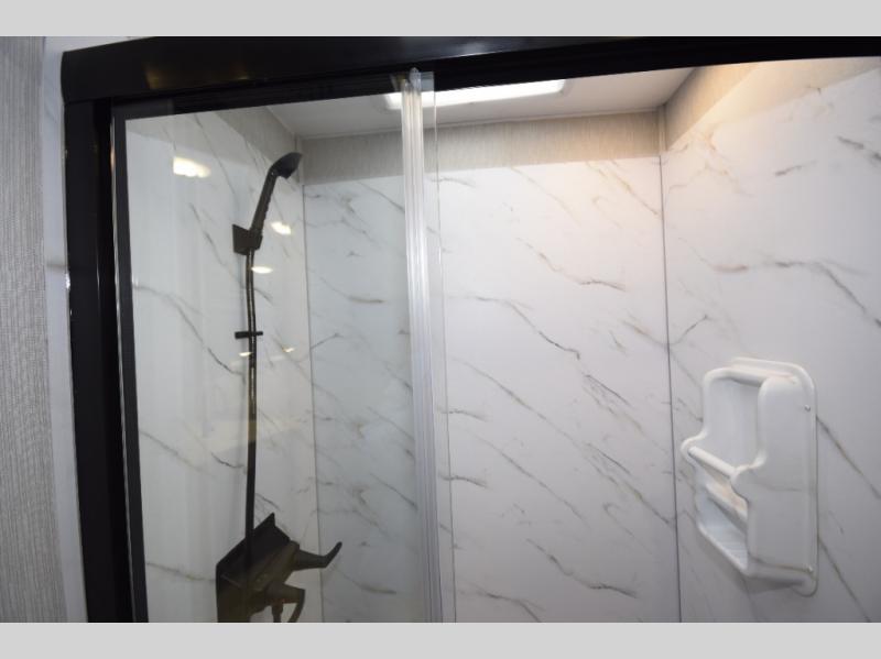 At the rear, you’ll find a private master retreat complete with a king-size bed, a spacious wardrobe, and a 32" LCD TV. The full bath offers a large glass-door shower with a skylight, extended counter space, and upscale finishes for a true residential feel. And with a built-in CPAP station, restful sleep is always within reach.