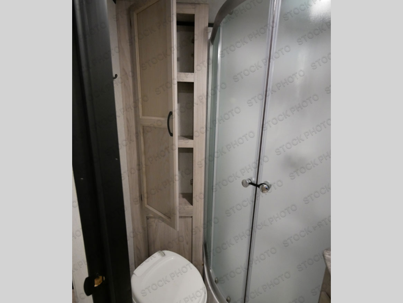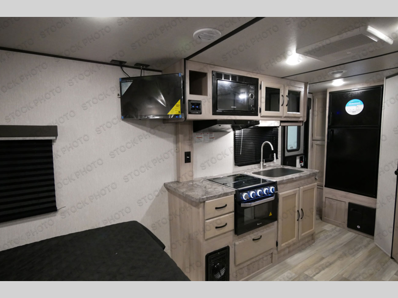 Easily hook up this lightweight travel trailer and head to your local state park for fun! The front bedroom includes a queen bed with Max Bed Storage, and dual bedroom wardrobes for all of your things. The free-standing table and sofa will provide a place to dine after lunch is prepared on the three burner cooktop. After a day outdoors you can clean up in the full bath that includes a radius shower, a linen closet, plus a shower skylight to let natural light in. This model also includes a two door refrigerator for your perishables, a hutch for more storage, plus an exterior pass-through storage for fishing poles!
