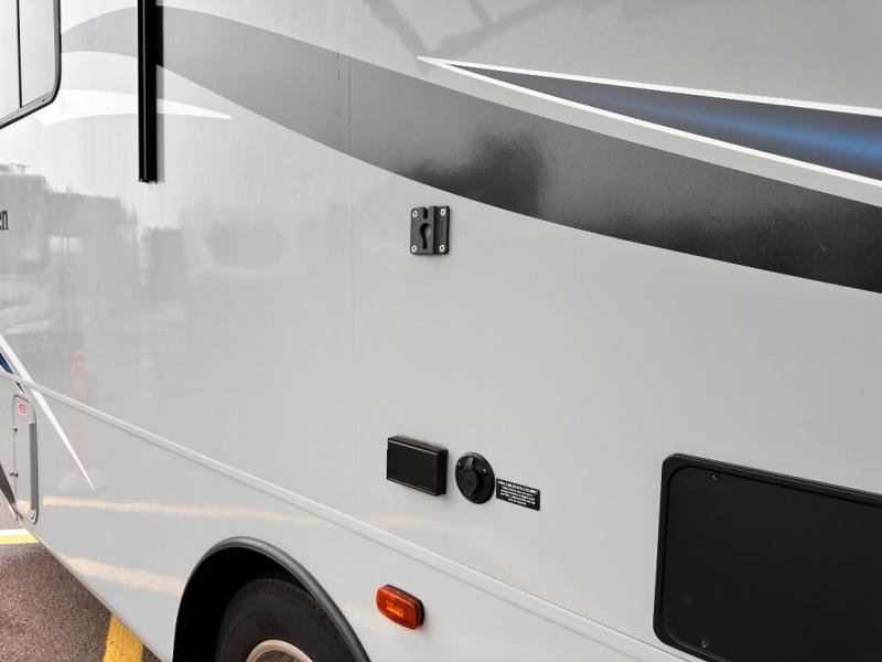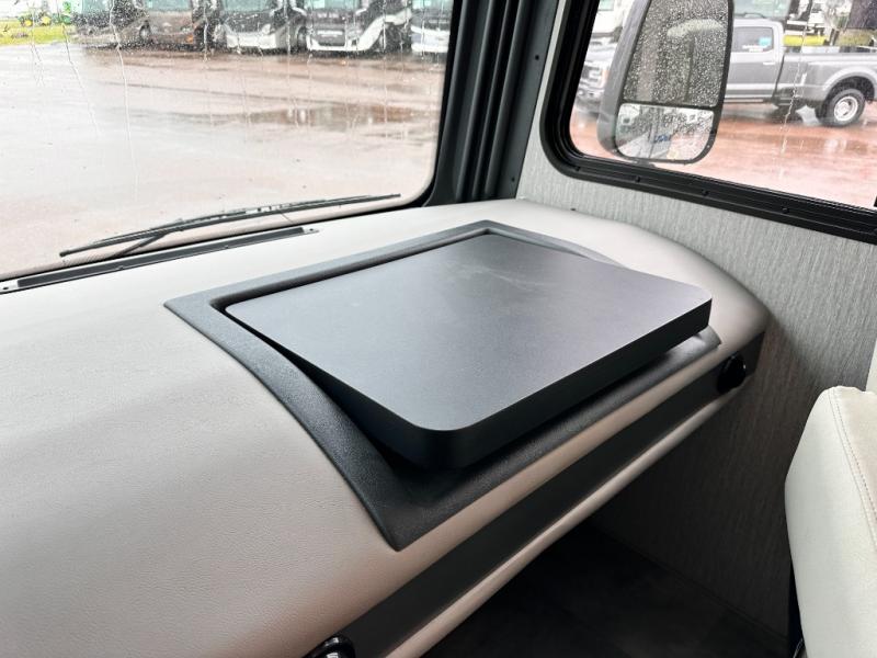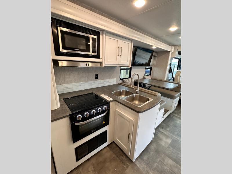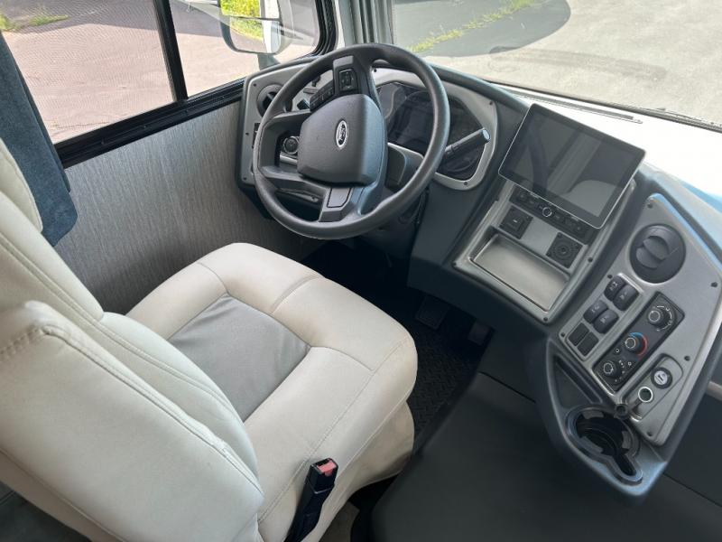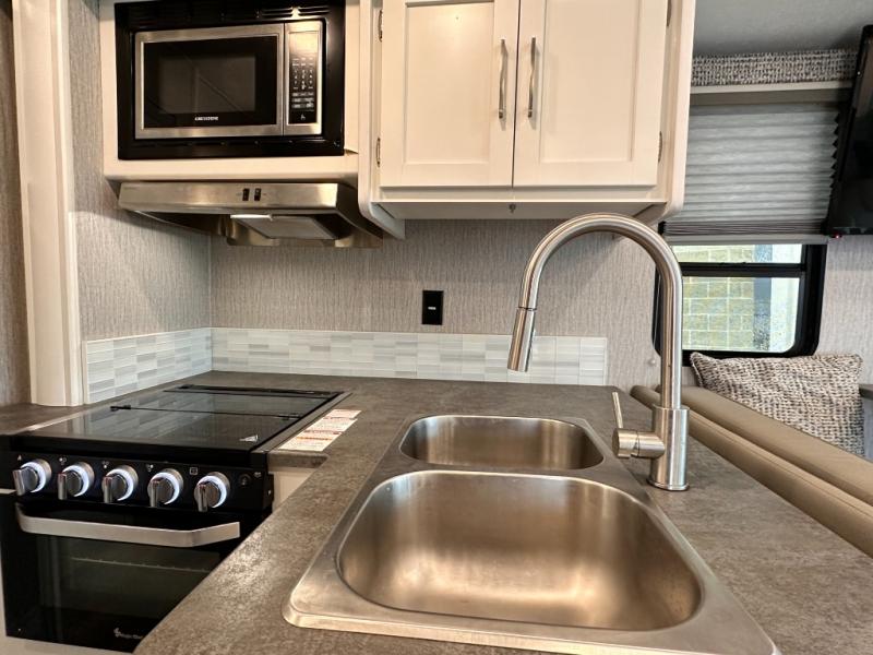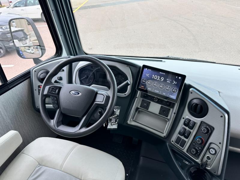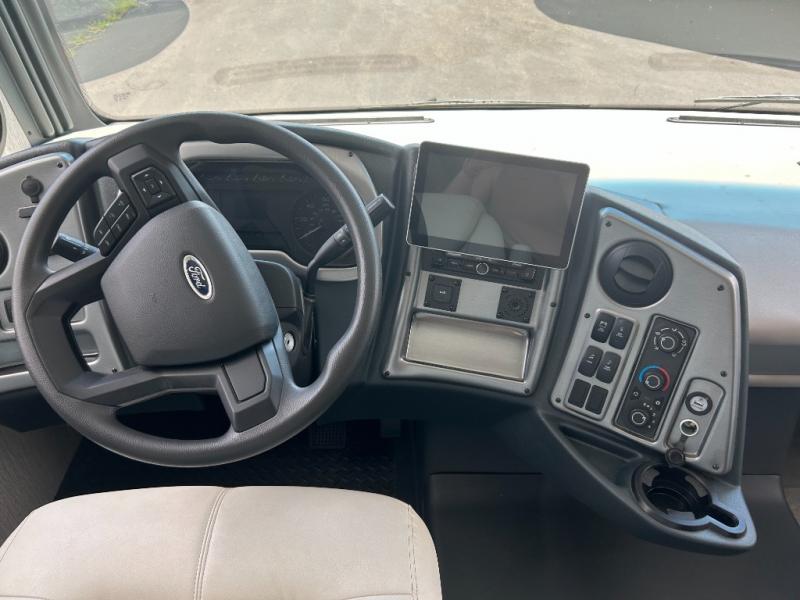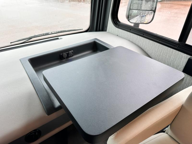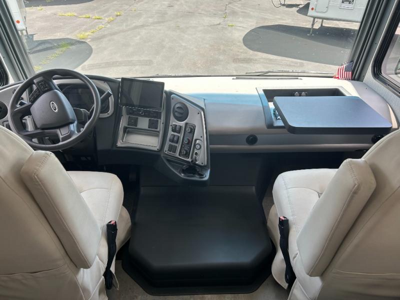 You won't want to travel any other way once you step inside this motorhome! The rear private bedroom has a 60" x 74" queen bed to lay your head on at night with wardrobes on either side of it for your clothes. A separated bathroom makes it easy for one person to freshen up in the 24" x 32" shower while another uses the private toilet and sink. Enjoy home cooked meals while out on the road with the stainless steel three burner cooktop, the stainless steel double door 10 cu. ft. refrigerator, and even the stainless steel microwave oven. Eat your meals, play card games, and even transform the 42" x 72" booth dinette into an extra sleeping space. The 63" sofa has storage below for an extra blanket or board games. If you need to get some work done while you're away then you will appreciate the computer work station with 12V, 110V, and USB outlets in front of the passenger chair!