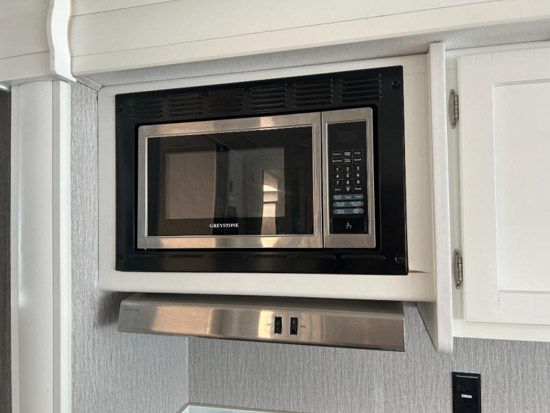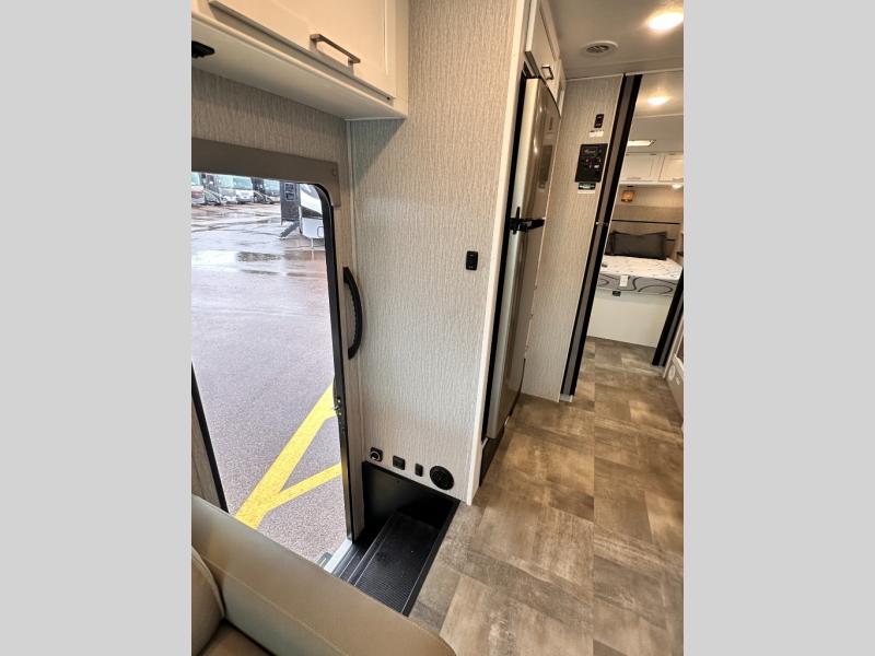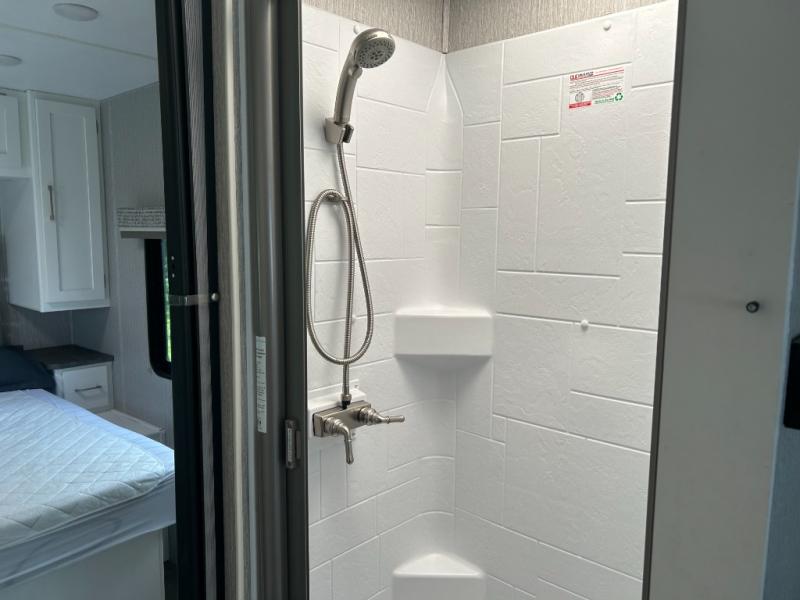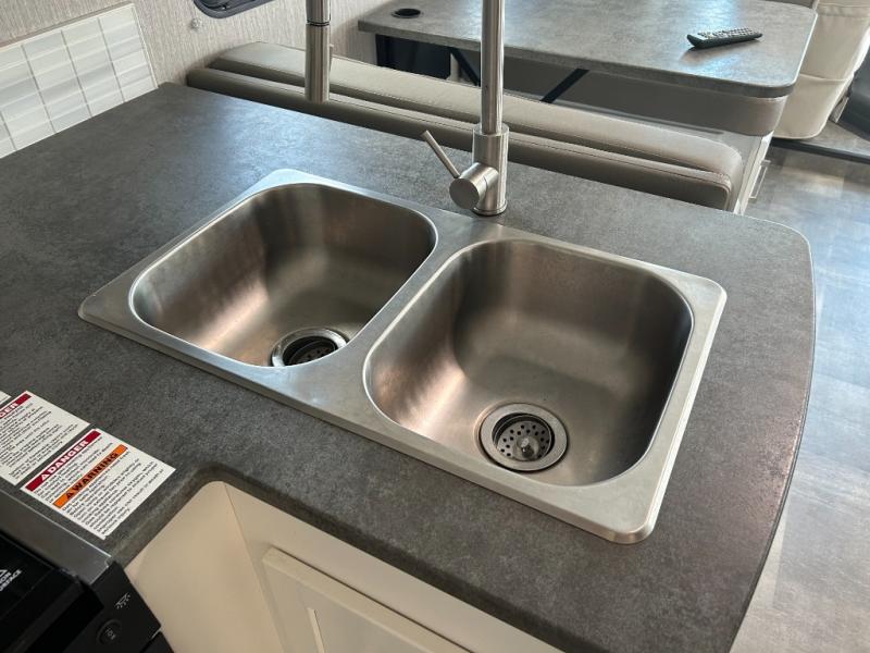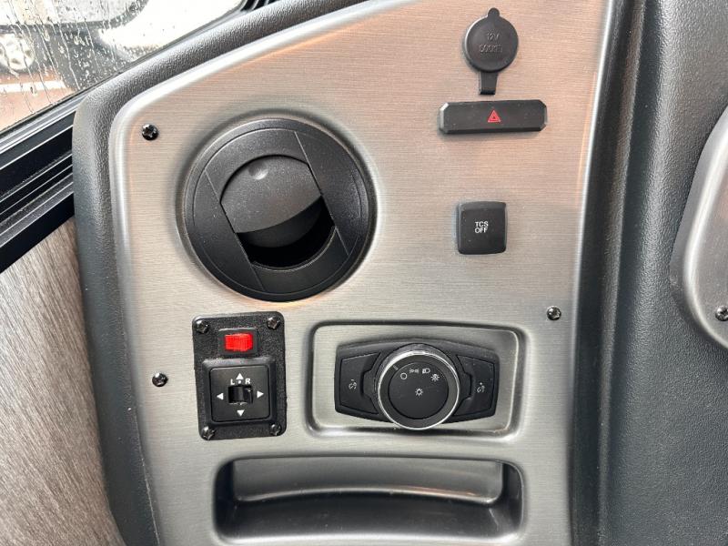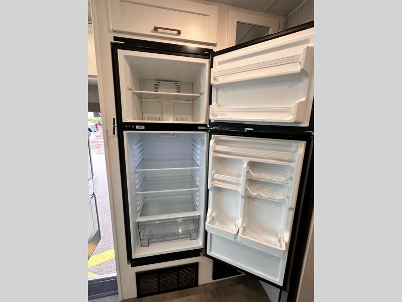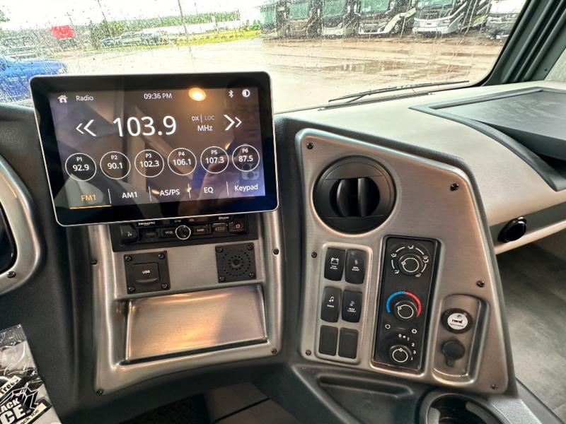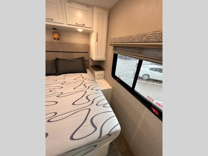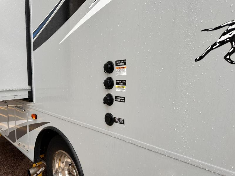 You won't want to travel any other way once you step inside this motorhome! The rear private bedroom has a 60" x 74" queen bed to lay your head on at night with wardrobes on either side of it for your clothes. A separated bathroom makes it easy for one person to freshen up in the 24" x 32" shower while another uses the private toilet and sink. Enjoy home cooked meals while out on the road with the stainless steel three burner cooktop, the stainless steel double door 10 cu. ft. refrigerator, and even the stainless steel microwave oven. Eat your meals, play card games, and even transform the 42" x 72" booth dinette into an extra sleeping space. The 63" sofa has storage below for an extra blanket or board games. If you need to get some work done while you're away then you will appreciate the computer work station with 12V, 110V, and USB outlets in front of the passenger chair!