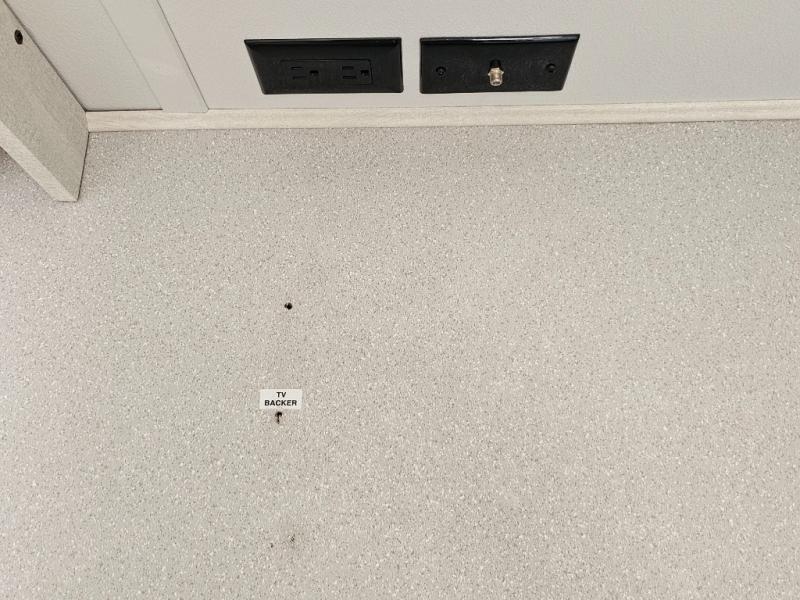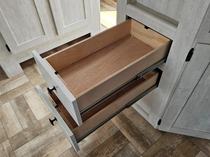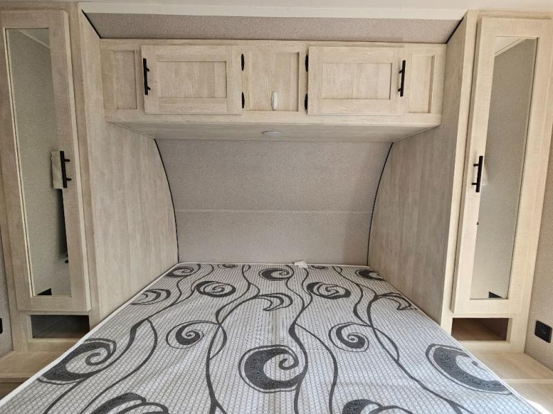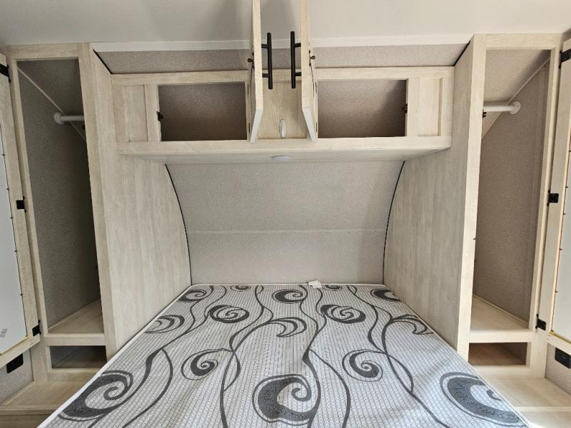 Front private bedroom with an RV queen bed, dual wardrobes, and under-bed storage