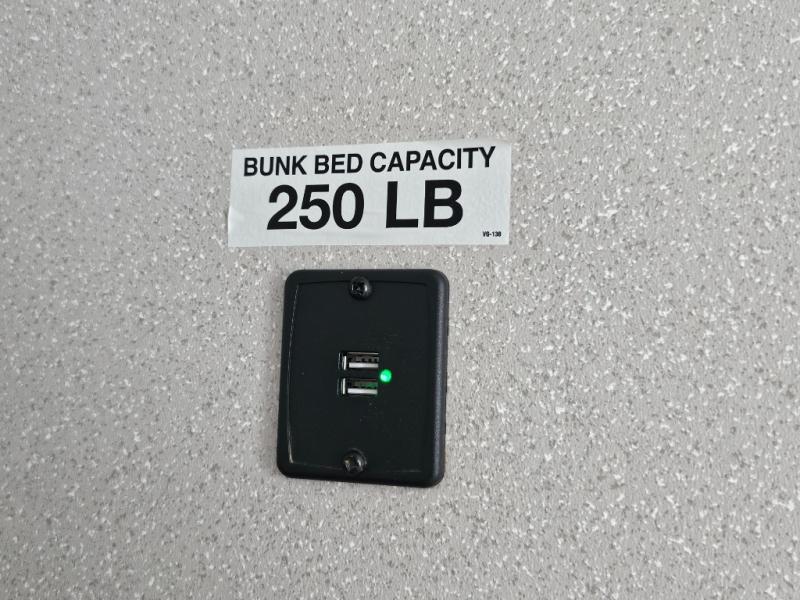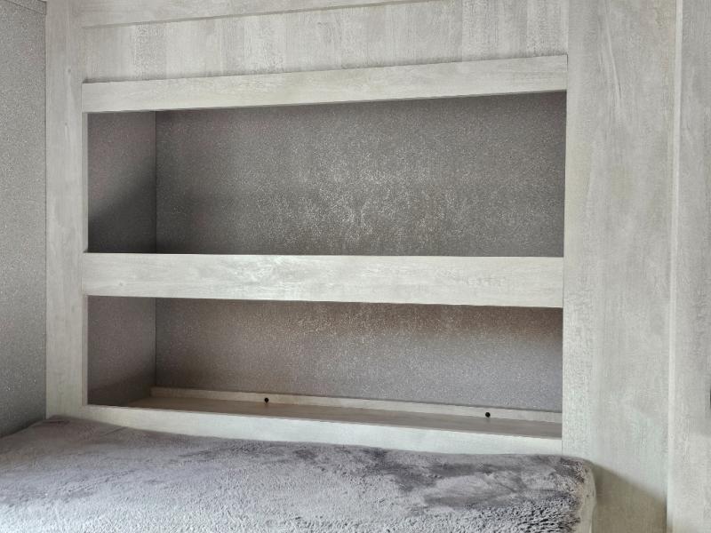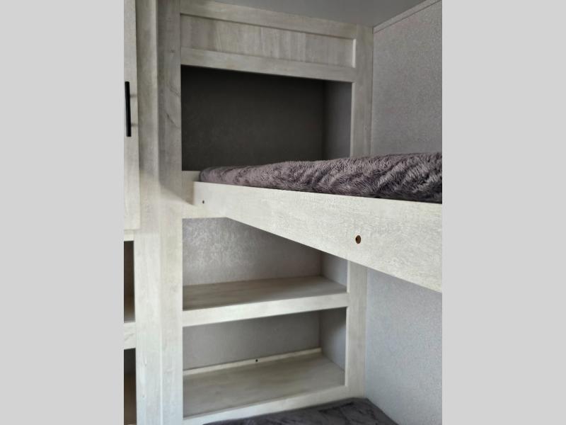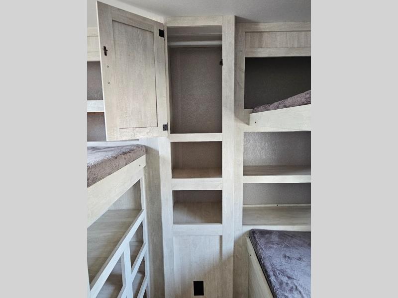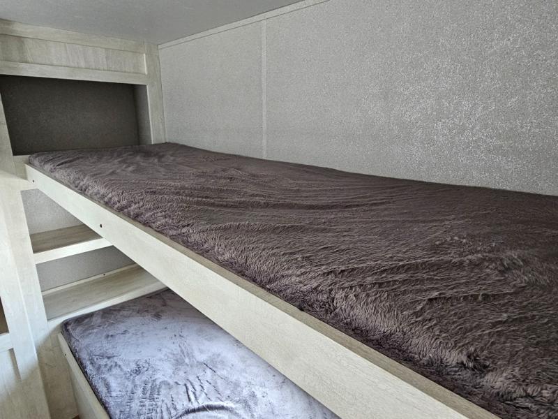 Rear private bunkhouse with three bunks, storage, and a wardrobe – ideal for kids or guests