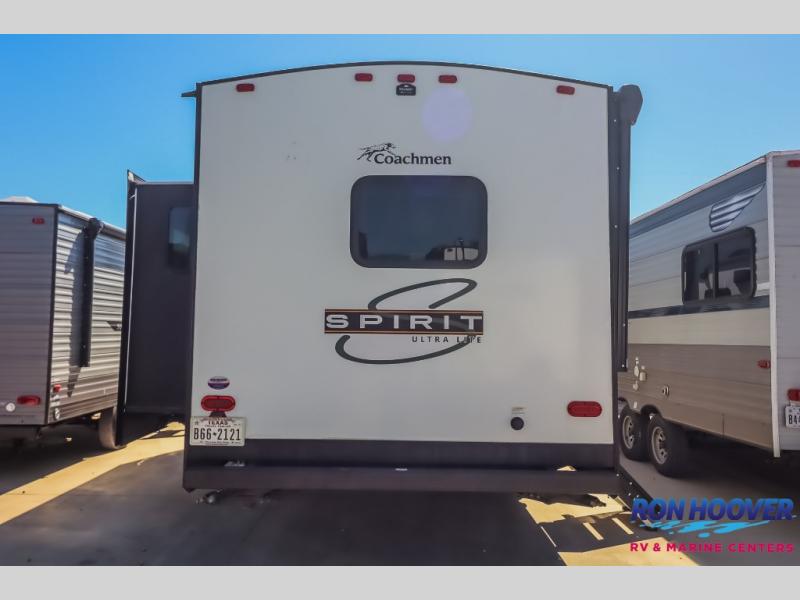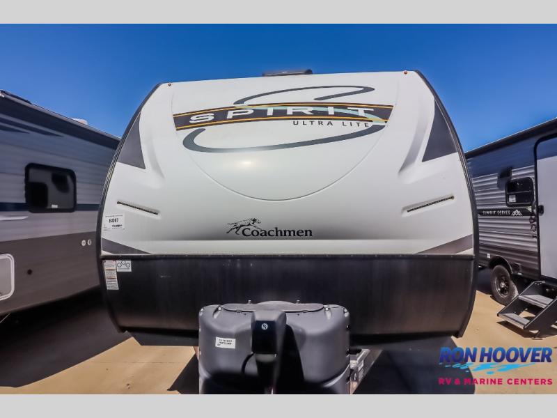 Raise your spirits with the Coachmen Spirit Ultra Lite travel trailer! For whatever type of outing you have planned, the Spirit Ultra Lite will stick with you by your side. Through the rain, the power awning will protect you. Through the cold, the ducted furnace will provide you with heat. Along the gravel roads, the front rock guard will prevent debris from damaging your trailer. And throughout your adventures, the exterior speakers will be there to make it more fun. Coachmen likes to keep their camping experiences simplified which is why you'll find that theme present in many of their included features, like the "Twice Cool" dual-ducted air conditioning system, the exterior dog leash clip, the preparations for Wi-Fi, the bottle opener, and the sink cover storage.