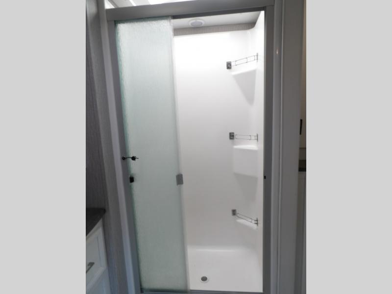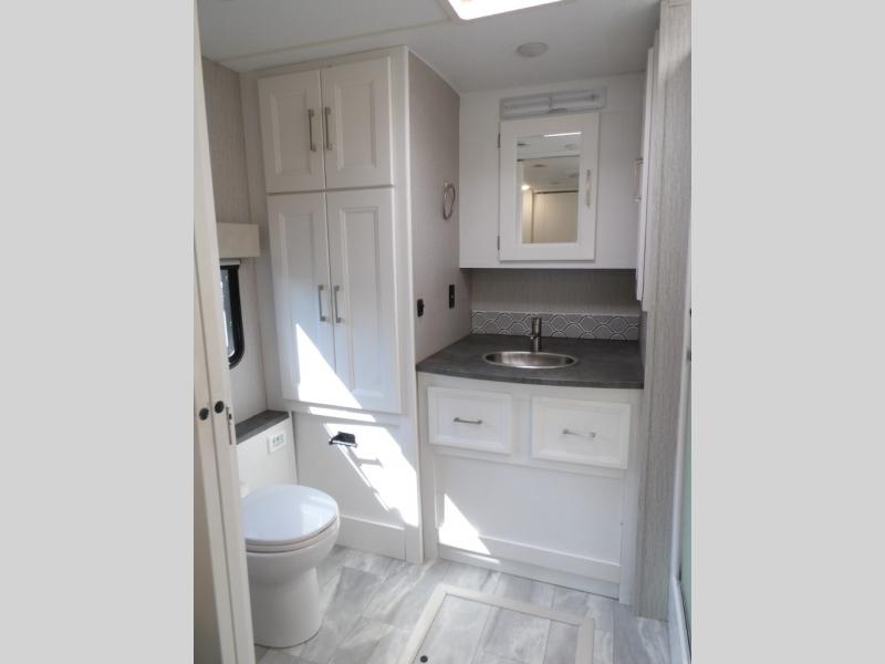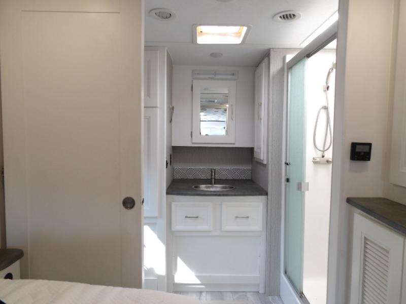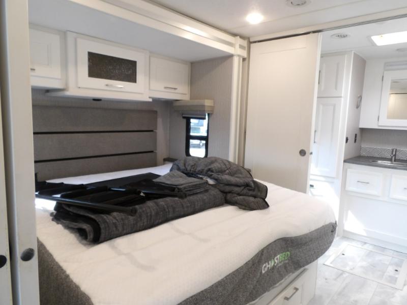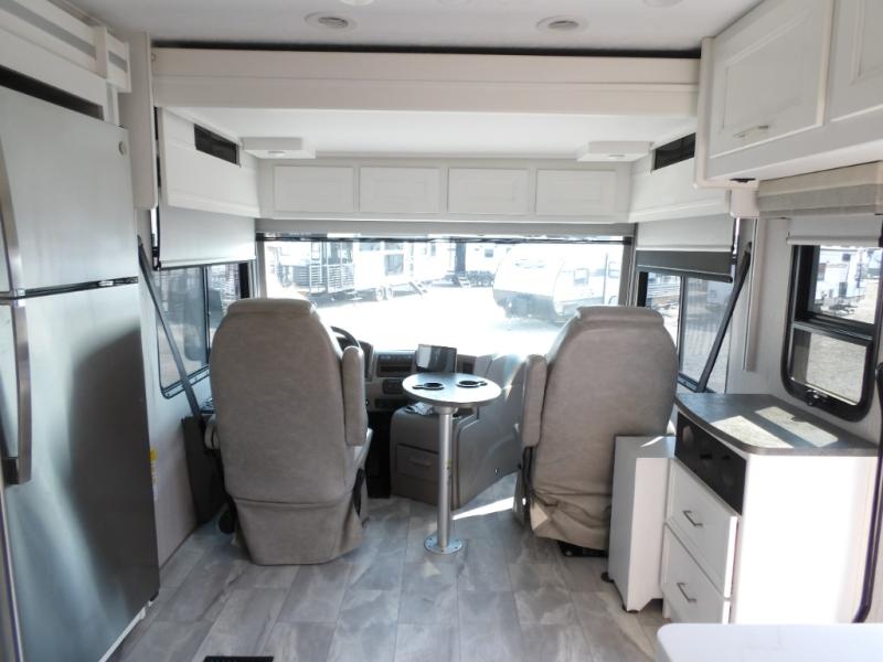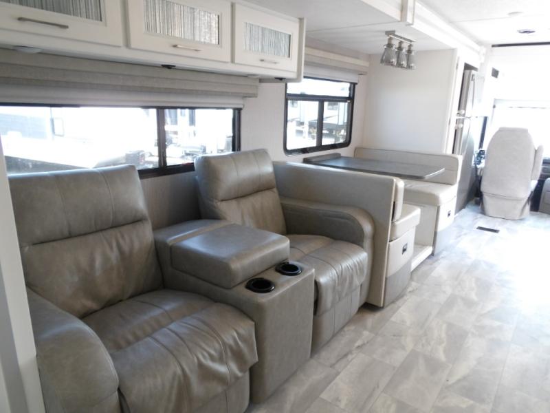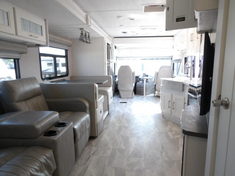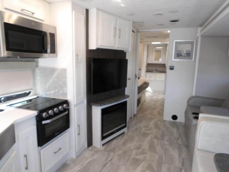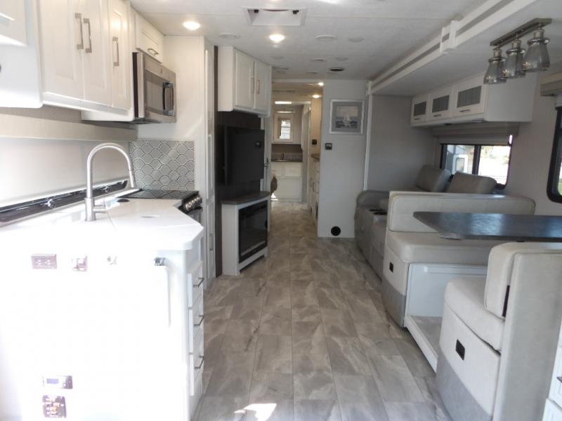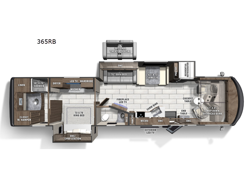 Wow! Check out this motorhome with a full rear bath, a convenient half bath, and sleeping space for six! There is a cockpit table with cupholders for your drinks, a booth dinette where you can dine together, and a 78" sofa bed across from the fireplace and 40" LCD TV. And the littles ones will love the drop-down overhead bunk. The chef of your group can prepare meals on the three burner range or in the stainless steel over the rang microwave. The master bedroom is comfortable with its king bed slide out and residential style headboard, plus there are USB ports on both sides of the bed and a CPAP station above the bed for convenience.