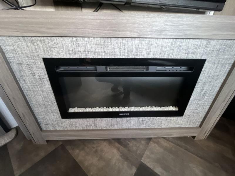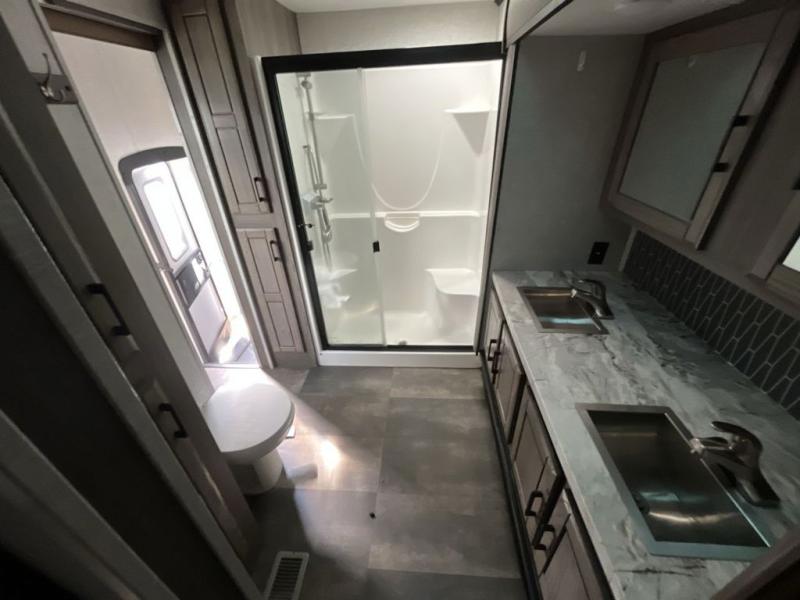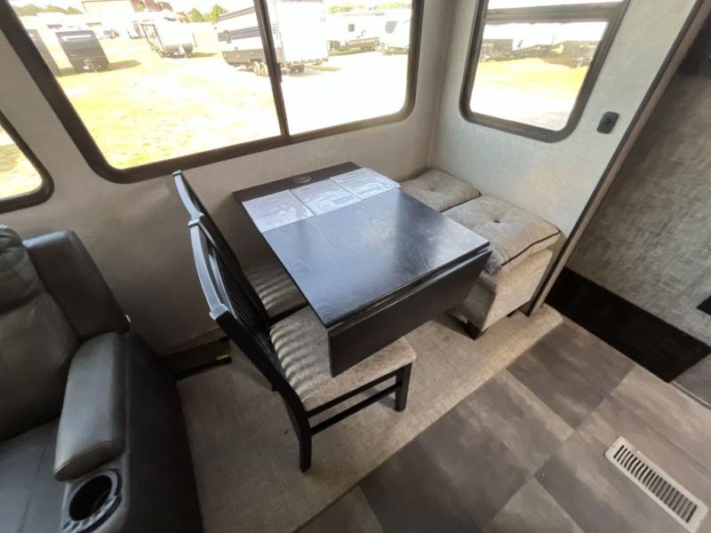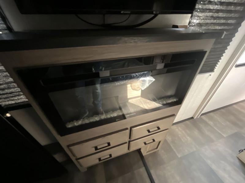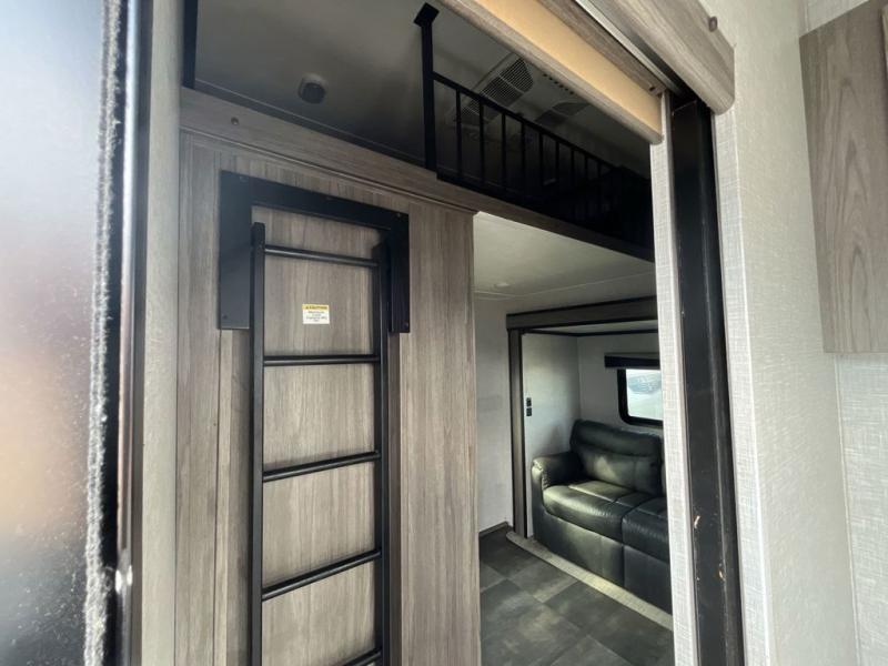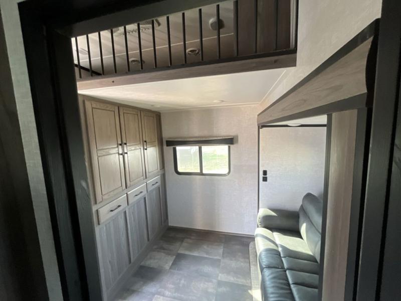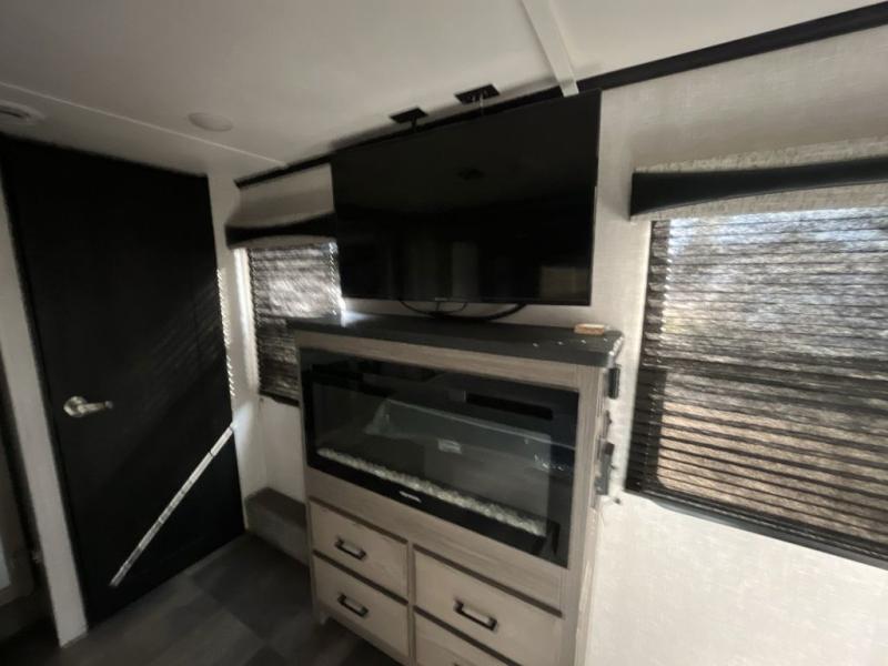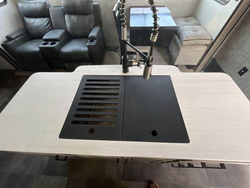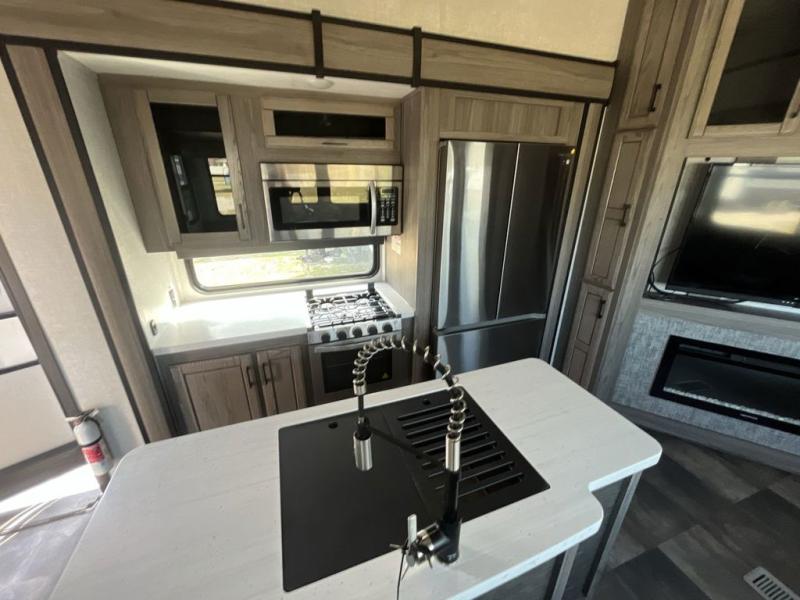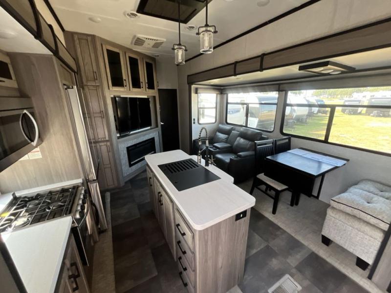 With dual entry doors, everyone can easily access this fifth wheel! One of the entrances leads directly into the half bathroom attached to the rear bedroom which has a tri-fold sofa slide and wardrobe below a 54" x 74" loft bunk matt. The chef can prepare their best home cooked meals either indoors with the Furrion kitchen collection and the kitchen island or at the outside kitchen with a refrigerator and griddle. Enjoy your meals together at the dinette with two chairs on one side and bench seating on the other side. The dual entry bathroom has a 48" shower with a seat to freshen up in each morning and a dual sink vanity for two to get ready at once, plus it enters into the front private bedroom. You will feel right at home in the bedroom with the king bed slide across from the dresser with a fireplace and 39" TV, and the front closet with a shoe shelf and an area prepped to add an optional washer and dryer!