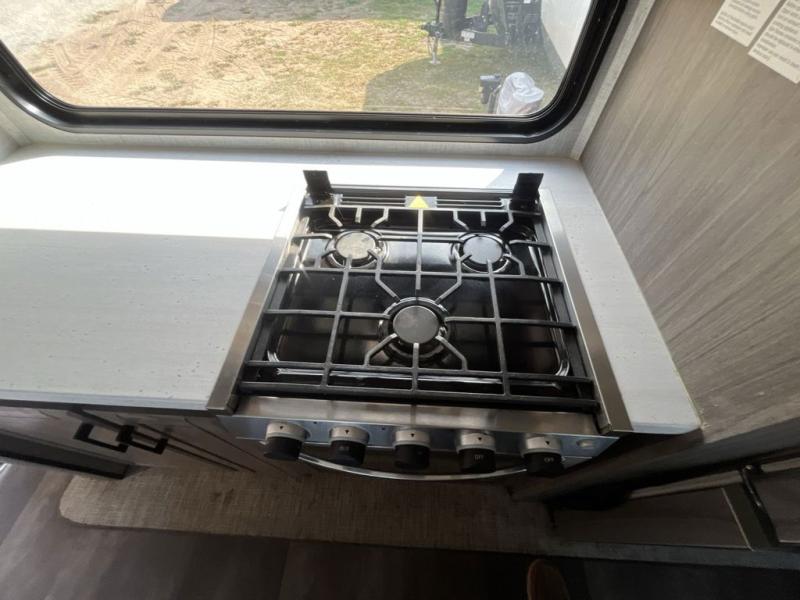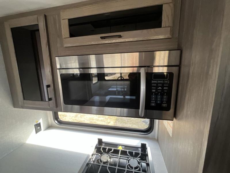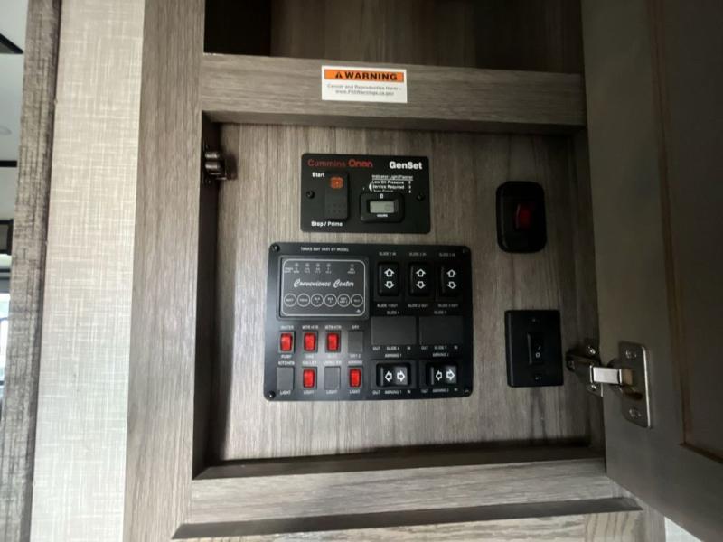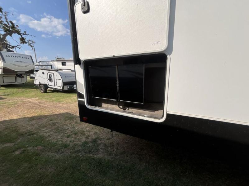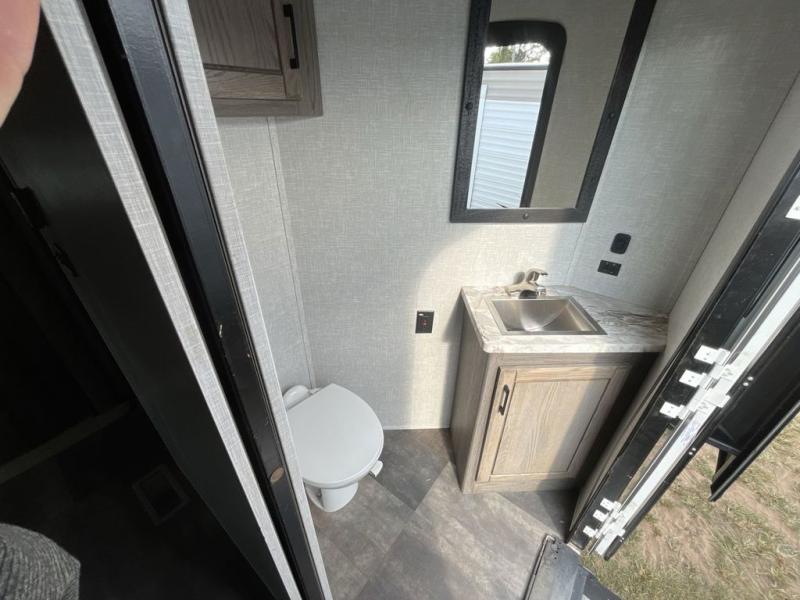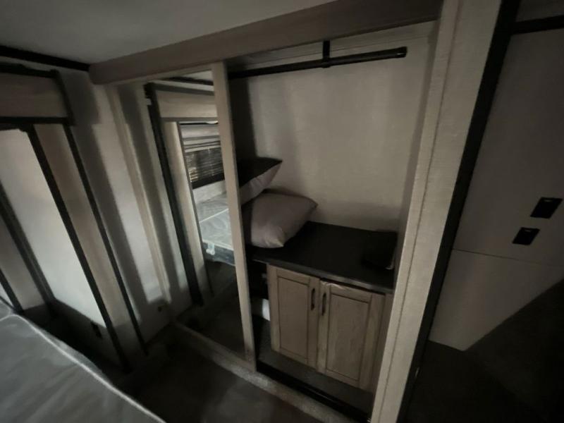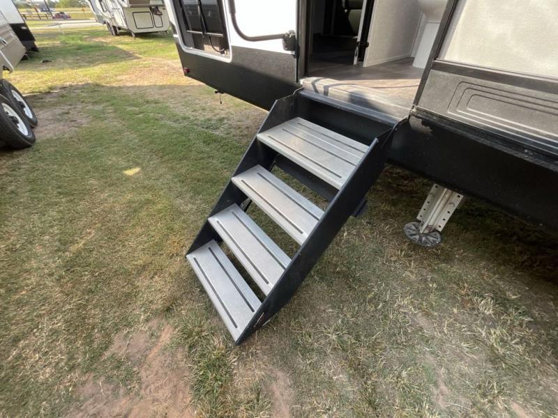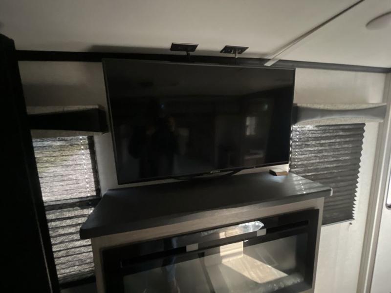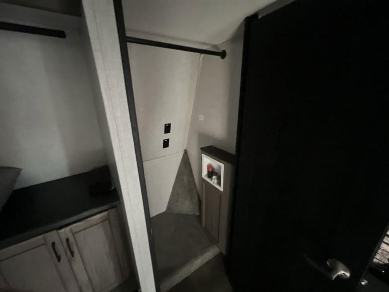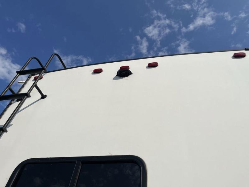 With dual entry doors, everyone can easily access this fifth wheel! One of the entrances leads directly into the half bathroom attached to the rear bedroom which has a tri-fold sofa slide and wardrobe below a 54" x 74" loft bunk matt. The chef can prepare their best home cooked meals either indoors with the Furrion kitchen collection and the kitchen island or at the outside kitchen with a refrigerator and griddle. Enjoy your meals together at the dinette with two chairs on one side and bench seating on the other side. The dual entry bathroom has a 48" shower with a seat to freshen up in each morning and a dual sink vanity for two to get ready at once, plus it enters into the front private bedroom. You will feel right at home in the bedroom with the king bed slide across from the dresser with a fireplace and 39" TV, and the front closet with a shoe shelf and an area prepped to add an optional washer and dryer!