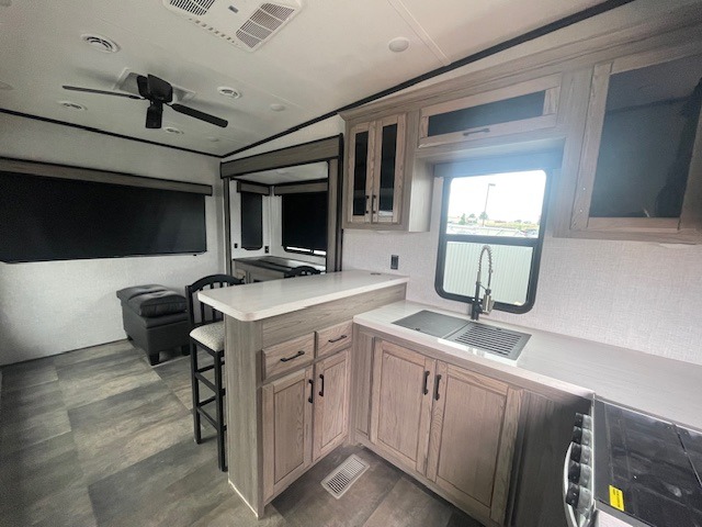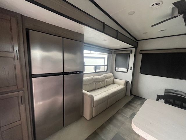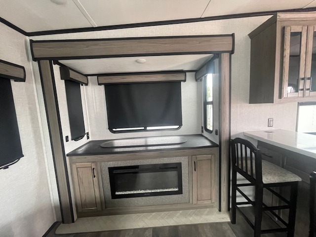 Start camping in true luxury with this fifth wheel! The rear living area has a tri-fold sofa with ottoman storage to keep extra blankets, a ceiling fan for a cool breeze on a hot summer day, and an entertainment center with a 50" TV with lift and a fireplace. The Furrion collection kitchen overlooks the living area and has a bar top with bar stools to enjoy your morning coffee. Freshen up each morning in the dual entry bathroom with the 48" shower with a seat, glass doors, and a domed skylight to add natural lighting as you get ready. The front private bedroom has a king bed slide across from a dresser with a fireplace and a 39" TV and a front closet with a shoe shelf and pullout hamper, plus an area next to the closet that is prepped to add an optional washer and dryer!