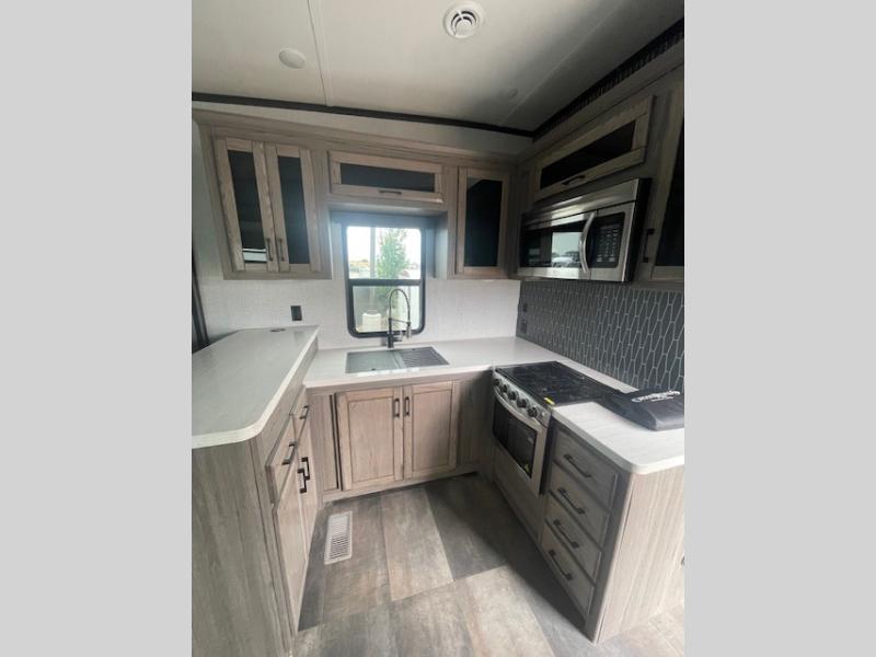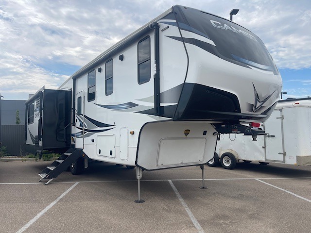 Every element of your home has been considered when creating these CrossRoads RV Cameo fifth wheels! From the oversized pantries, master suites, and full size theater seats with heat and massage to durable construction with the largest I-beam chassis in the industry. They also have the industry's first front windshield, an aerodynamic profile, and a full walk-on roof with an Alpha Ply II roof material. These modern fifth wheels were created with the customer in mind which is why they have convenient features like pass-through heated storage, spacious walk-in closets, an AM/FM/Bluetooth sound bar, a 6-point hydraulic auto level, and a 2" receiving hitch with 4-way plug. The Twice Is Nice package adds even more comforts like dual fireplaces for cozy evenings inside, dual awnings to protect you rain or shine, dual A/C units to keep you cool on those hot summer days, and dual wireless charging stations so your electronics can be at 100%. Come find the right model for you!