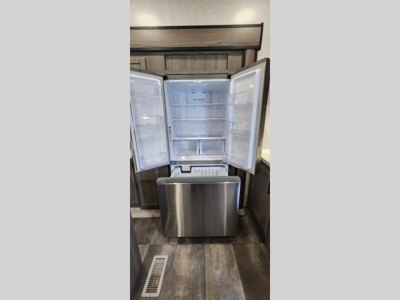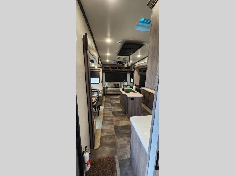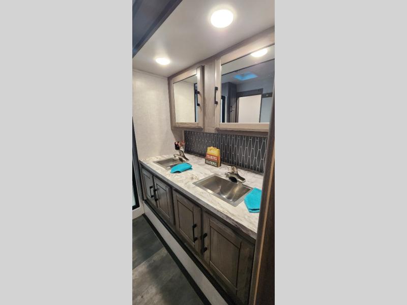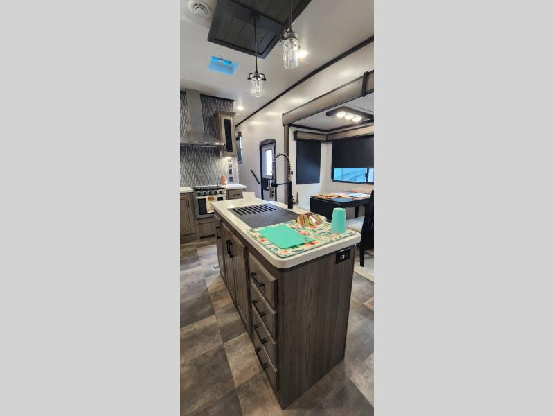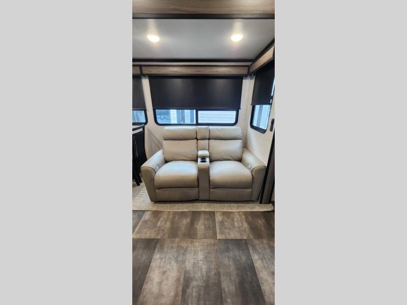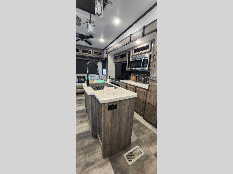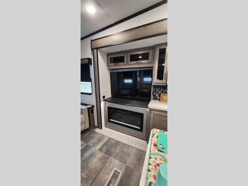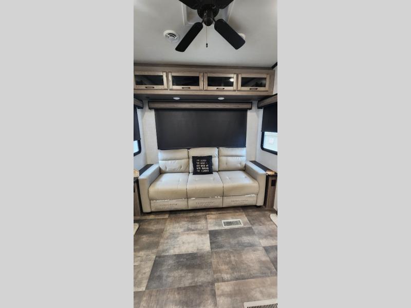 Comfort and luxury abounds throughout this fifth wheel! Starting with the dual entry bathroom which has a dual sink vanity for two to get ready at once, a 48" shower with a seat, and leads directly into the front private bedroom. Inside the bedroom is a comfortable king bed slide across from a 39" TV with a fireplace below, a dresser, and a front closet with a shoe shelf and prepped to add an optional washer and dryer. The chef can prepare their best home cooked meals with the Furrion kitchen collection and the kitchen island will make clean up easier with the stainless steel sink basin and high rise faucet with pull out spray hose. Eat your meals and play card games a the dinette then relax on either the rear tri-fold sofa or the power theater seating across from the entertainment center with a fireplace and a 50" TV to watch your favorite movies!