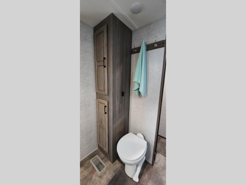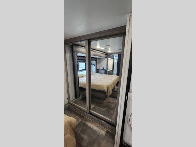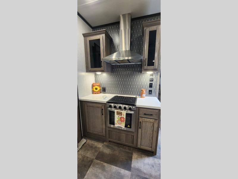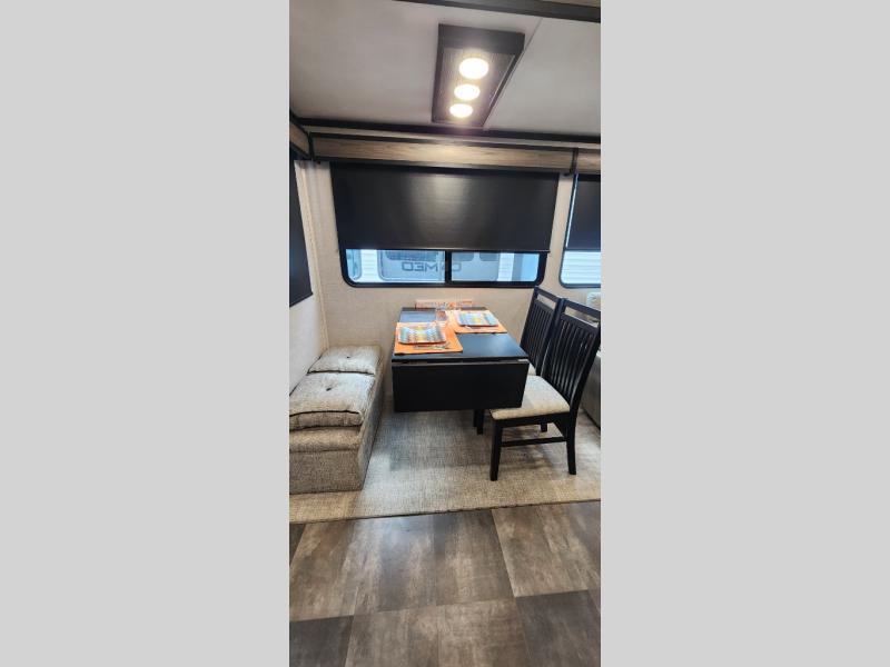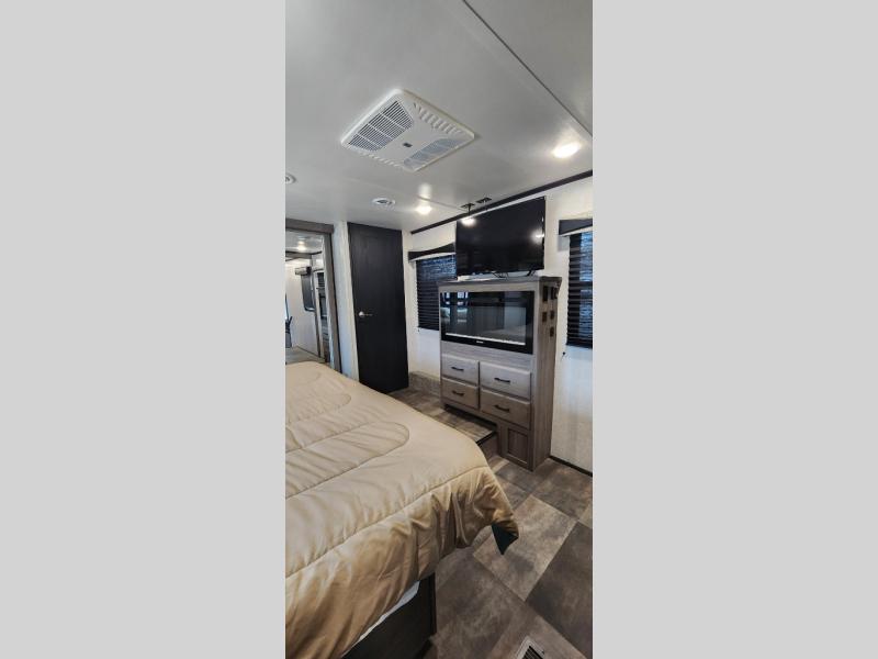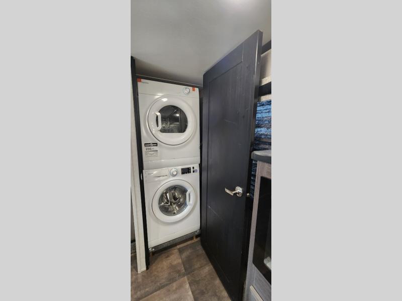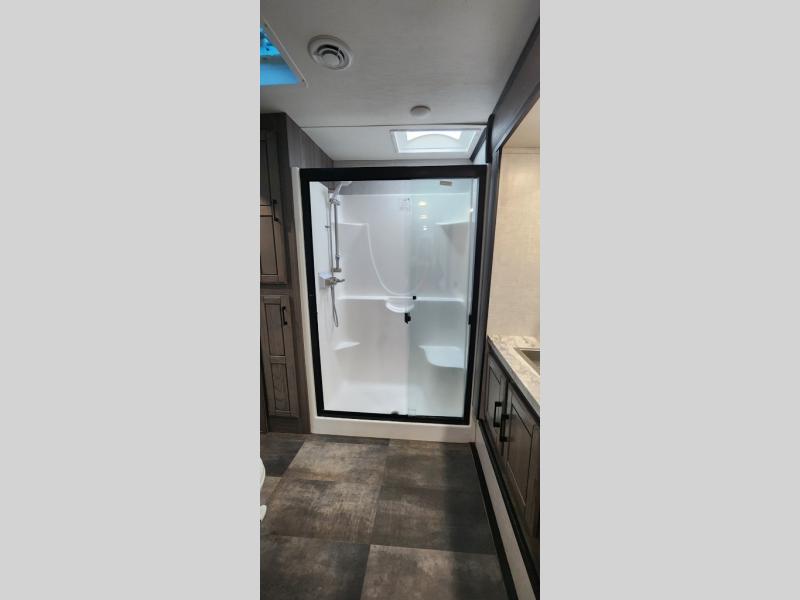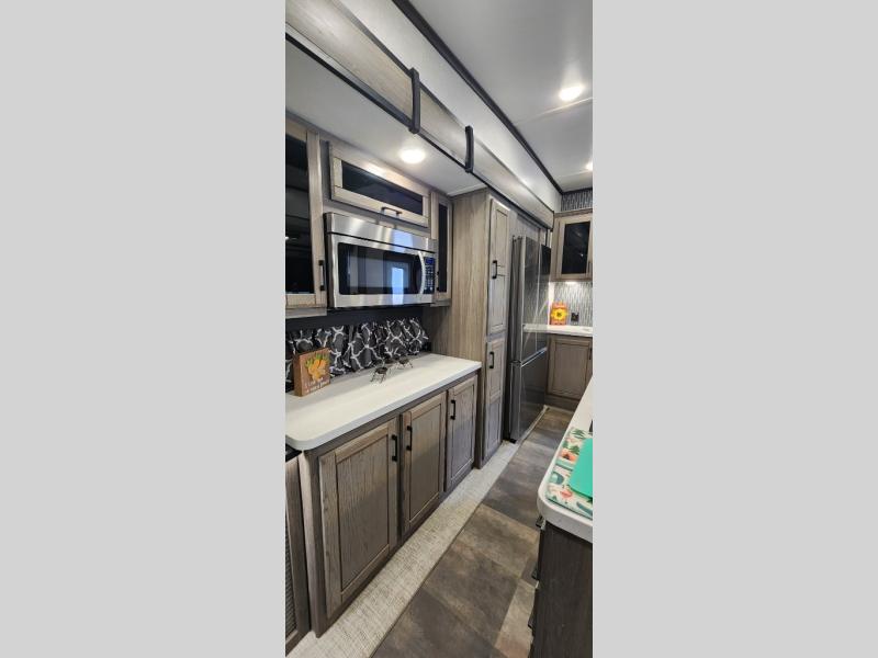Comfort and luxury abounds throughout this fifth wheel! Starting with the dual entry bathroom which has a dual sink vanity for two to get ready at once, a 48" shower with a seat, and leads directly into the front private bedroom. Inside the bedroom is a comfortable king bed slide across from a 39" TV with a fireplace below, a dresser, and a front closet with a shoe shelf and prepped to add an optional washer and dryer. The chef can prepare their best home cooked meals with the Furrion kitchen collection and the kitchen island will make clean up easier with the stainless steel sink basin and high rise faucet with pull out spray hose. Eat your meals and play card games a the dinette then relax on either the rear tri-fold sofa or the power theater seating across from the entertainment center with a fireplace and a 50" TV to watch your favorite movies!