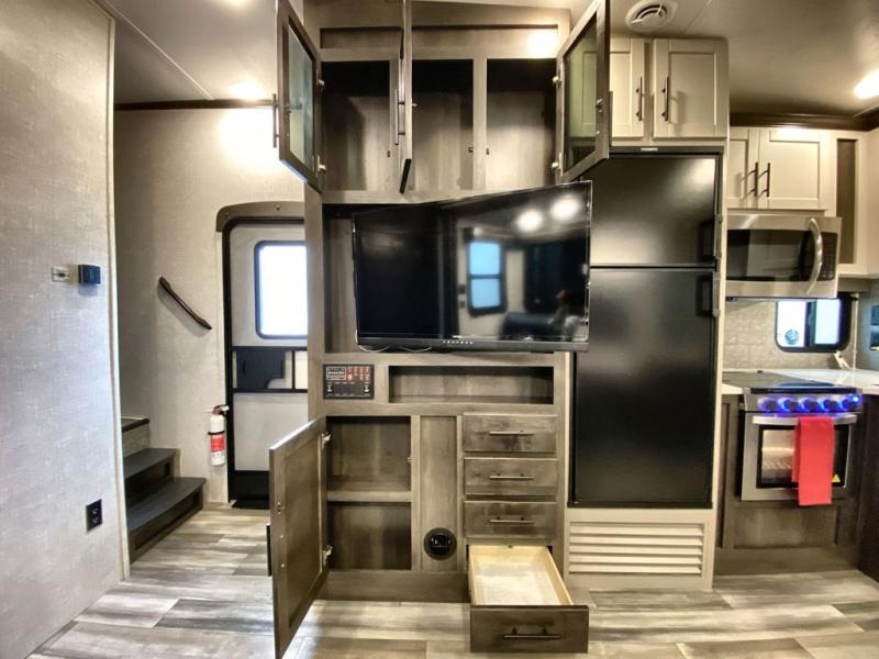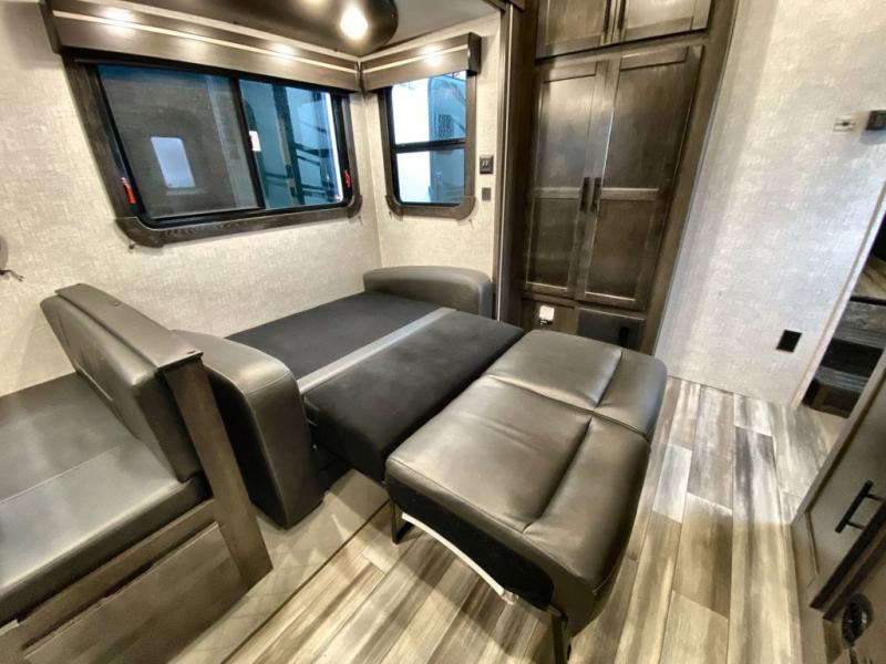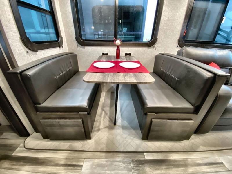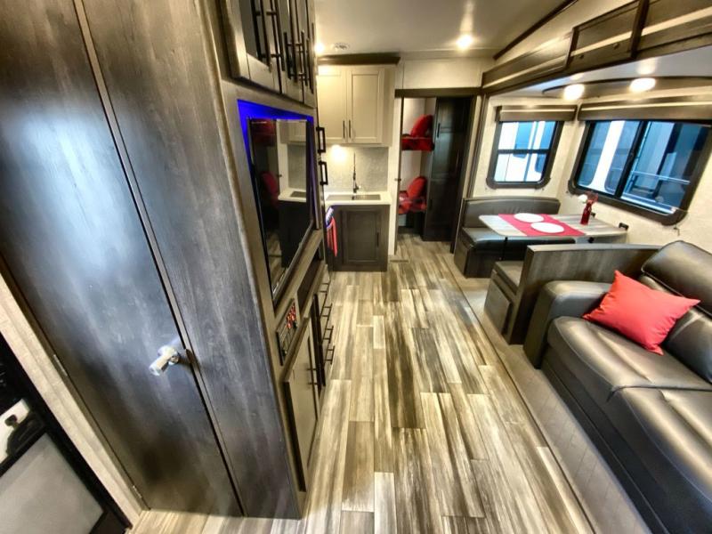 What makes a fifth wheel great? Spacious living areas, abundant sleeping space, and convenient features; you'll find them all in this unit! The little ones or your friends are sure to love the double-size bunks, plus there is storage under the bunks with outside access for convenience. The large slide out in the main living area provides the chef of the family space to cook a meal, or they may want to cook on the outside kitchen if the weather is nice. You will appreciate your seating options in this model, including the optional table and chairs in place of the booth dinette, and the optional theatre seating in place of the tri-fold sofa. Everyone can clean up in the full bath each day, and the front private bedroom with a king bed will feel just like home!