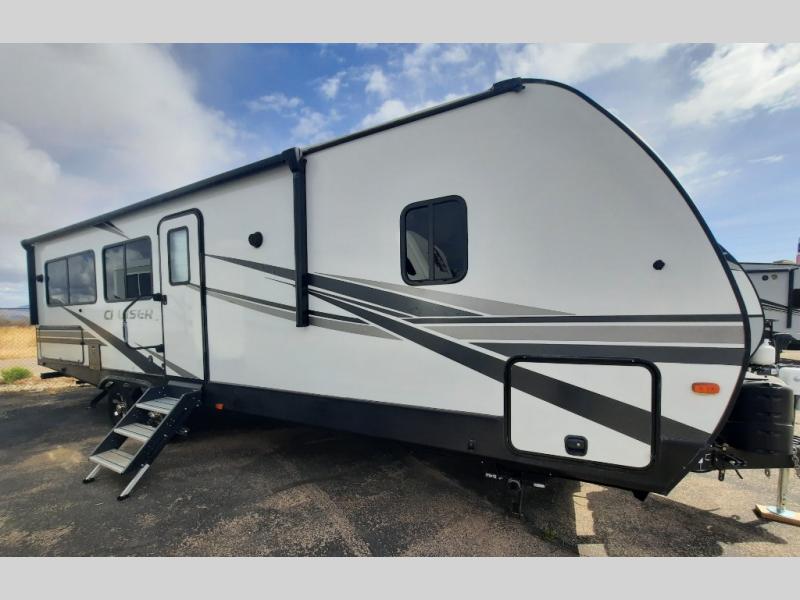 Each one of these CrossRoads RV Cruiser Aire fifth wheels and travel trailers have high end features incorporated into them! Some of these features include a Secure Stance entry step, pass-through storage with magnetic slam latch doors to keep your gear stored safely, and electric awnings with LED lights to highlight the good times at night. Their construction consists of a one piece seamless super flex roof, a five sided aluminum construction, and an aerodynamic painted front cap for an easier tow. Stay connected where ever you go with the HD digital TV antenna with Winegard Wifi prep. The luxurious interiors are filled with at home comforts like Chef Collection appliances, full trunk storage under the king bed, and fireplaces depending on the model. Come find the perfect one for you and your family today!