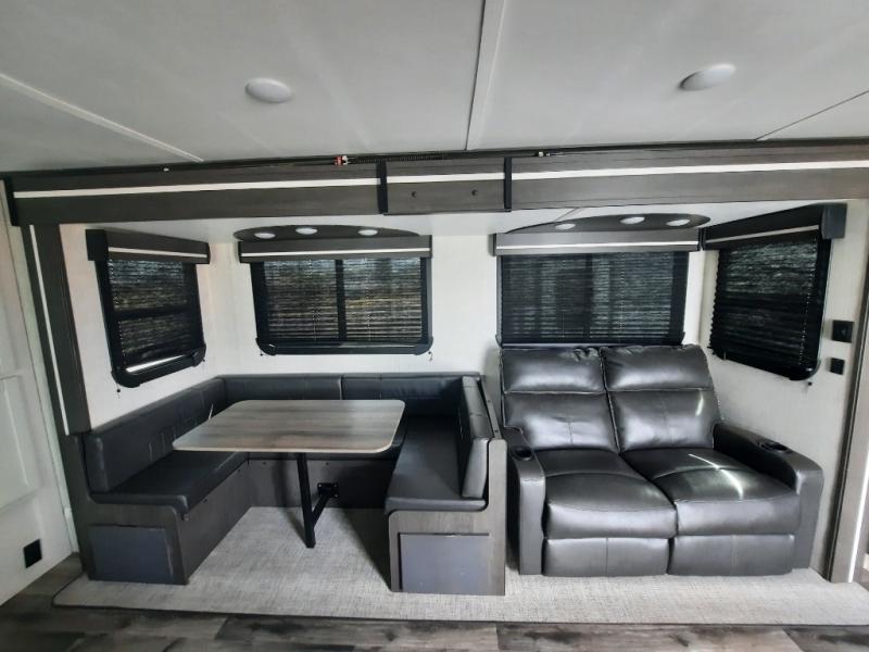 If you've been wanting to leave your old tent-camping days behind, take a look at this comfortable travel trailer. Within the large slide out you will find the U-shaped dinette and tri-fold sofa that will be perfect for meal times, game night, and sleeping space for guests. The rear kitchen is packed with convenient features, such as a wine fridge, ample counter space, and a pantry to store snacks. This model includes a walk-through bath that is easily accessible from the living area or the front master bedroom, and you'll find plenty of storage space for your clean linens and necessities. This unit is also available with an optional free standing table and chairs in place of the u-shaped dinette, see 360 tour.