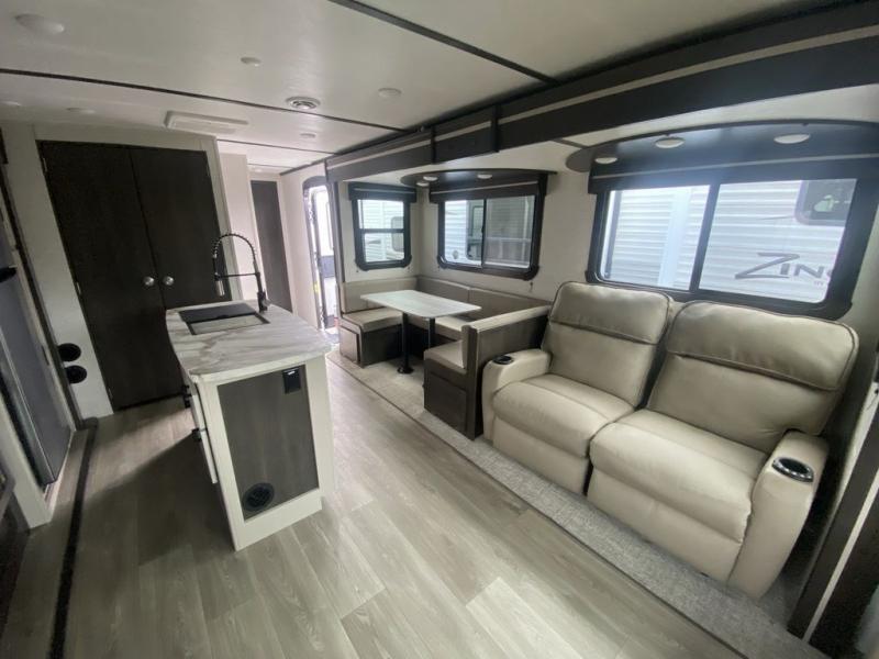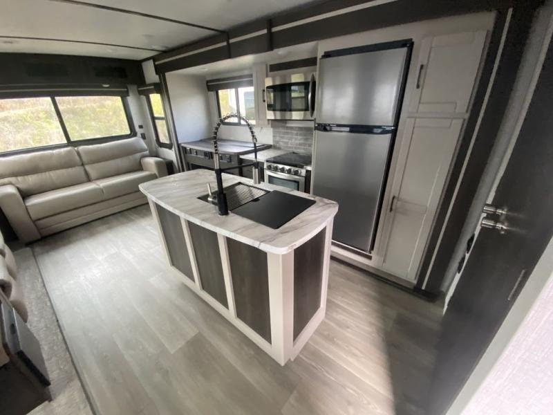Enjoy the camping lifestyle as it should be; comfortable and convenient, with high-end features as a bonus touch! The dual opposing slides will create an open floorplan, and the kitchen island will bring the whole room together. Your crew will find seating space on the tri-fold sofa, the U-shaped dinette, and the theatre seats that have a great view of the 50" TV TV lift and fireplace. You will appreciate two pantries, with one pantry including space to add an optional washer and dryer to make wash day easier than ever. The full bath includes a 30" x 36" shower with a skylight for more standing space and natural light, and the front private bedroom will provide a great night's rest with its king bed!