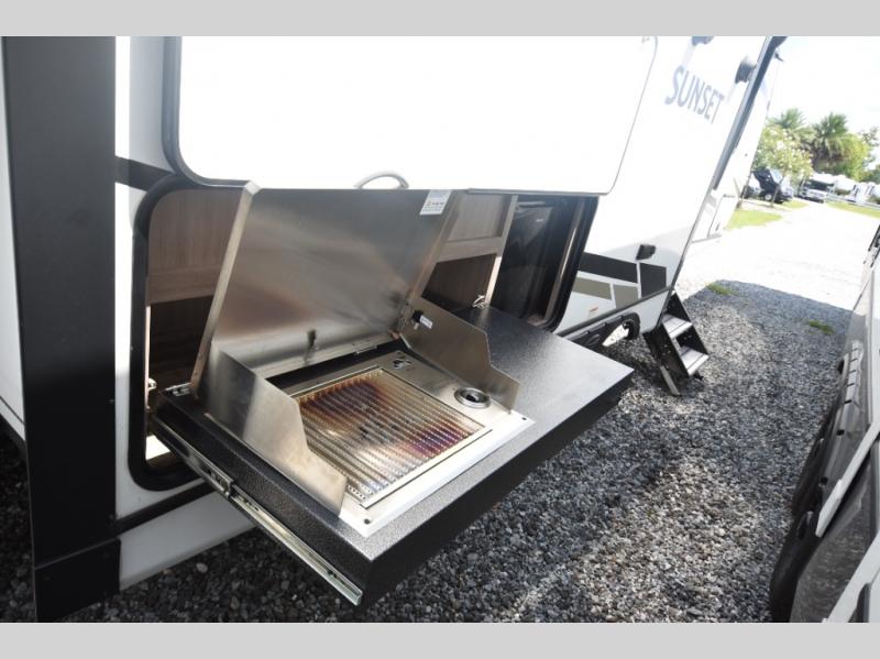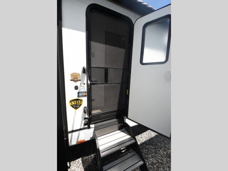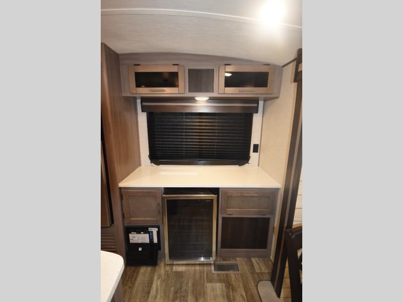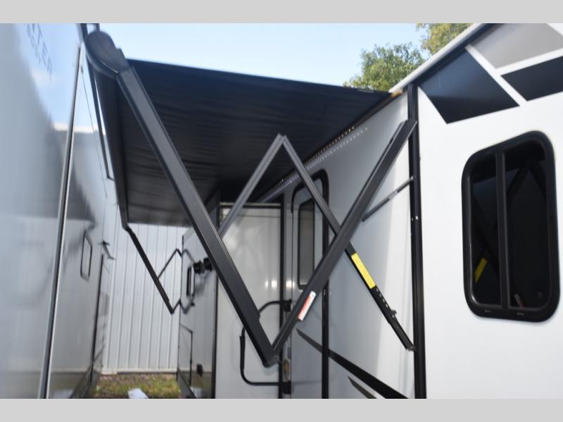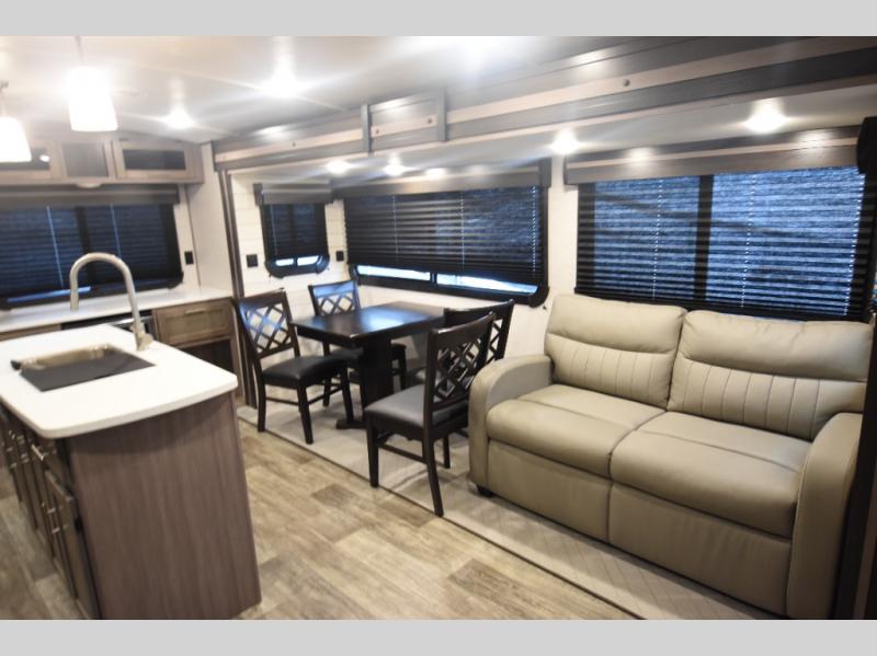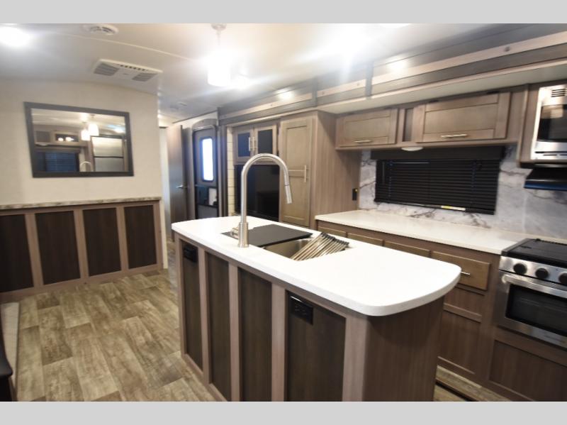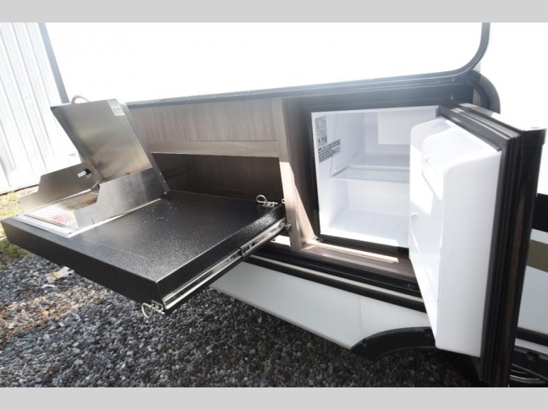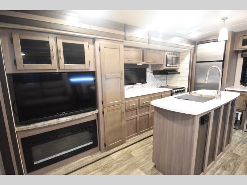 What could be more comfortable than a king bed, dual opposing slides for added space, plus an exterior camp kitchen? You will get all that and more when you choose this spacious travel trailer. The chef of the family will love the kitchen island for added space to cook and clean up, and there is plenty of rear counter space to set out fresh fruits and veggies. The tri-fold sofa sits directly across from the fireplace for a cozy evening indoors, and if you're not needing the extra sleeping space you can choose the optional theater seating in place of the tri-fold sofa. You will truly feel at home in the front private bedroom that includes a king bed, dual wardrobes, plus a third wardrobe in the closet. There is even a pet station that will make camping with your dog easier than ever!