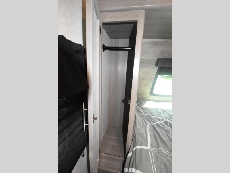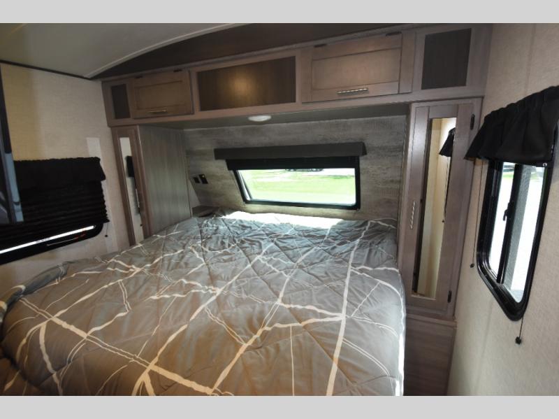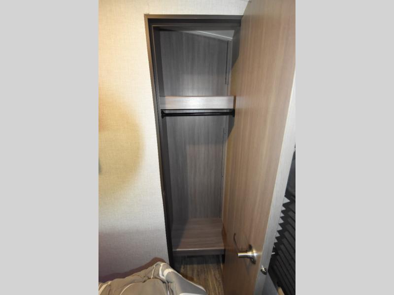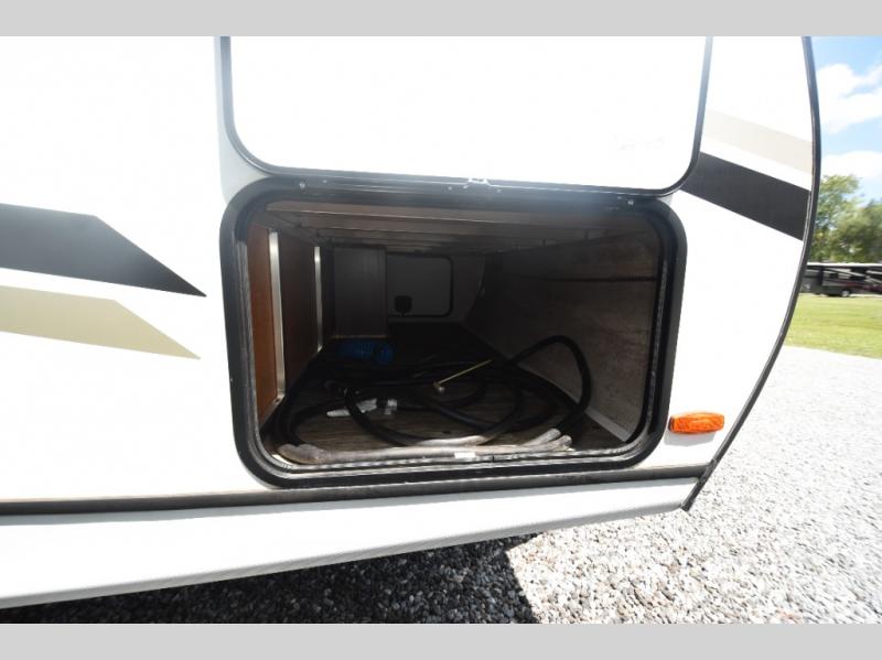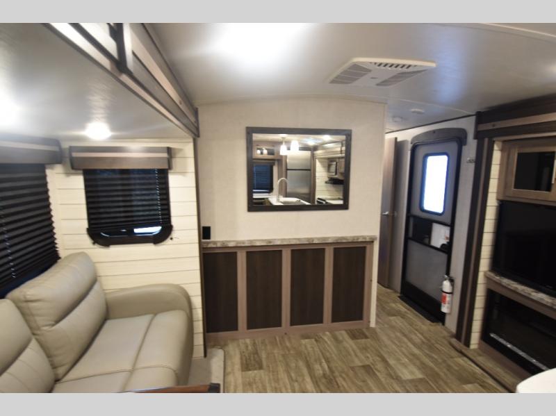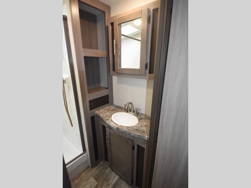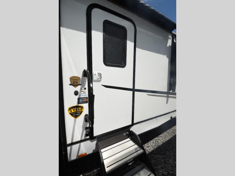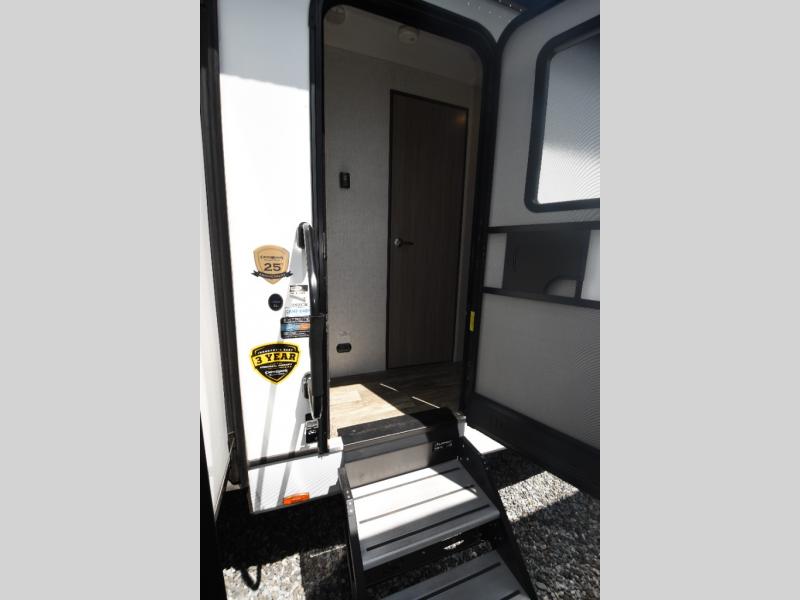 What could be more comfortable than a king bed, dual opposing slides for added space, plus an exterior camp kitchen? You will get all that and more when you choose this spacious travel trailer. The chef of the family will love the kitchen island for added space to cook and clean up, and there is plenty of rear counter space to set out fresh fruits and veggies. The tri-fold sofa sits directly across from the fireplace for a cozy evening indoors, and if you're not needing the extra sleeping space you can choose the optional theater seating in place of the tri-fold sofa. You will truly feel at home in the front private bedroom that includes a king bed, dual wardrobes, plus a third wardrobe in the closet. There is even a pet station that will make camping with your dog easier than ever!