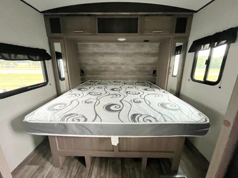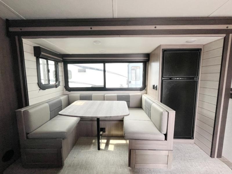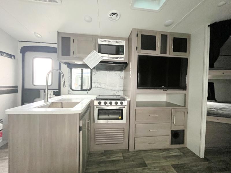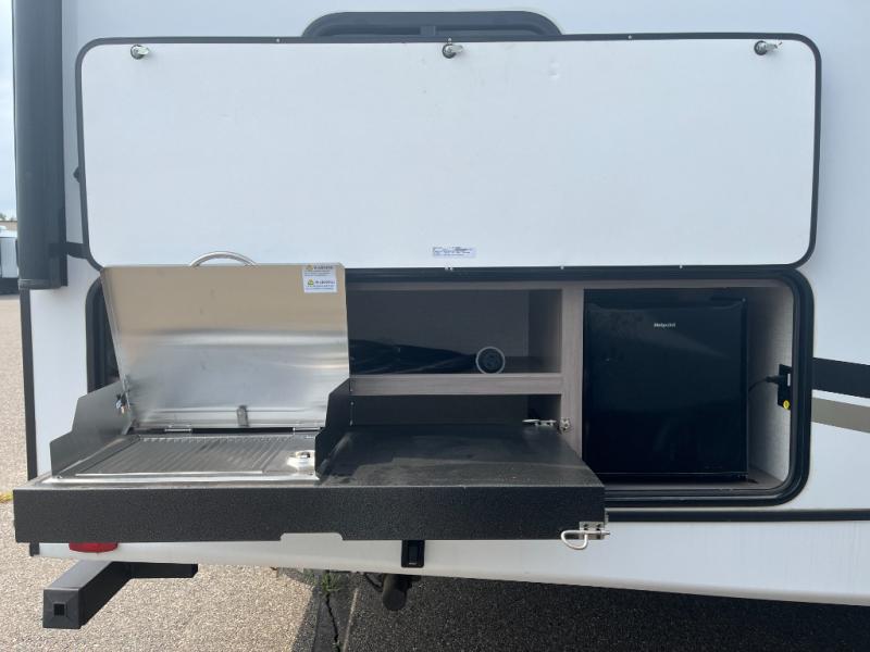 From the front private bedroom with a king bed and a slide out, to the rear corner bath and double-size bunks, you will love everything about this travel trailer. When you wake up in the morning you can prepare breakfast on the exterior camp kitchen, and if it's raining outside, the glass top range indoors will get the job done. There is also a stainless steel microwave for quick meals, and the wardrobe/pantry can store paper goods and the kids' cereal. Play a game of cards around the U-shaped dinette before heading off to bed in the front private bedroom!