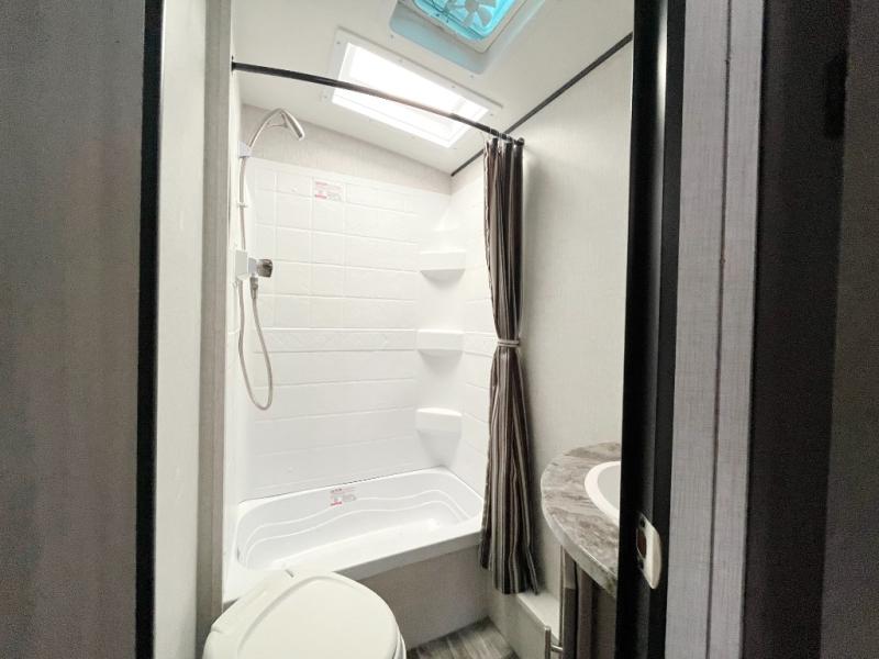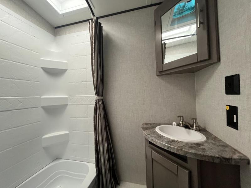 With any Sunset Trail travel trailer by CrossRoads RV, the interior offers a stainless steel farmhouse single bowl sink with a cover, solid surface countertops in the kitchen, a 12 volt refrigerator, USB ports in the bedroom and main area, and a Connexx entertainment TV with soundbar for inside enjoyment. Also included is the Extreme Weather package with maximum insulation with reflective foil, a 30,000 BTU furnace, and a 2" heat duct in the enclosed underbelly for four seasons of traveling. And the Blade Air system offers 20% more airflow and re-engineered components on the A/C. The HyperDeck flooring is water resistant, fiberglass reinforced and has polypropylene layers. Make your lightweight and comfortable RV decision today!