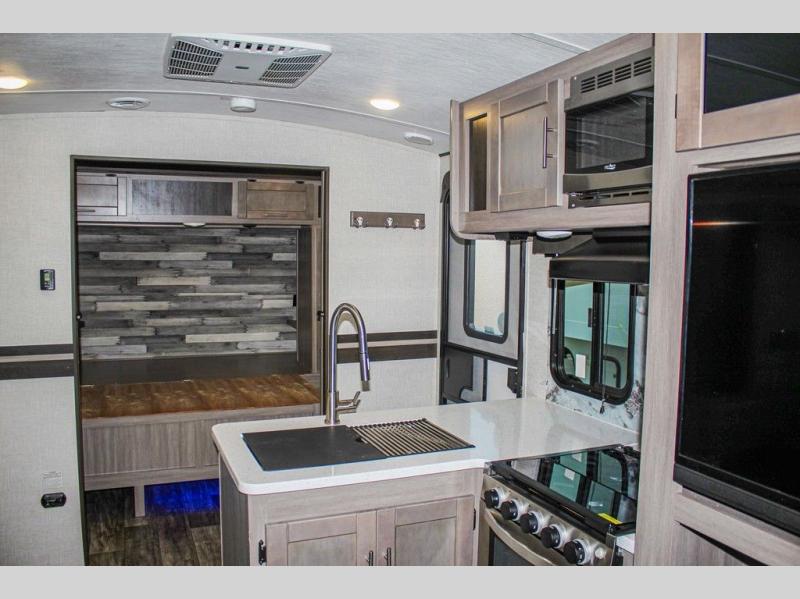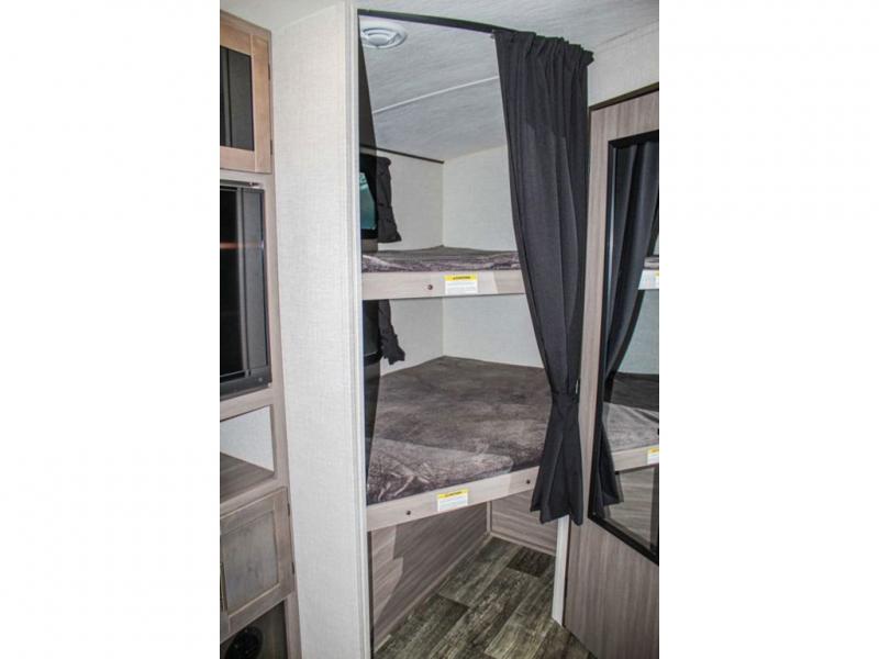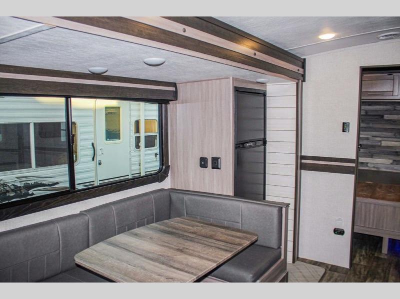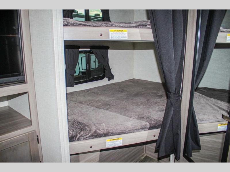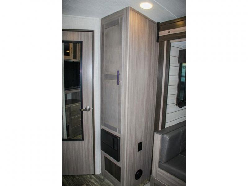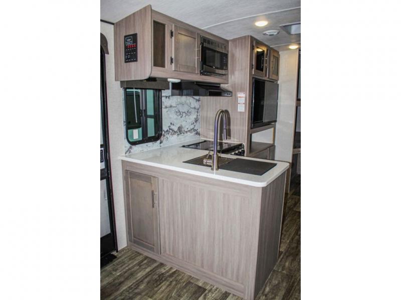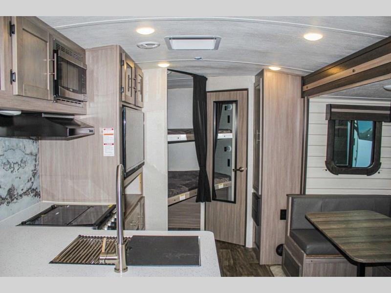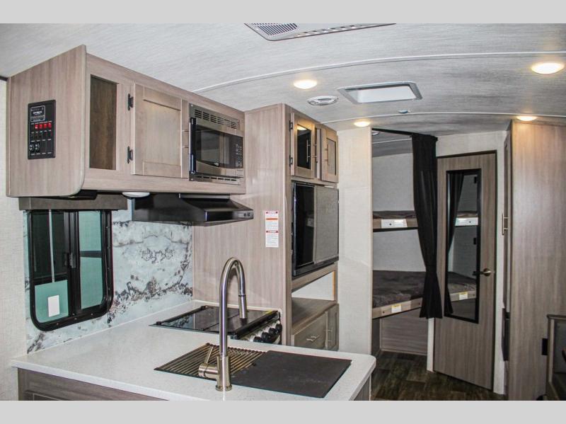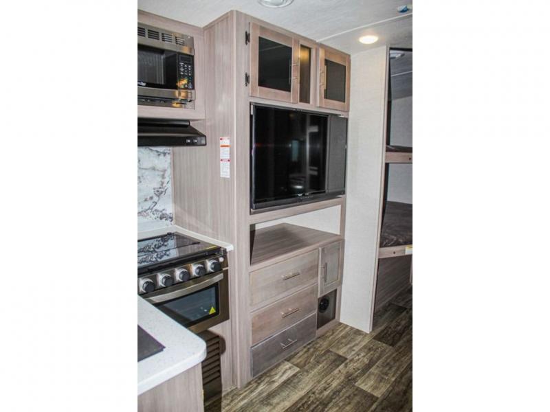 From the front private bedroom with a king bed and a slide out, to the rear corner bath and double-size bunks, you will love everything about this travel trailer. When you wake up in the morning you can prepare breakfast on the exterior camp kitchen, and if it's raining outside, the glass top range indoors will get the job done. There is also a stainless steel microwave for quick meals, and the wardrobe/pantry can store paper goods and the kids' cereal. Play a game of cards around the U-shaped dinette before heading off to bed in the front private bedroom!