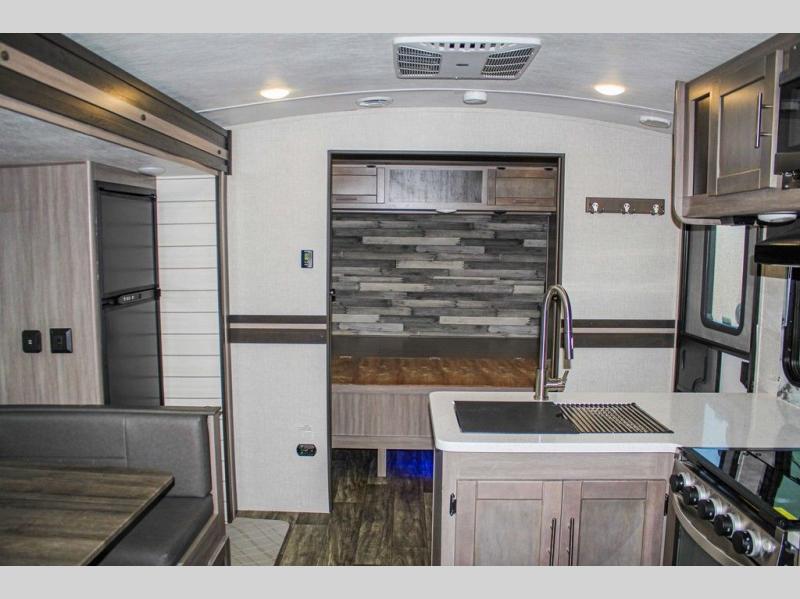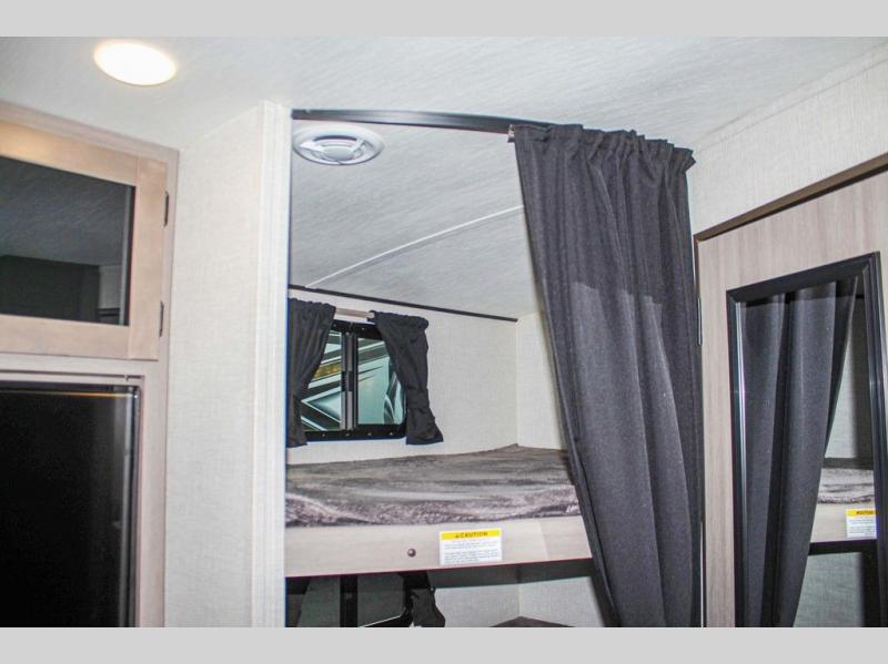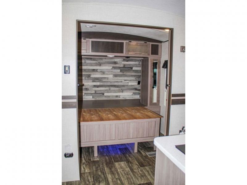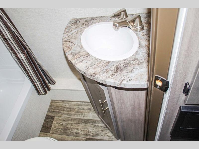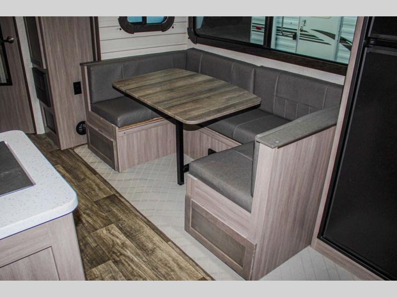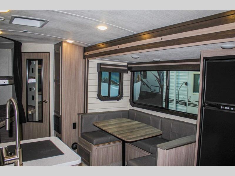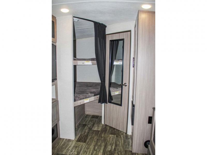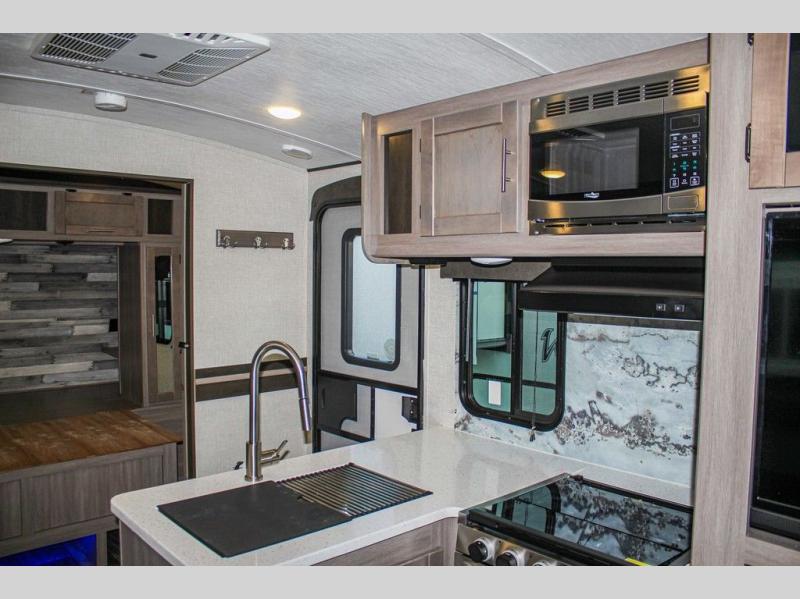 From the front private bedroom with a king bed and a slide out, to the rear corner bath and double-size bunks, you will love everything about this travel trailer. When you wake up in the morning you can prepare breakfast on the exterior camp kitchen, and if it's raining outside, the glass top range indoors will get the job done. There is also a stainless steel microwave for quick meals, and the wardrobe/pantry can store paper goods and the kids' cereal. Play a game of cards around the U-shaped dinette before heading off to bed in the front private bedroom!
