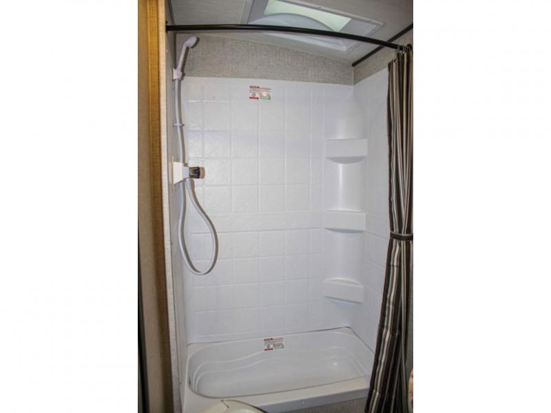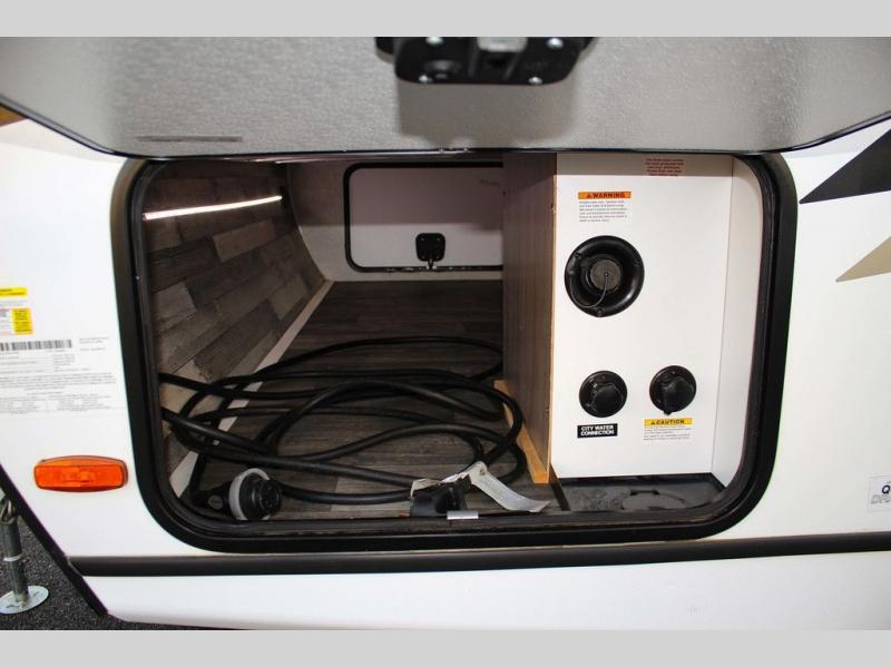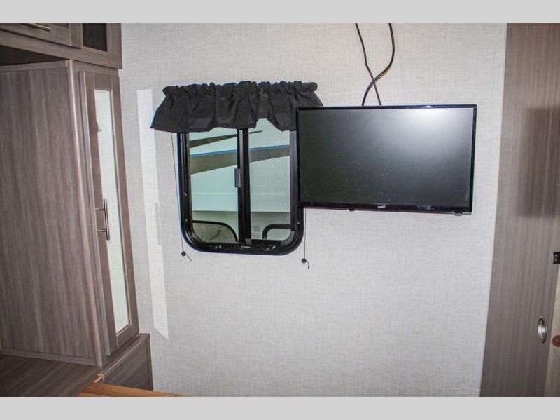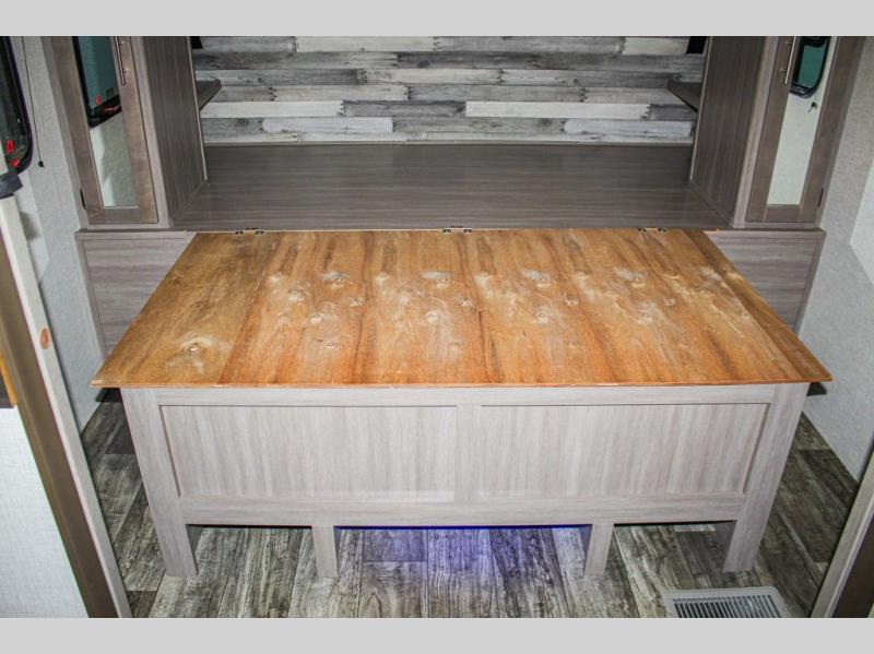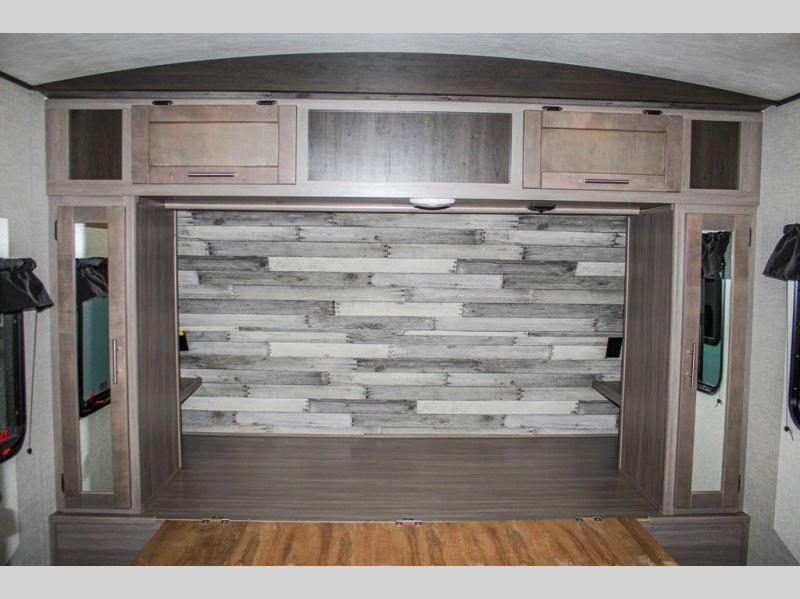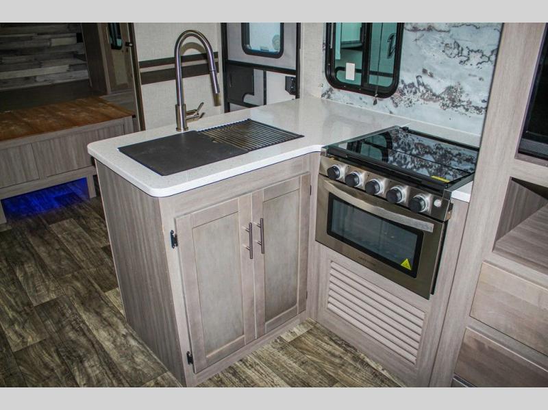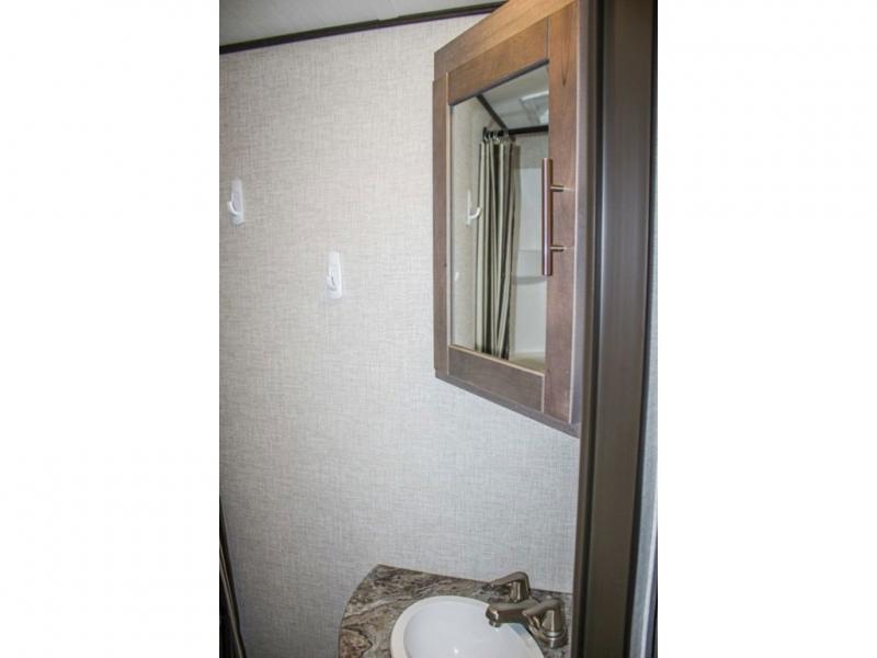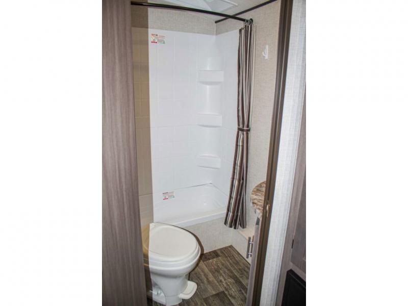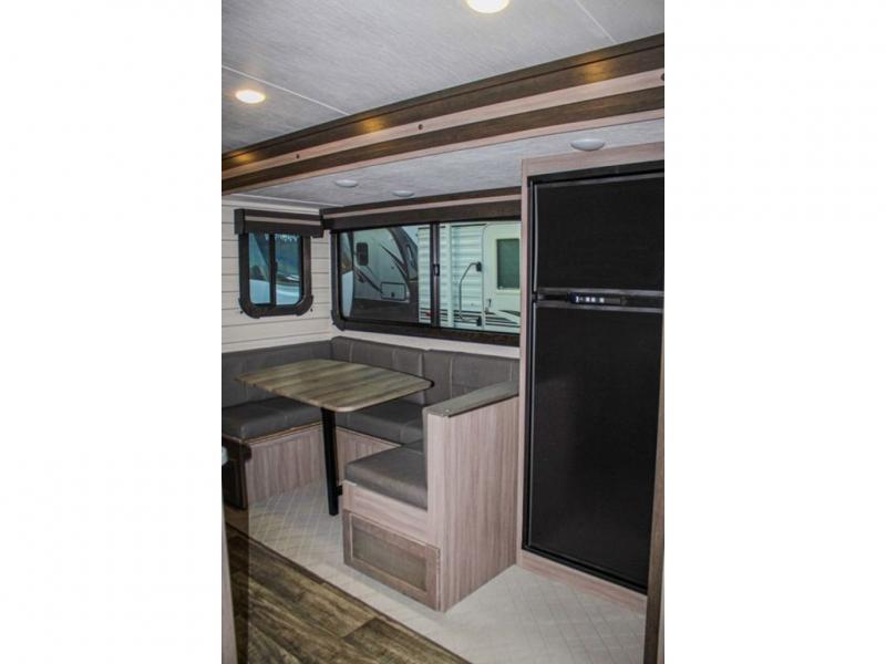 From the front private bedroom with a king bed and a slide out, to the rear corner bath and double-size bunks, you will love everything about this travel trailer. When you wake up in the morning you can prepare breakfast on the exterior camp kitchen, and if it's raining outside, the glass top range indoors will get the job done. There is also a stainless steel microwave for quick meals, and the wardrobe/pantry can store paper goods and the kids' cereal. Play a game of cards around the U-shaped dinette before heading off to bed in the front private bedroom!
