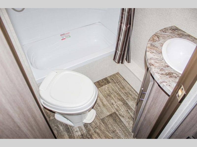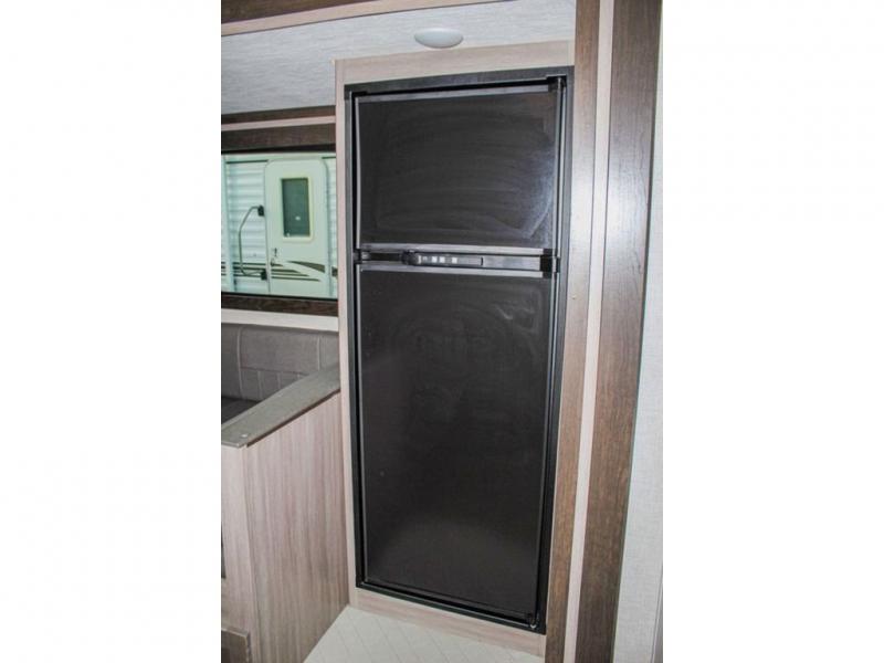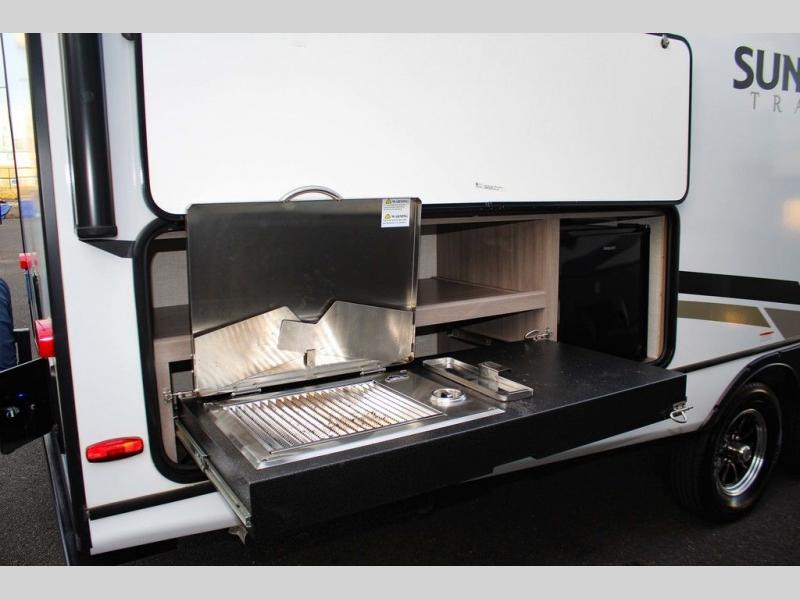 With any Sunset Trail travel trailer by CrossRoads RV, the interior offers a stainless steel farmhouse single bowl sink with a cover, solid surface countertops in the kitchen, a 12 volt refrigerator, USB ports in the bedroom and main area, and a Connexx entertainment TV with soundbar for inside enjoyment. Also included is the Extreme Weather package with maximum insulation with reflective foil, a 30,000 BTU furnace, and a 2" heat duct in the enclosed underbelly for four seasons of traveling. And the Blade Air system offers 20% more airflow and re-engineered components on the A/C. The HyperDeck flooring is water resistant, fiberglass reinforced and has polypropylene layers. Make your lightweight and comfortable RV decision today!