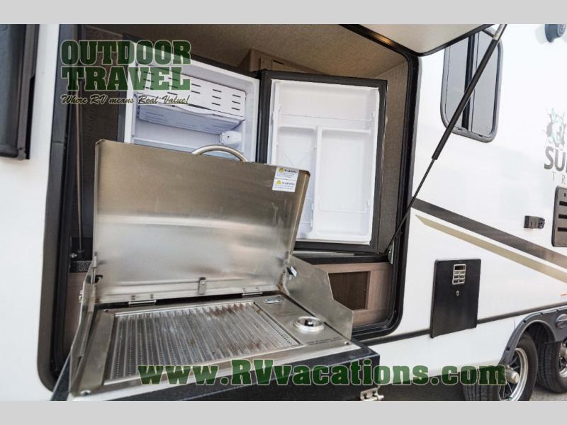 With any Sunset Trail travel trailer by CrossRoads RV, the interior offers a stainless steel farmhouse single bowl sink with a cover, solid surface countertops in the kitchen, a 12 volt refrigerator, USB ports in the bedroom and main area, and a Connexx entertainment TV with soundbar for inside enjoyment. Also included is the Extreme Weather package with maximum insulation with reflective foil, a 30,000 BTU furnace, and a 2" heat duct in the enclosed underbelly for four seasons of traveling. And the Blade Air system offers 20% more airflow and re-engineered components on the A/C. The HyperDeck flooring is water resistant, fiberglass reinforced and has polypropylene layers. Make your lightweight and comfortable RV decision today!