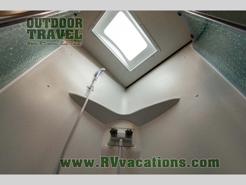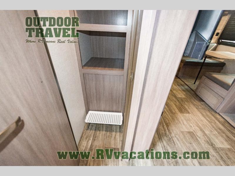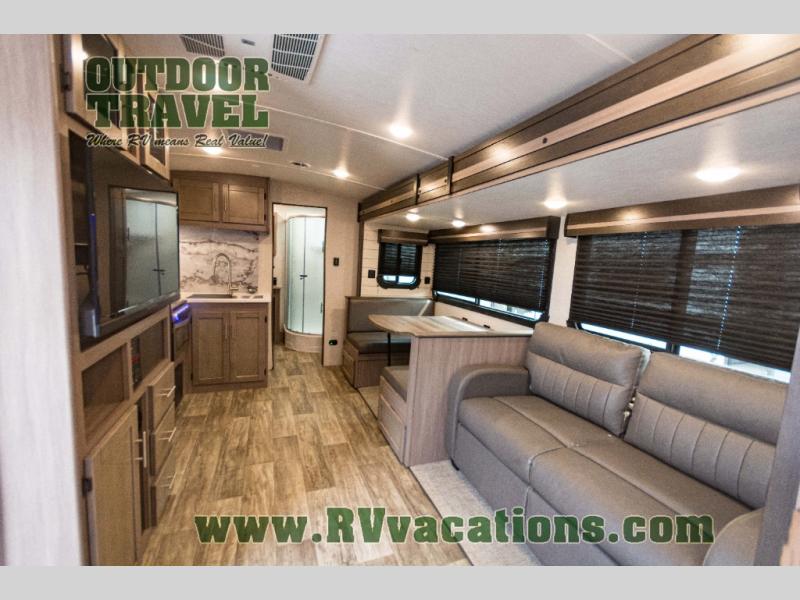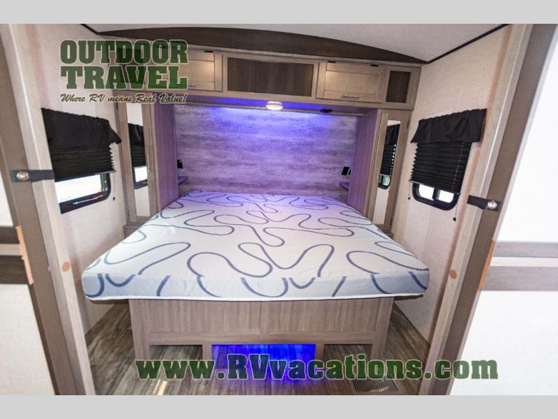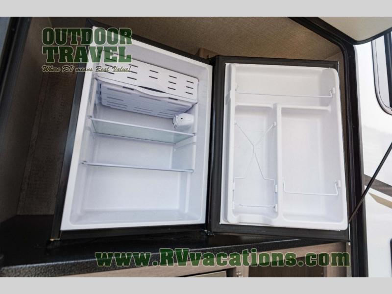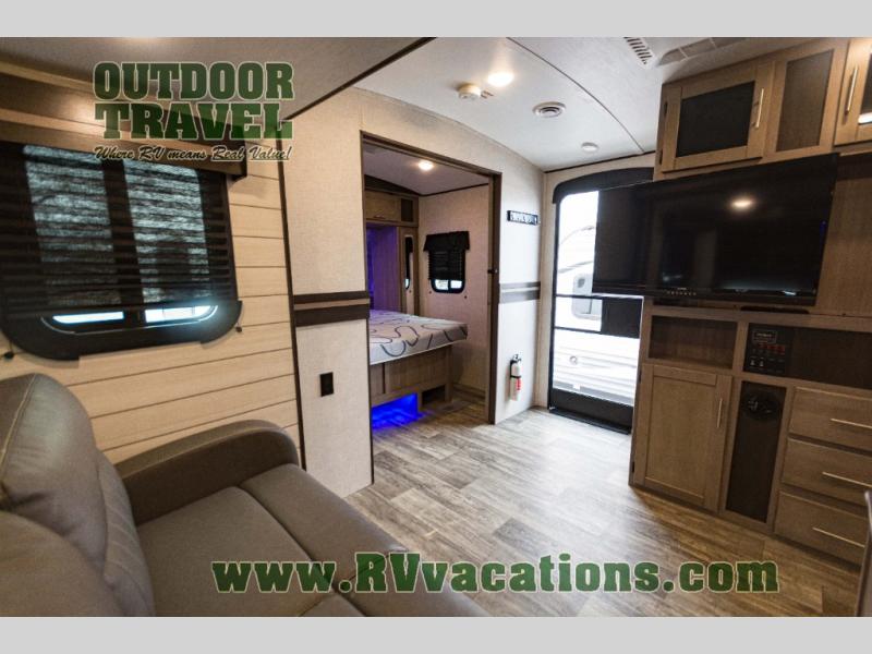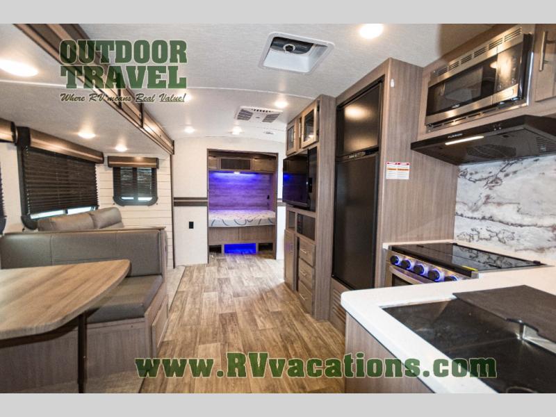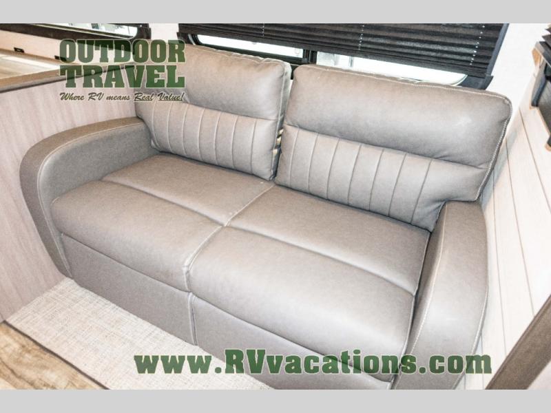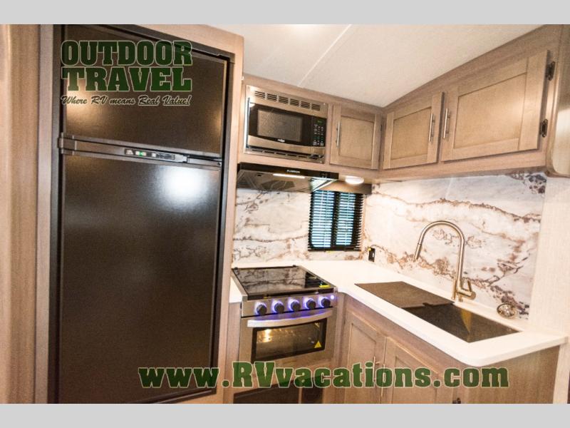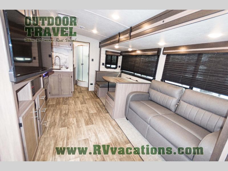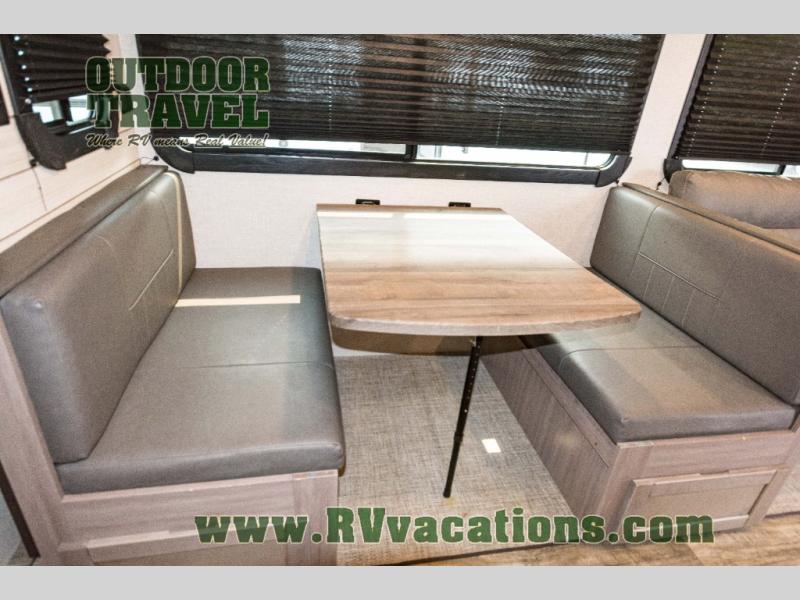 You will love the added interior space you have in this travel trailer thanks to the large slide out in the main living area. Here, you'll enjoy playing cards at the XL booth dinette and relaxing on the tri-fold sofa. Make home-cooked meals on the glass top range or use the exterior camp kitchen. There is even an exterior refrigerator for cold drinks, and the power awning will shade you from the hot summer sun. This model features a full rear bath for added privacy, and the shower skylight will allow natural light in. The front private bedroom includes a king bed, dual wardrobes, plus a shoe storage and pet station for your convenience!