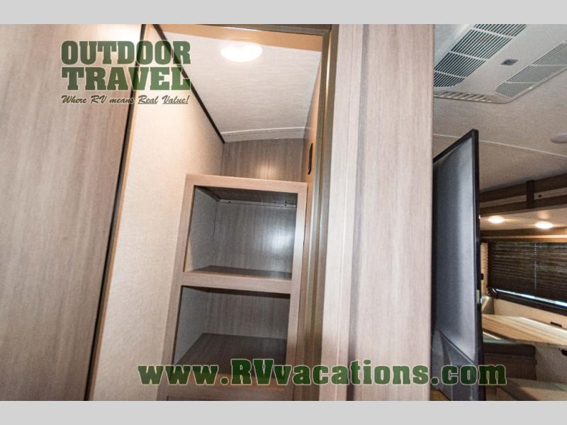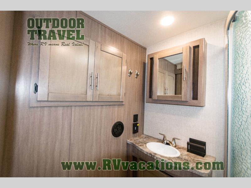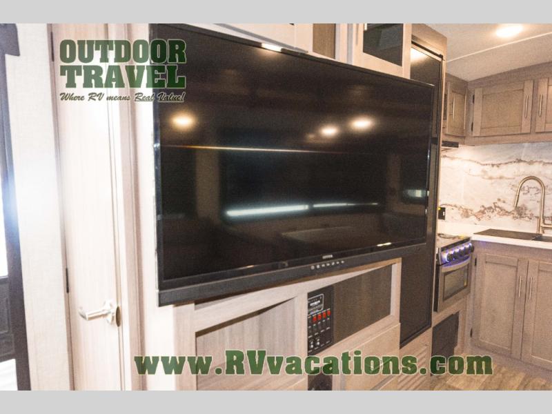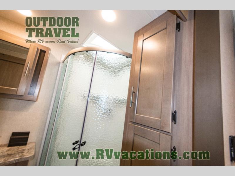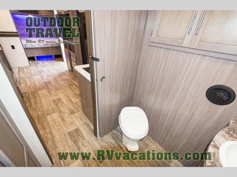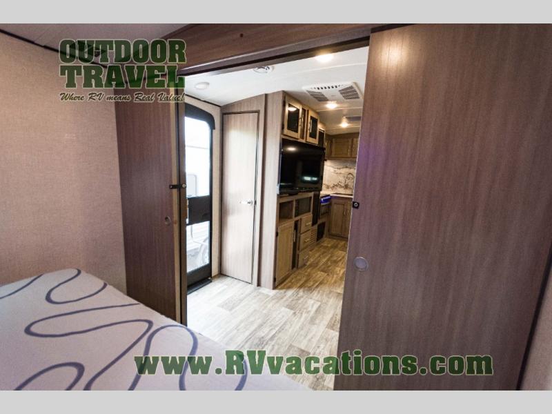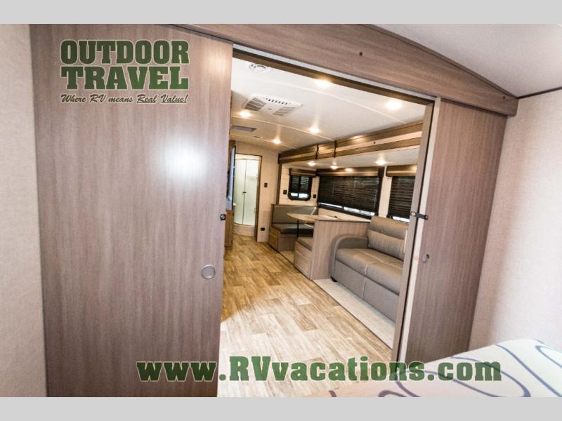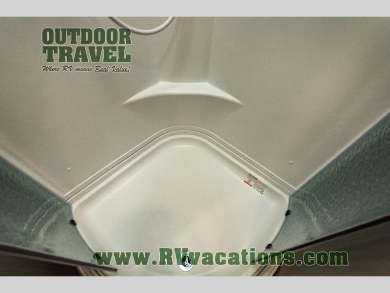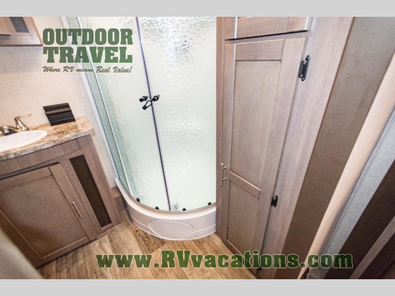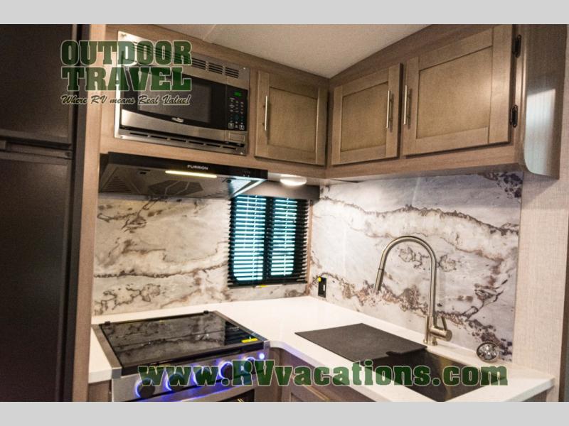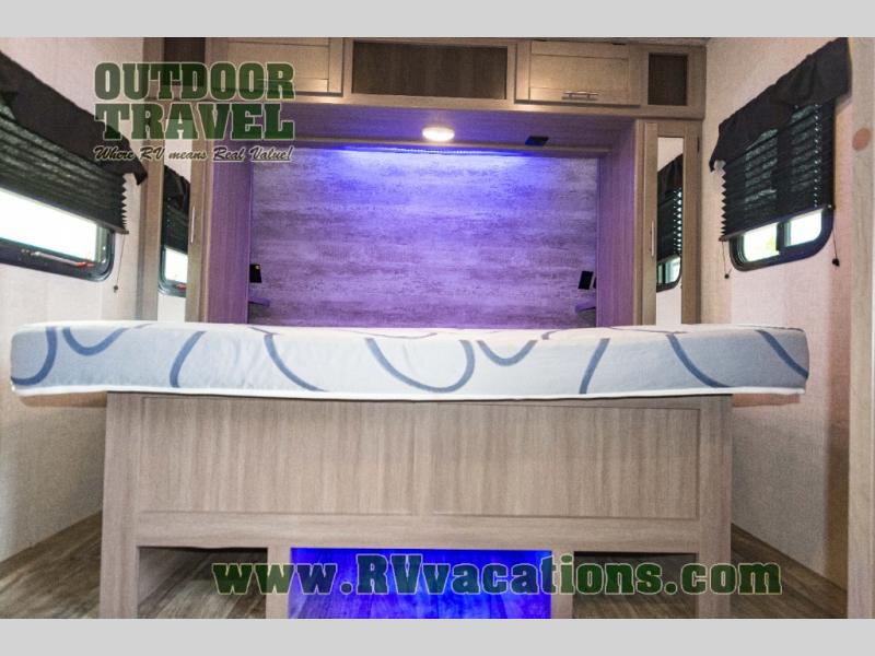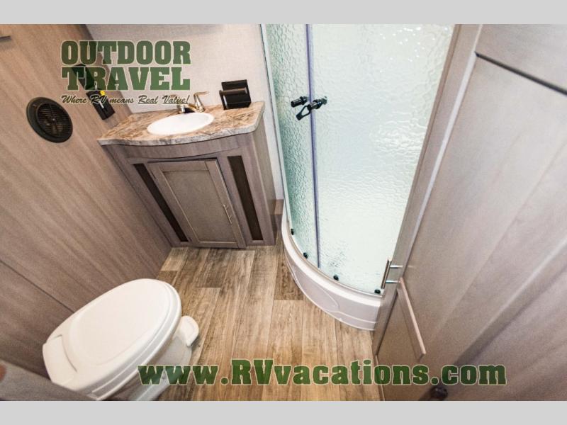 You will love the added interior space you have in this travel trailer thanks to the large slide out in the main living area. Here, you'll enjoy playing cards at the XL booth dinette and relaxing on the tri-fold sofa. Make home-cooked meals on the glass top range or use the exterior camp kitchen. There is even an exterior refrigerator for cold drinks, and the power awning will shade you from the hot summer sun. This model features a full rear bath for added privacy, and the shower skylight will allow natural light in. The front private bedroom includes a king bed, dual wardrobes, plus a shoe storage and pet station for your convenience!